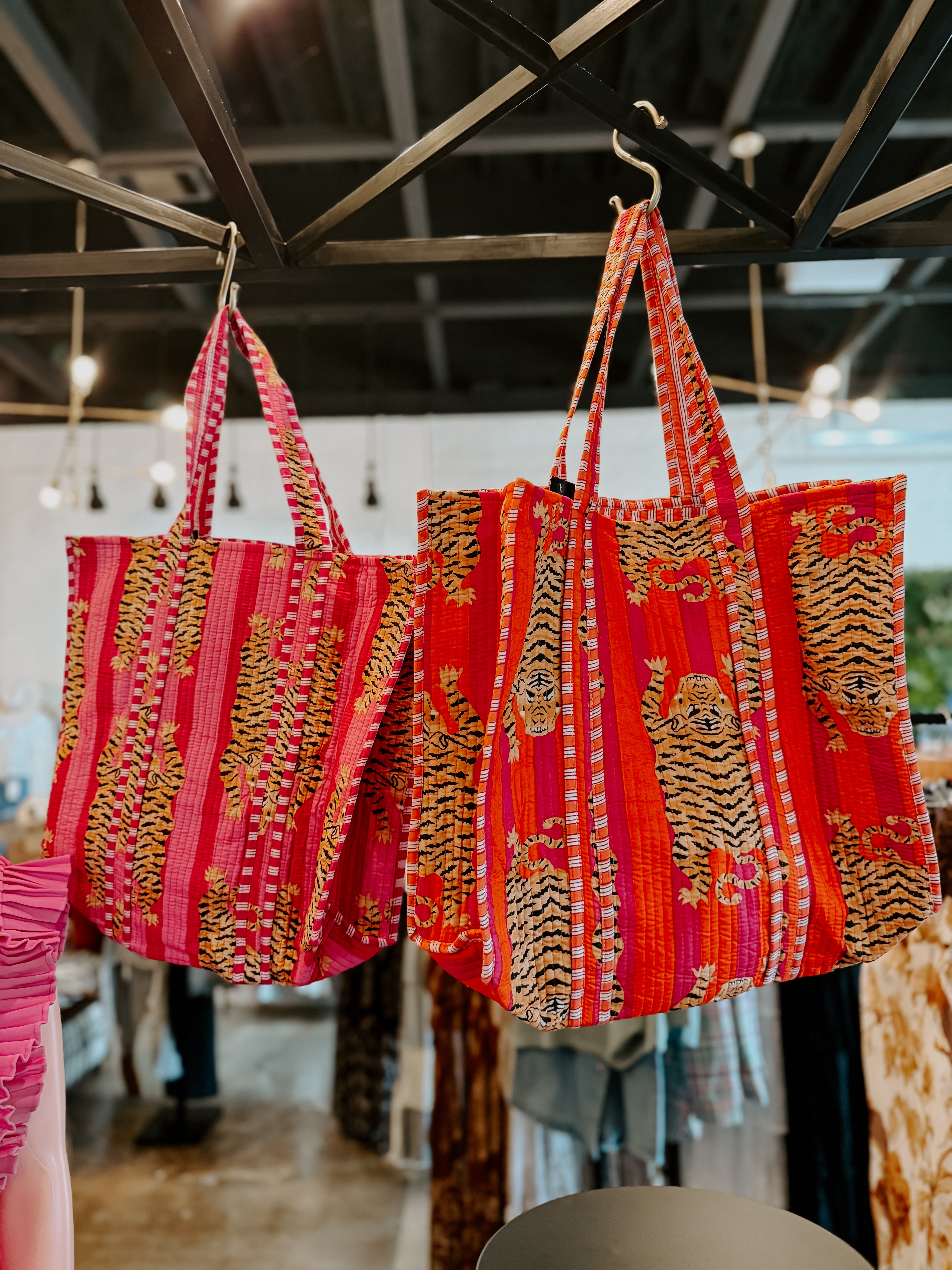 Our Quilted Tiger Bag blends playful style with practical design. Crafted from durable cotton, it’s comfy to carry and built to last. The quilted pattern not only looks great but also cushions your belongings, while a handy inner pocket keeps your small essentials within easy reach. With a roomy 18x19 inch interior and sturdy handles, this tote is ready for all your adventures, whether on your shoulder or in your hand.