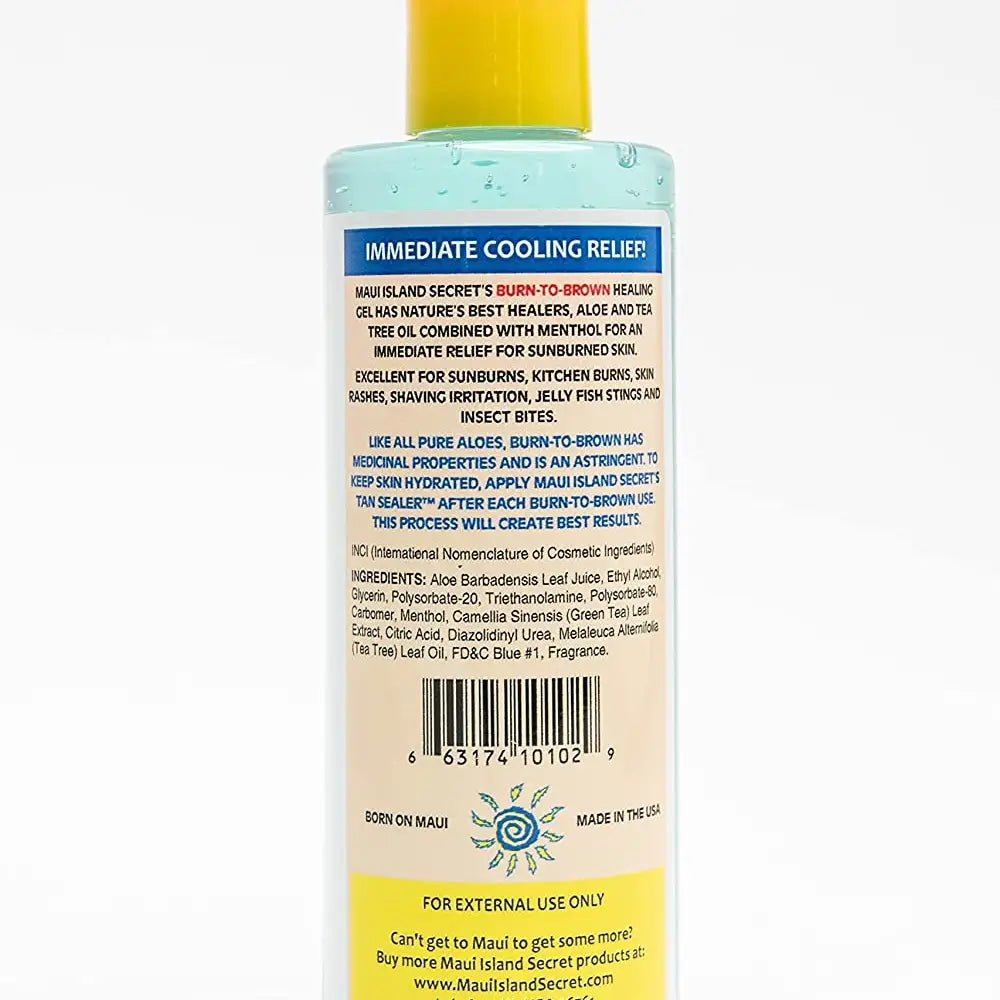 Our top selling Burn-To-Brown Sunburn Relief gel has nature's best healers, aloe and tea tree oil combined with menthol for an immediate relief for sunburned skin. Not only is this great for sunburn, it also works great for kitchen burns, skin rashes, shaving irritation, jelly fish stings and insect bites.