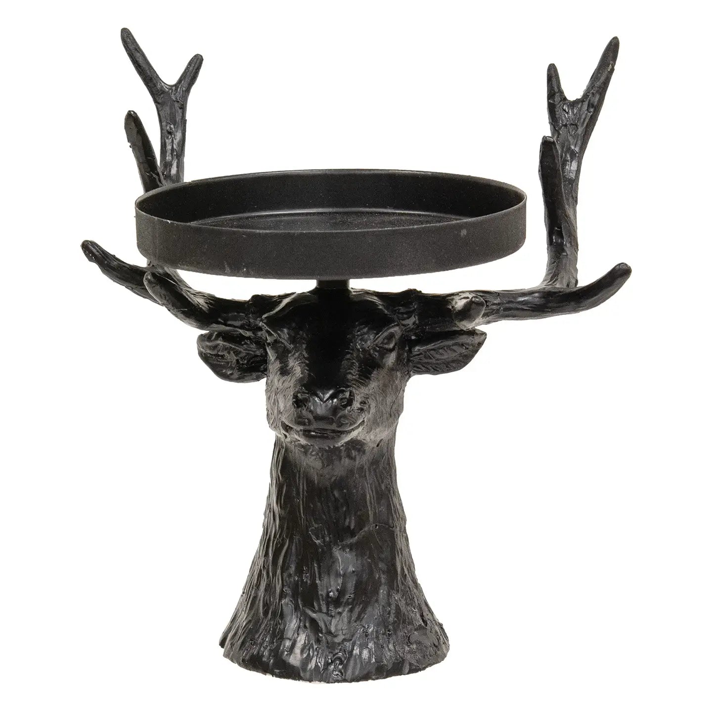 Elevate your décor with this expertly crafted Black Metal Reindeer Pillar Candle Holder. Measuring 5.5" tall, 5.25" long, and 4.25" wide, it showcases a refined deer head silhouette with intricately detailed antlers. The round plate securely holds a pillar candle, creating a sophisticated focal point that combines rustic charm with modern elegance. Ideal for enhancing any mantel, table, or shelf with warm, ambient lighting.