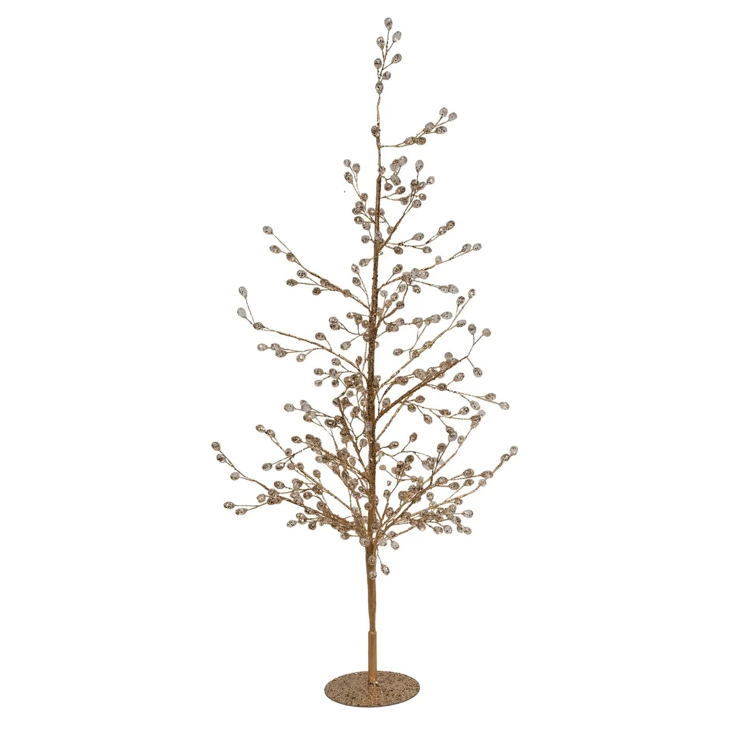 The Gold Crystal Tree combines delicate craftsmanship with sophisticated design. Standing 24 inches tall with a sturdy 3.75-inch diameter metal base, its thin wire branches offer flexibility for styling. Dusted with refined gold sparkles, the branches are embellished with circular diamond-like beads that mimic shimmering leaves. Ideal for holiday decorating with winter-themed ornaments or elegant year-round display, this piece adds a touch of understated luxury to any setting.