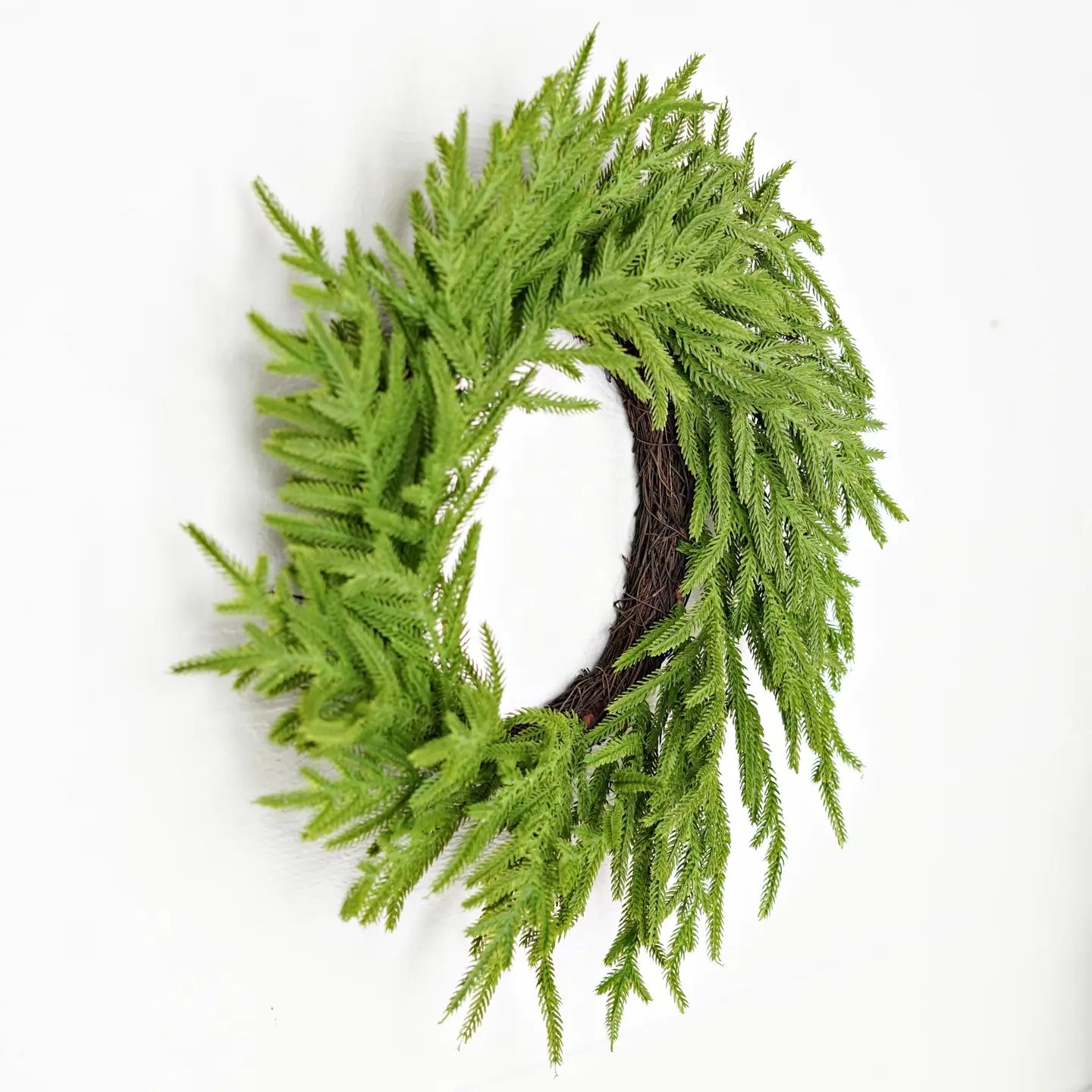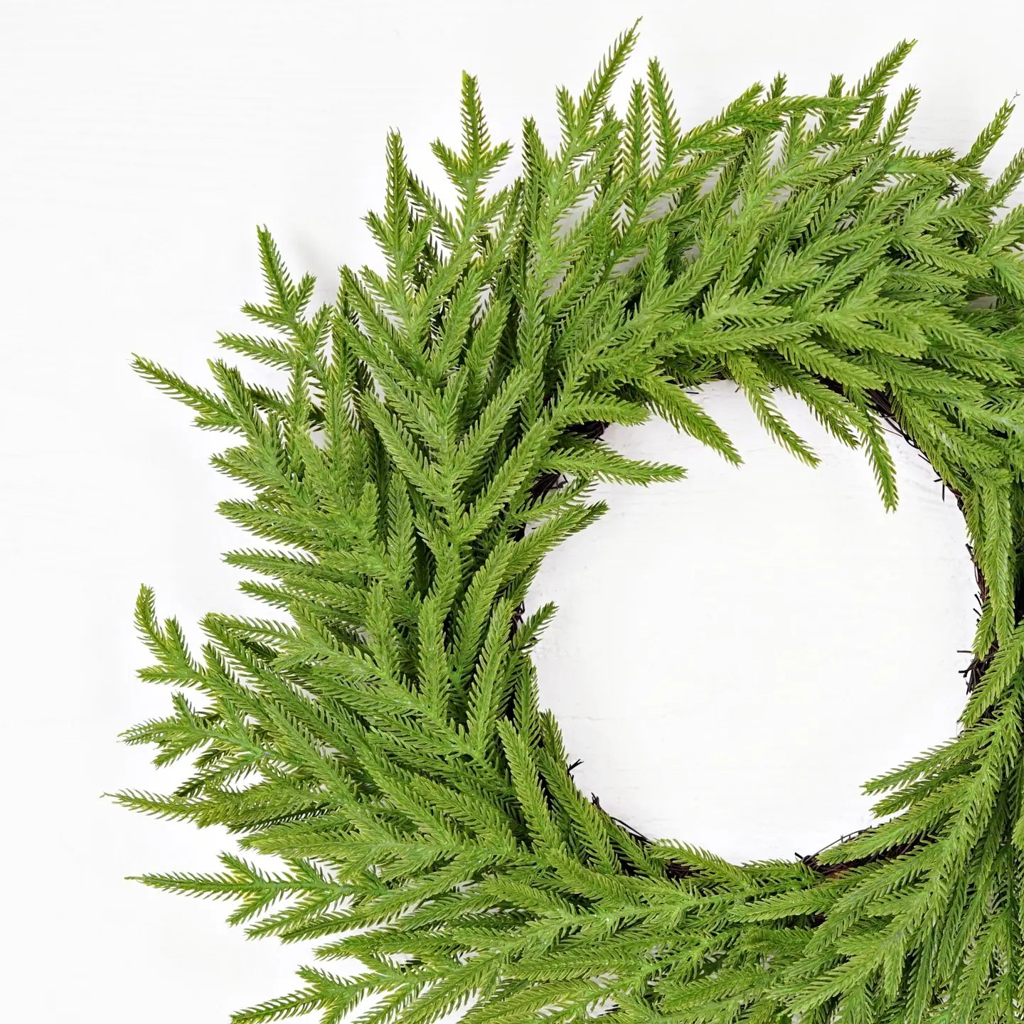 This 24-inch twig wreath features soft-touch evergreen Norfolk pine, offering a realistic and lush appearance perfect for holiday décor. Expertly crafted, it brings a natural, festive ambiance to any space without the maintenance of fresh greenery. Ideal for adding a traditional Christmas touch to doors, mantels, or walls.