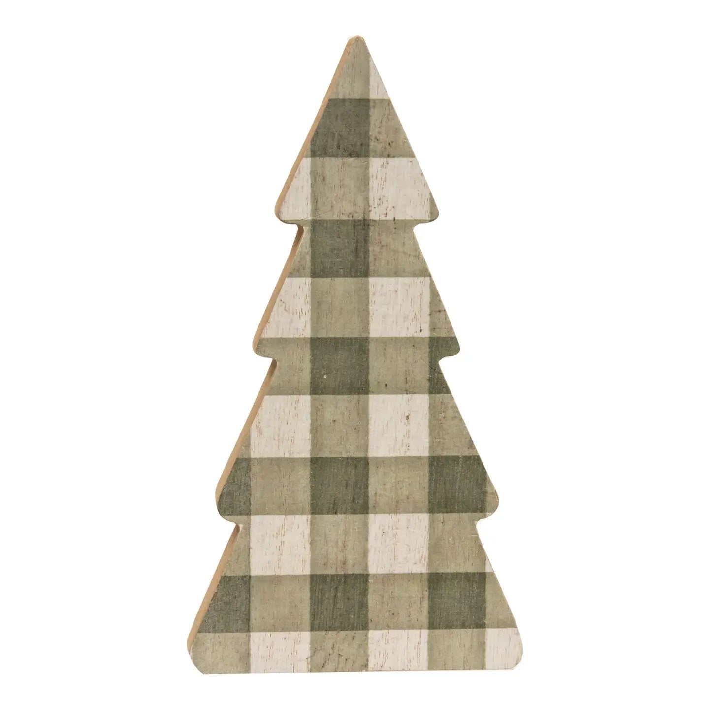 These wooden Christmas tree sitters feature a charming cut-out design with natural edges and come in green and white check, green and white polka dot, or distressed white finishes. With flat bottoms for stable freestanding display, they add a unique, handcrafted touch to holiday decor. Available in three sizes—small (3.5" x 2" x 0.75"), medium (5.25" x 3" x 0.75"), and large (7" x 3.75" x 0.75")—each tree is sold separately, allowing you to choose the perfect fit for your festive arrangements.