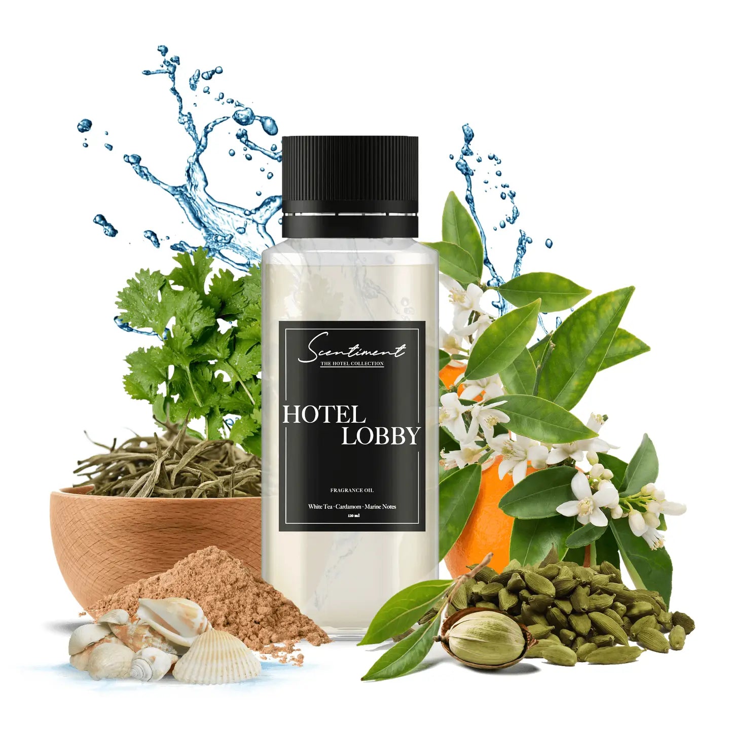 Hotel Lobby - Introducing "Hotel Lobby," a captivating fragrance oil inspired by the refined ambiance of Hilton Hotels. This scent harmonizes fresh, musky, and woody floral notes, reminiscent of the luxurious atmosphere found in a hotel lobby. It begins with a refreshing blend of white tea, artemisia, bergamot, and bitter orange, subtly infused with hints of cardamom. The heart reveals an opulent bouquet of coriander, orange blossom, rose, jasmine, and freesia, exuding delicate yet commanding floral elegance.