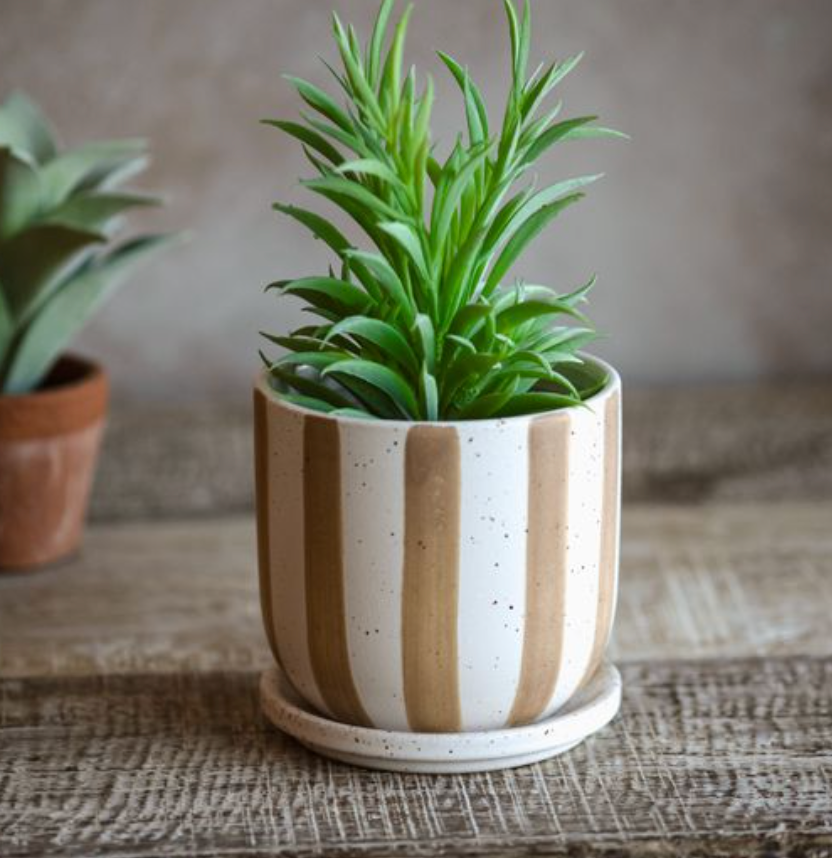 The Mindi Planter features a 4.5-inch matte brown ceramic design with subtle stripe detailing, offering a refined and modern aesthetic. Its compact size is ideal for small plants or succulents, making it perfect for desktops, shelves, or windowsills. Crafted from durable ceramic, this planter ensures longevity while providing excellent support and drainage for healthy plant growth. Its understated elegance complements a variety of interior styles, from rustic to contemporary, enhancing your space with natural charm and expert craftsmanship.