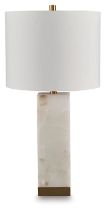 The grandeur and timeless beauty of this contemporary table lamp make it an instant focal point. Made of alabaster with rich goldtone metal accents, the piece makes a style statement whether it's sitting pretty atop an end table or flanking the sofa.