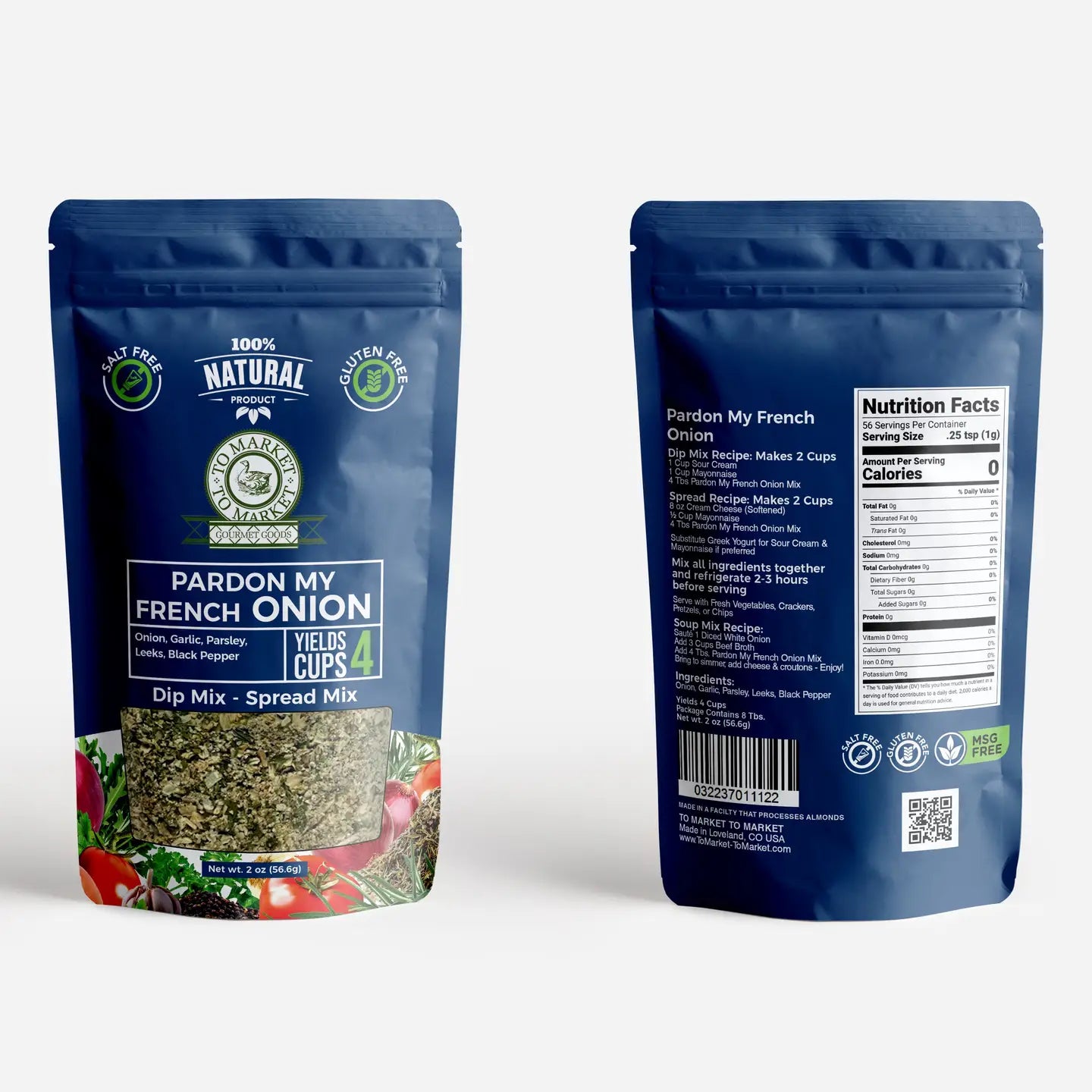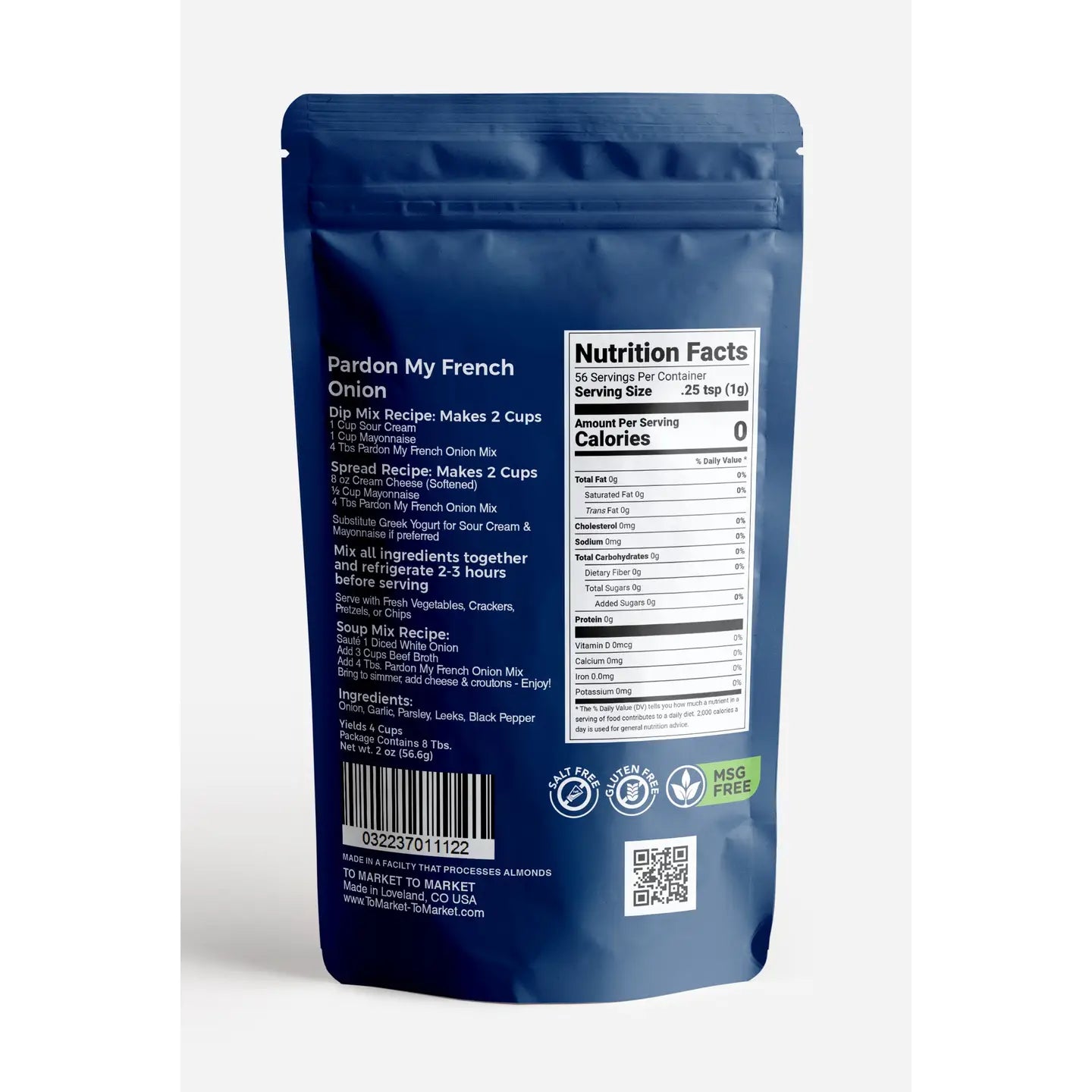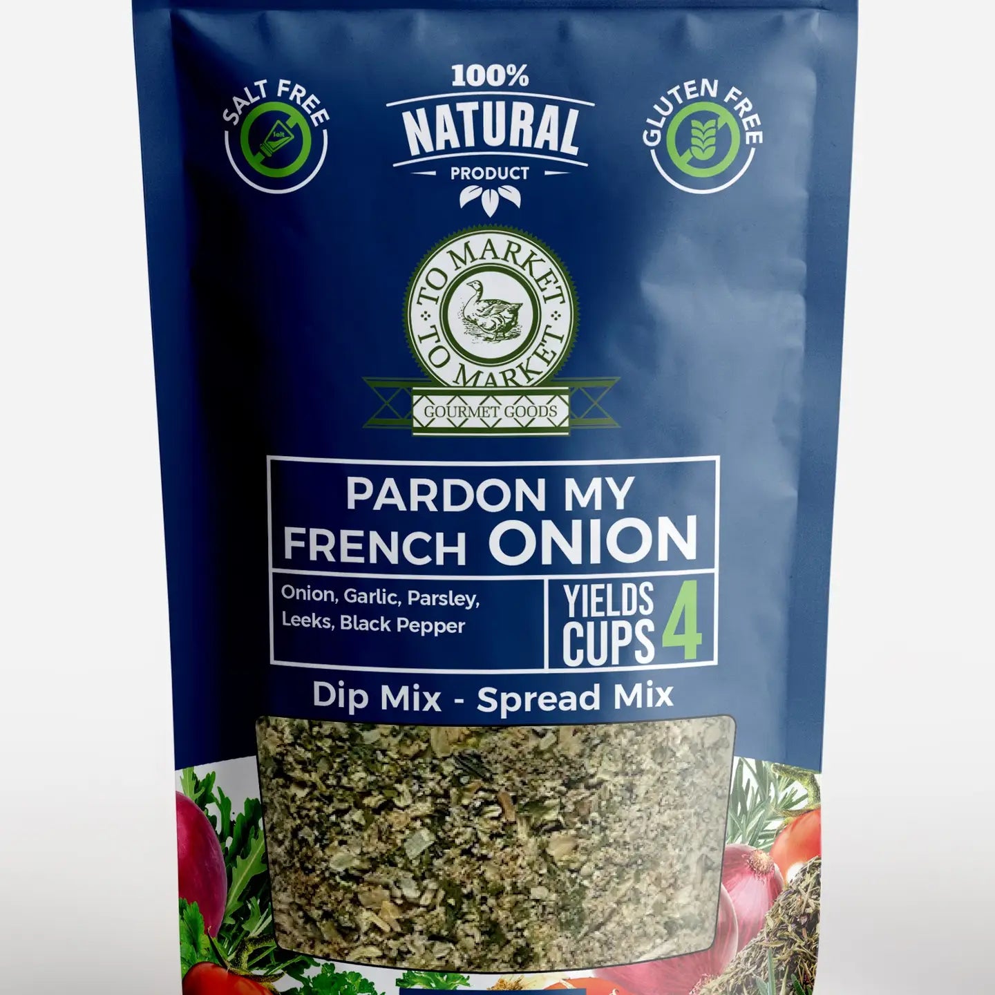 *Pardon My French Onion - Dip Mix - This is for the French Onion Connoisseurs! A versatile blend that is packed with flavor! This mix is great as a dip, spread, hot dip, soup mix and more!Ingredients- Onion, Garlic, Parsley, Leeks and Black Pepper Gluten Free - Salt Free - All Natural- No MSG Net Weight- 2oz Makes 4 Cups