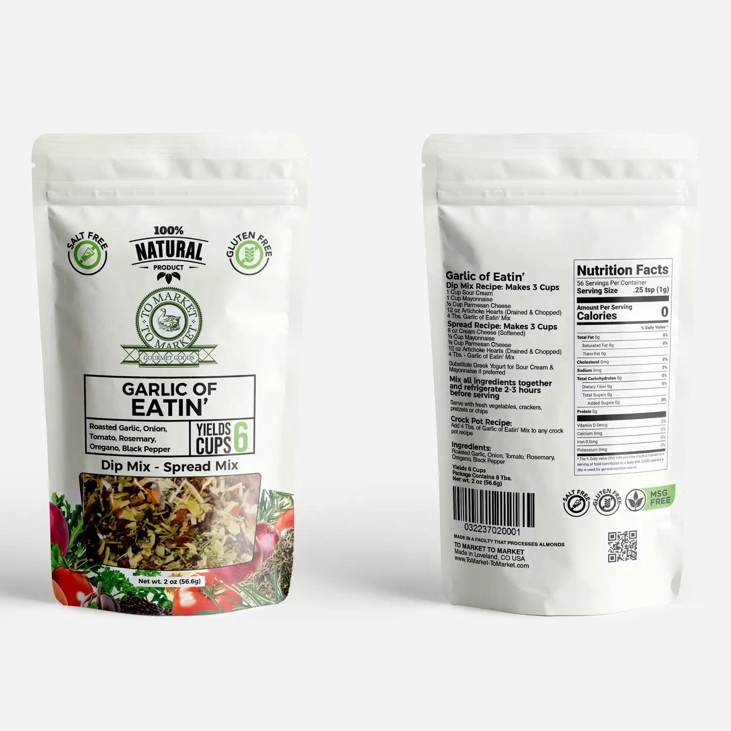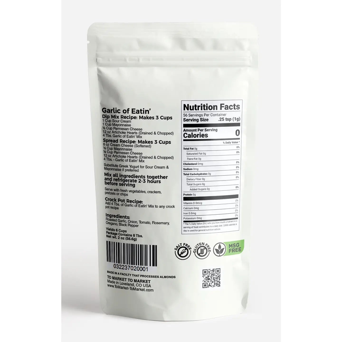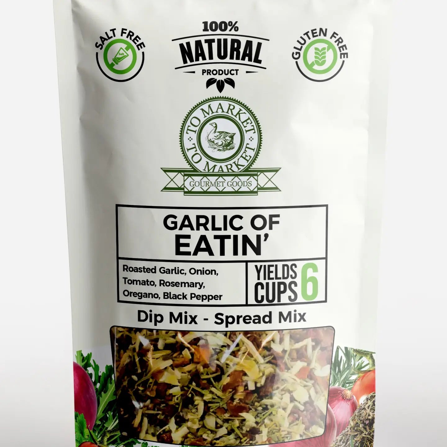 *Garlic of Eatin' - Dip Mix - INGREDIENTS: Roasted Garlic, Onion, Tomato, Rosemary, Oregano and Black Pepper No MSG, No Chemicals, No Preservatives, No Salt, Gluten-Free EACH PACKAGE: Yields 3 Batches