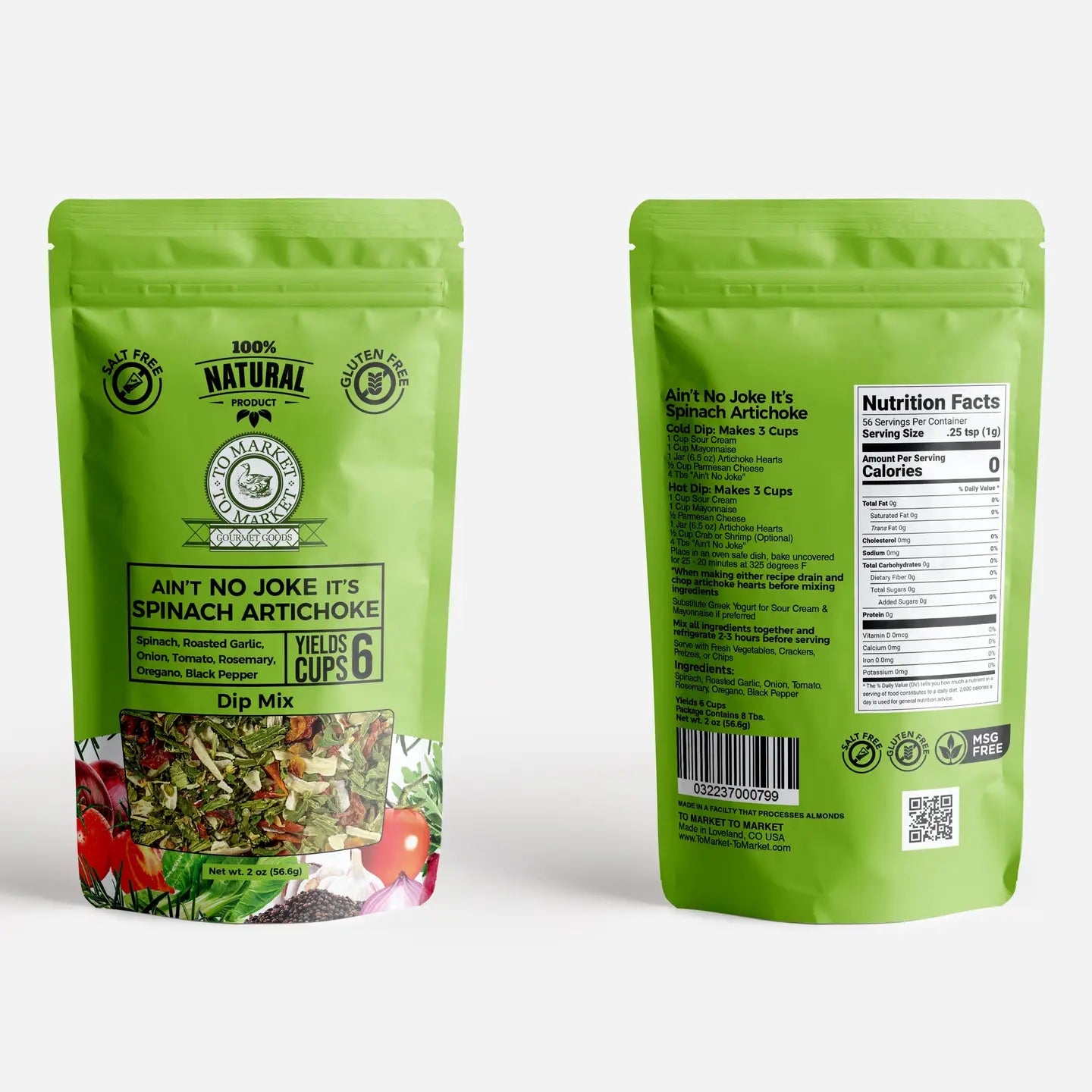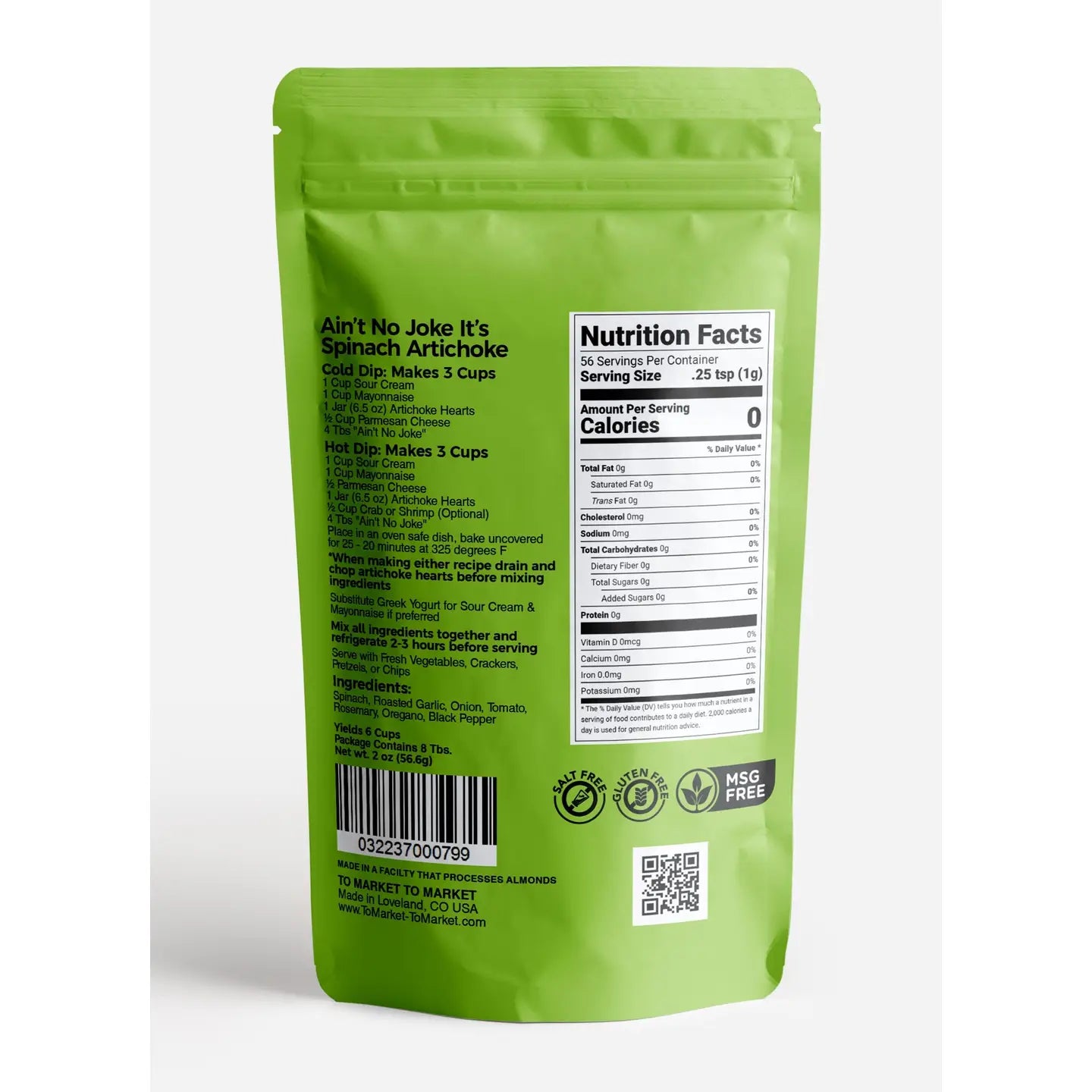 *Ain't No Joke, It's Spinach Artichoke - Dip Mix - INGREDIENTS: Spinach, Roasted Garlic, Onion, Tomato, Rosemary, Oregano and Black Pepper No MSG, No Chemicals, No Preservatives, No Salt, Gluten Free 2 oz Re-sealable pouches