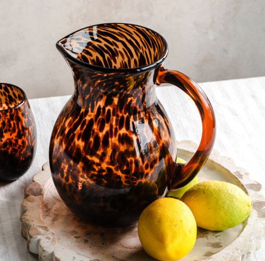 Elevate your table setting with this stunning tortoise shell glass pitcher, a striking blend of natural beauty and practical elegance. The rich, warm tortoiseshell pattern creates an eye-catching focal point that complements both rustic and contemporary décor. Standing at 9.25 inches tall with a generous 4.45 x 3.15-inch base, this pitcher offers ample capacity for serving beverages while maintaining a graceful silhouette. The textured glass design catches light beautifully, adding depth and character to your dining experience. Perfect for water, wine, or specialty drinks, this versatile piece transforms everyday moments into something memorable. A timeless addition to any home that values distinctive style and quality craftsmanship.