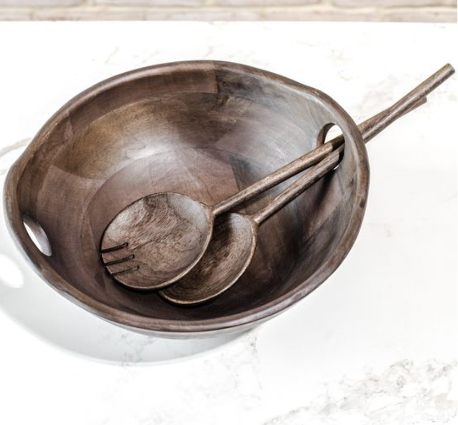 This elegant 12" wooden bowl and server set combines rustic charm with practical functionality. Crafted from sustainably sourced mango wood, each piece showcases rich dark brown tones and natural grain patterns that add warmth to any table setting. The generous bowl size accommodates generous portions for entertaining, while the included server makes serving effortless. Mango wood's durability ensures this set withstands regular use while developing a beautiful patina over time. Perfect for both everyday dining and special occasions, this versatile set brings artisanal quality to your kitchen and dining experience.