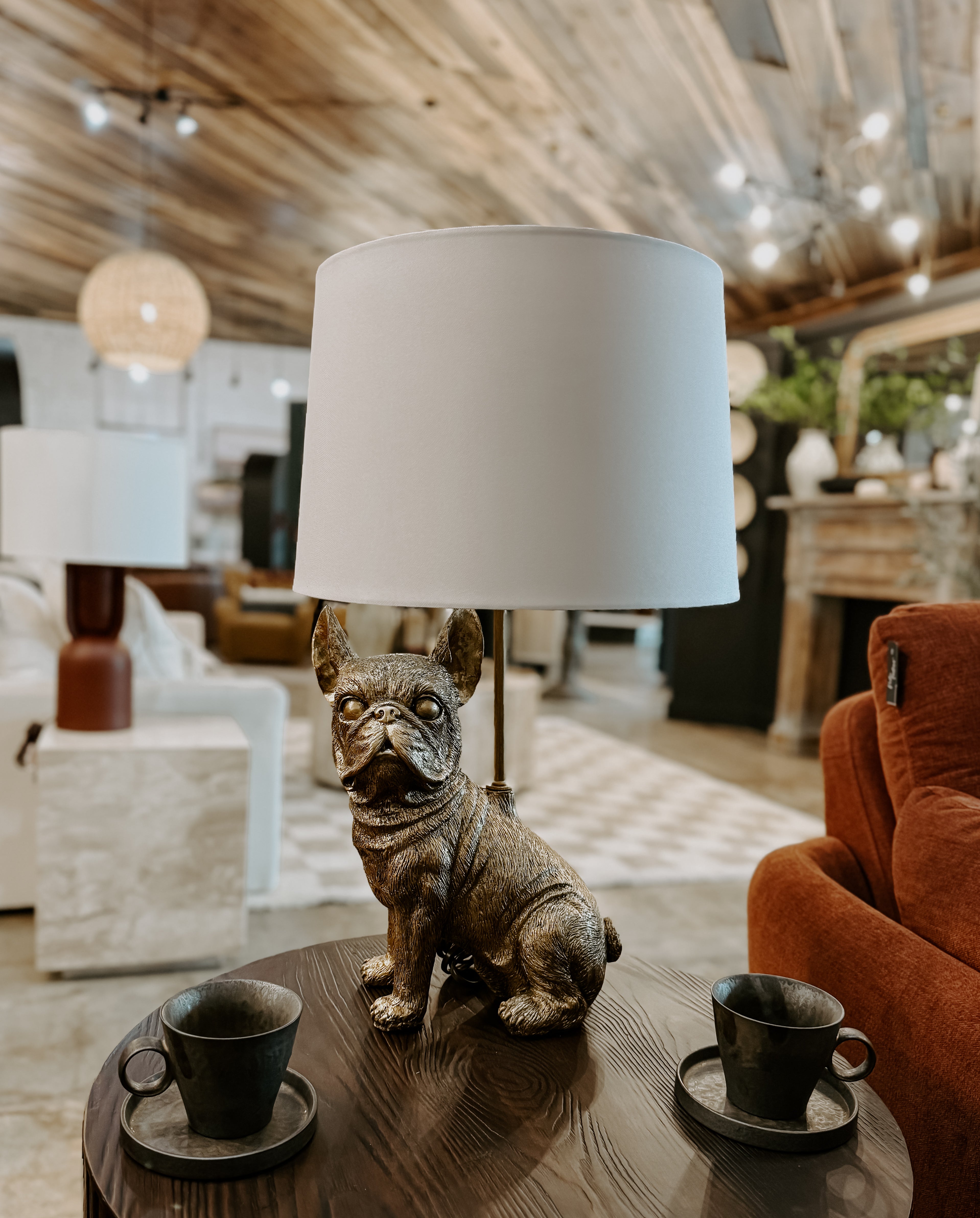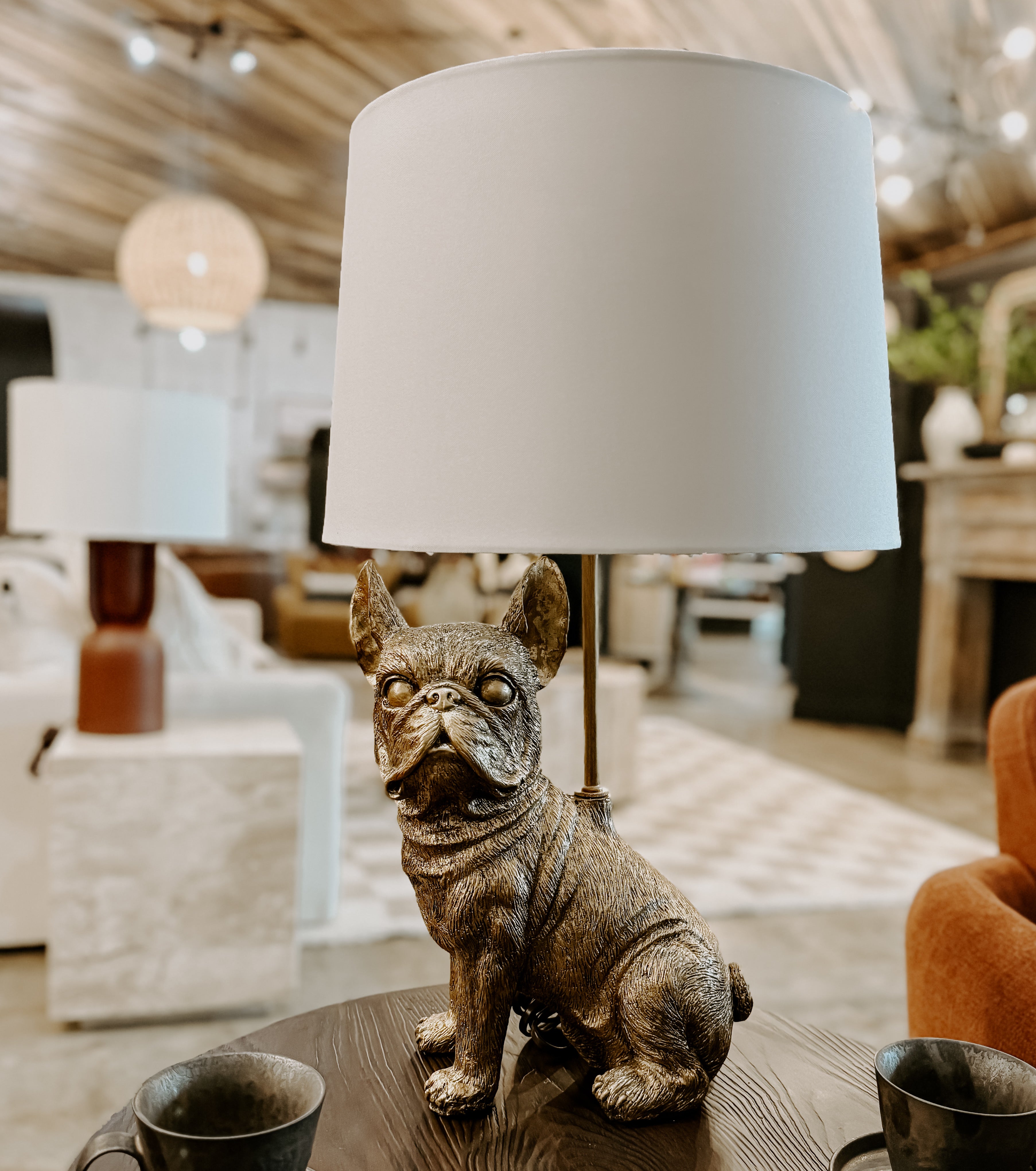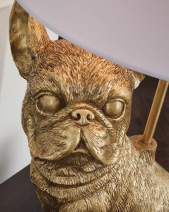 This charming table lamp brings a touch of playful sophistication to your home. An adorable French bulldog base, finished in a sleek goldtone, is sure to be a conversation starter. This lamp's warm and inviting ambiance makes it a delightful addition to your bedside table or living space decor.