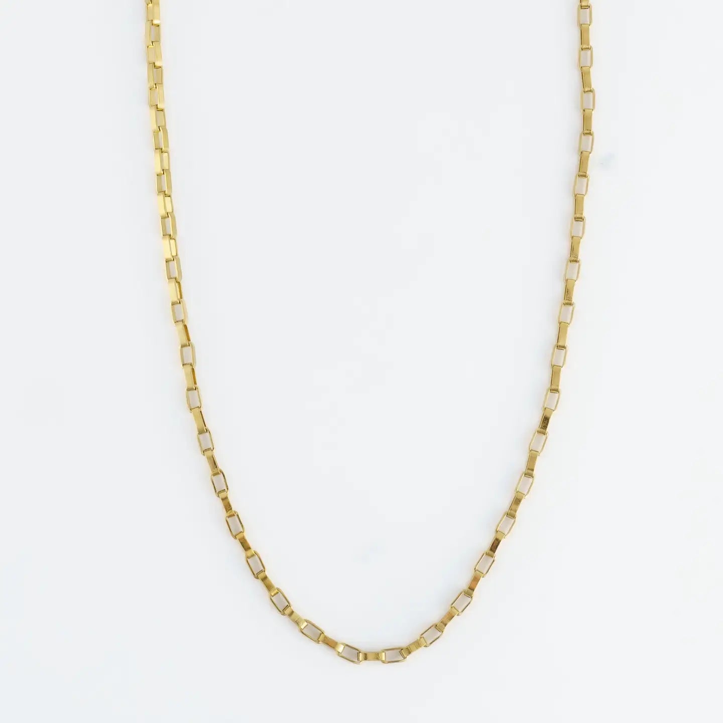 Indulge in luxury with the Narelle Waterproof Box Chain Necklace. Its chunky 18" box chain in classic gold exudes an effortless and minimalist charm. With specialized PVD technique, this necklace is fade and tarnish resistant, making it perfect for all your activities, from swimming to intense workouts. Elevate your style with this waterproof, sweatproof, and water-resistant piece.