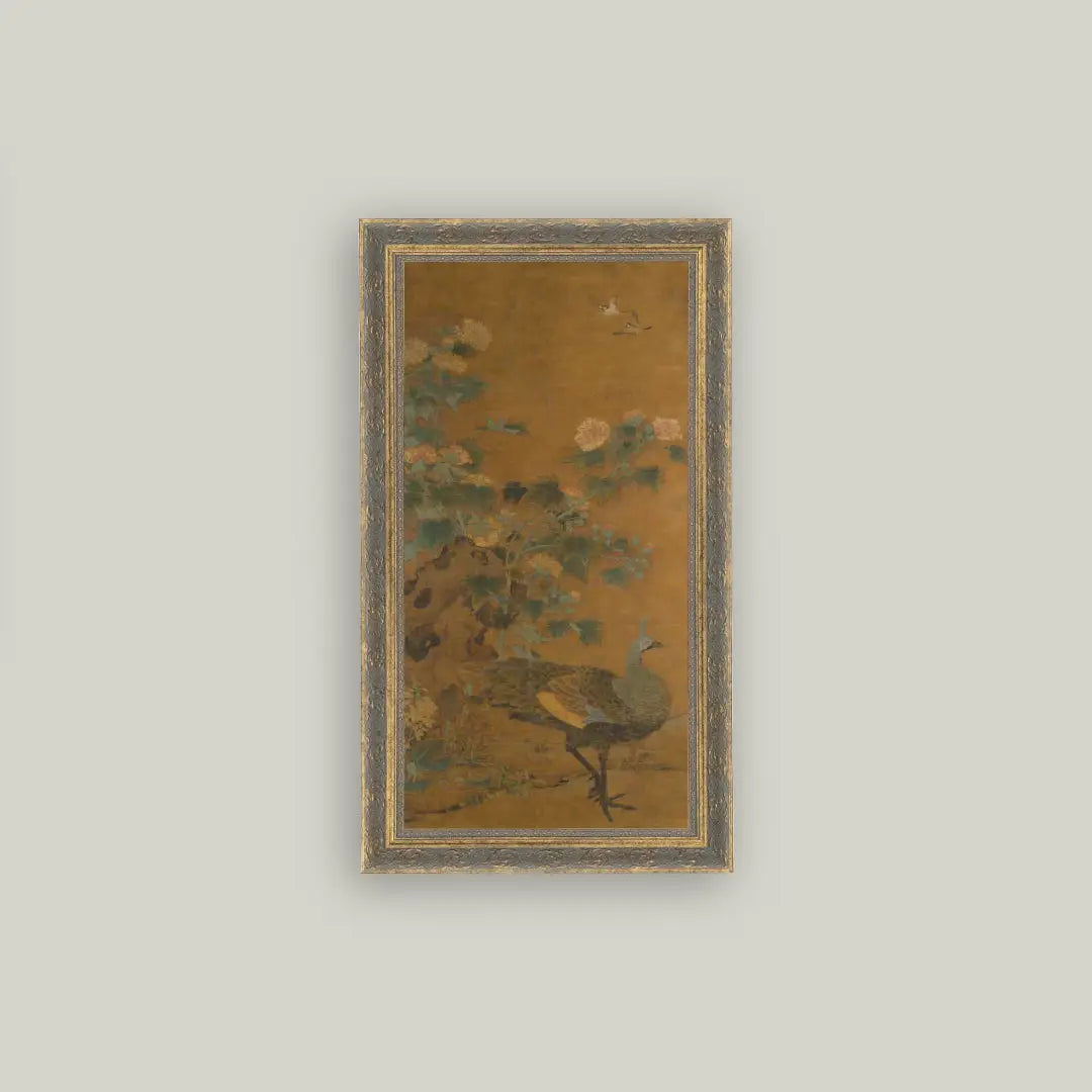 Elevate your space with our Peacock and Hollyhocks Framed Antique inspired Art. This distinguished piece showcases the timeless pairing of majestic peacocks against vibrant hollyhocks, rendered in period-authentic techniques. The ornate frame complements the detailed brushwork, creating a focal point that brings refined elegance to any interior. Each reproduction maintains the subtle patina and artistic integrity of the original work.