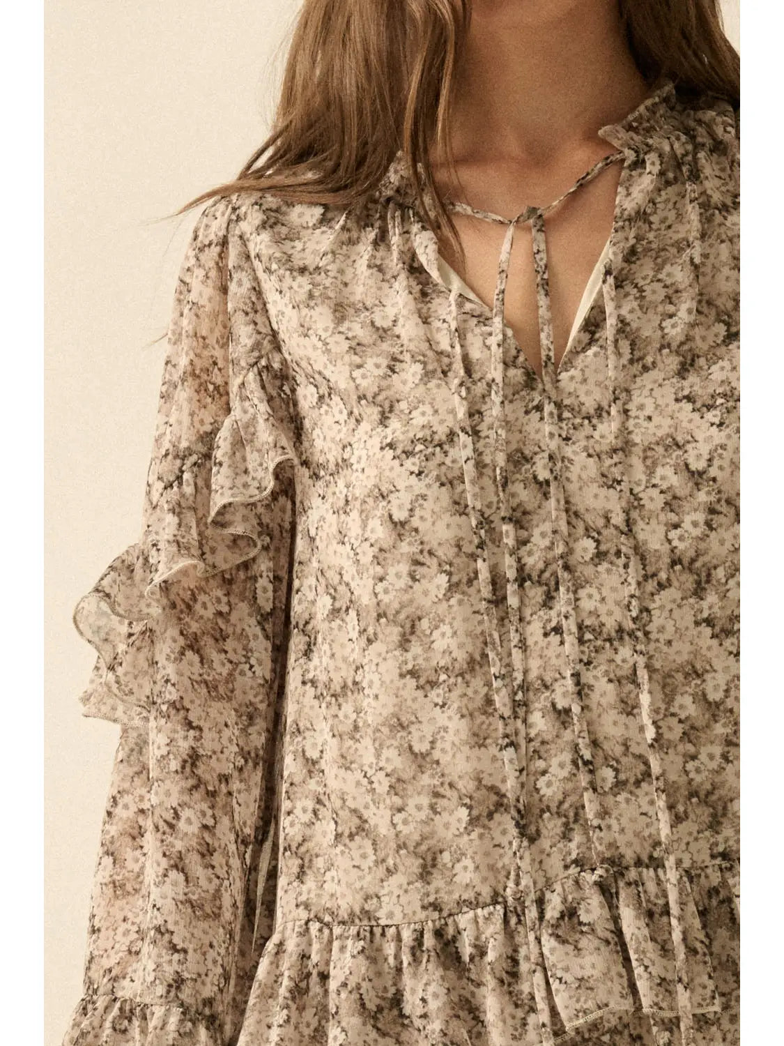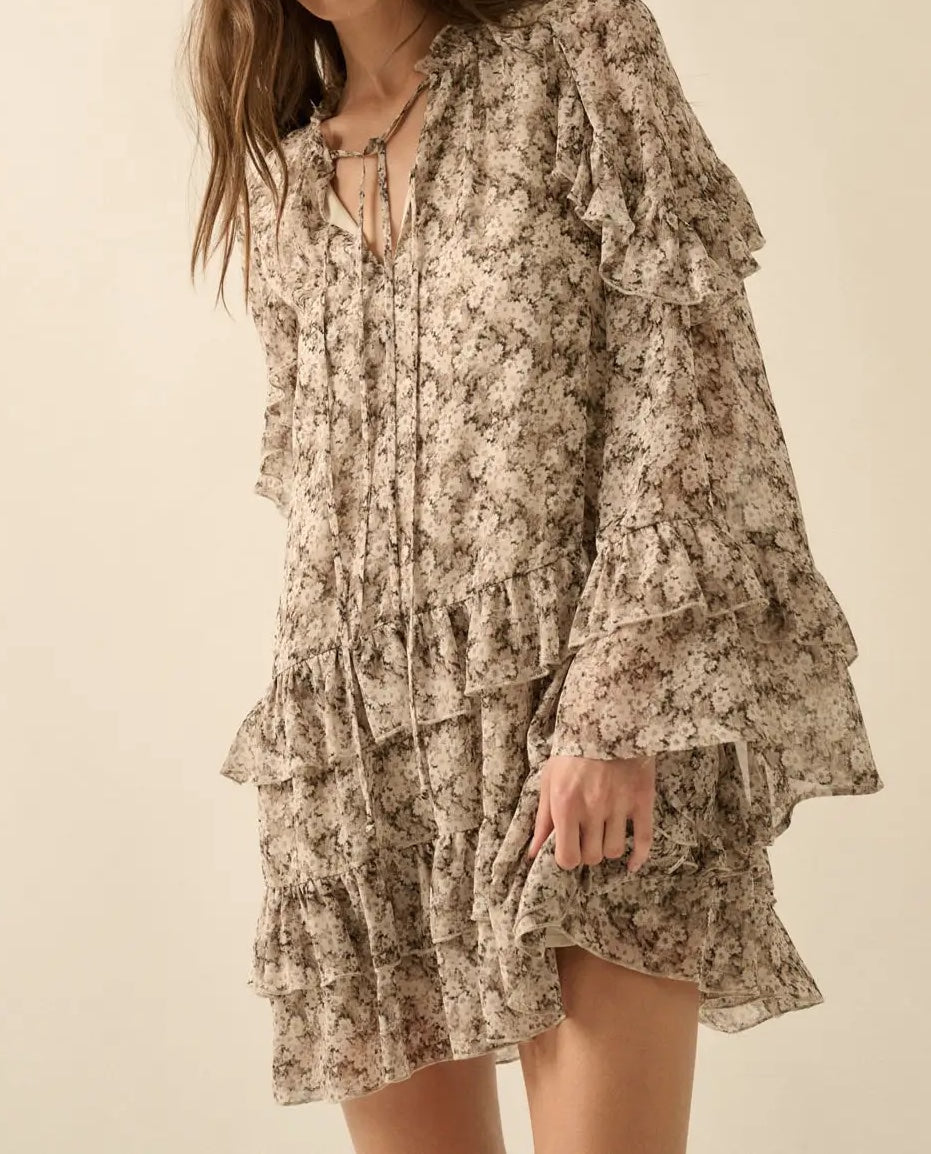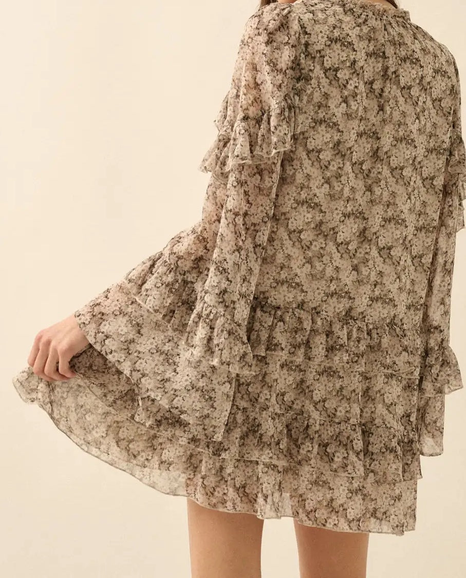 Embrace effortless elegance with this charming floral-print woven mini dress. The romantic V neckline features delicate tie closures, while a short ruffle collar adds vintage-inspired detail. Bell sleeves adorned with tiered ruffle trim create movement and dimension, perfectly complementing the cascading ruffles of the skirt. The babydoll silhouette and loose fit provide comfortable all-day wear, while the sleeveless lining keeps you cool. Calf-length cut offers versatile styling for any occasion—dress it up for gatherings or down for casual outings.