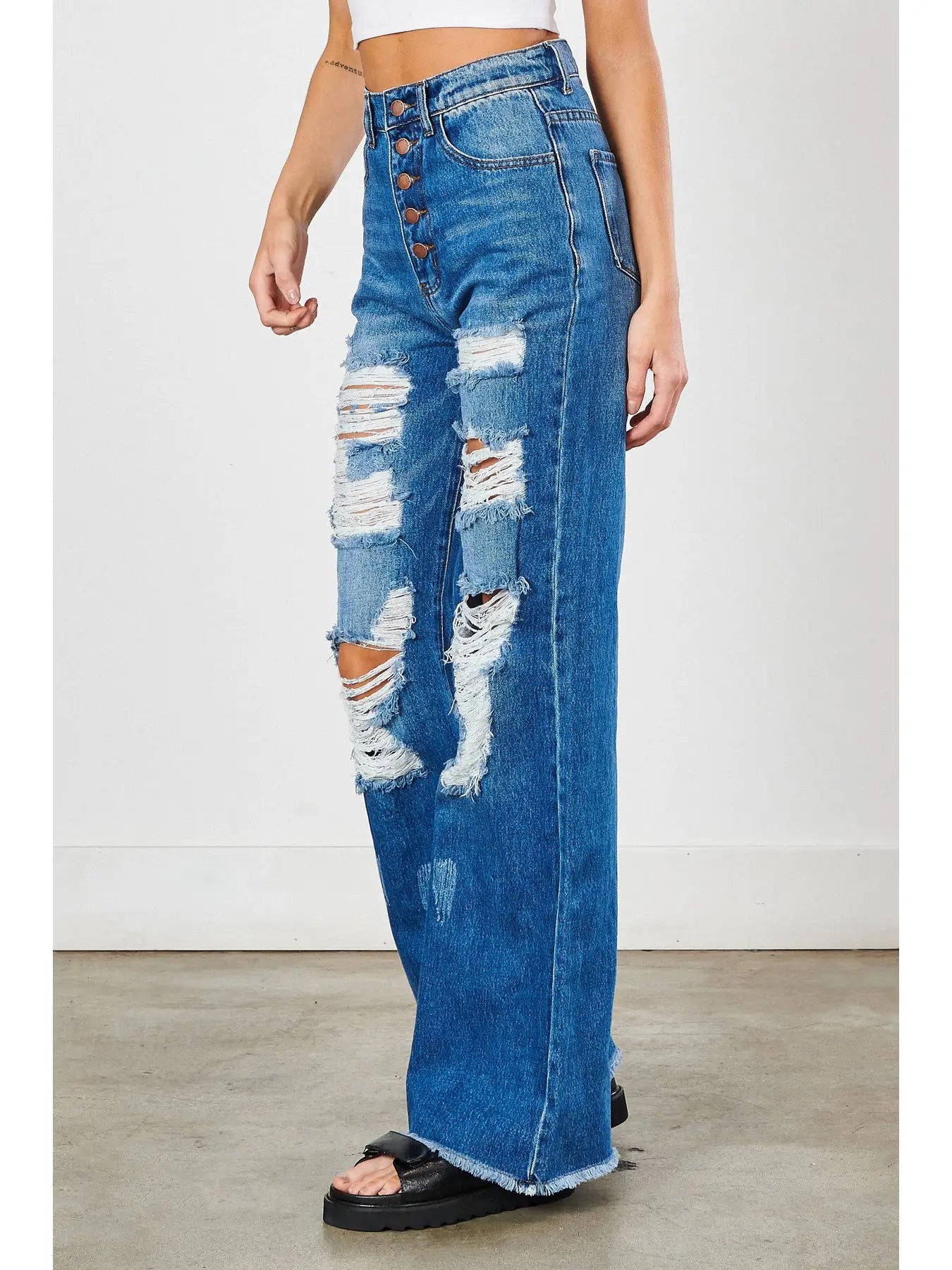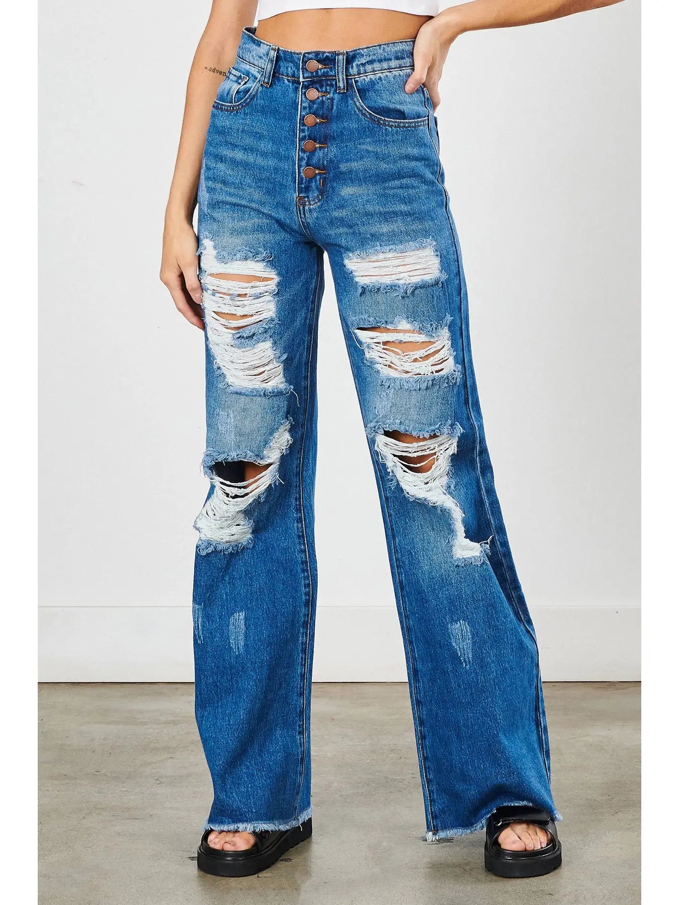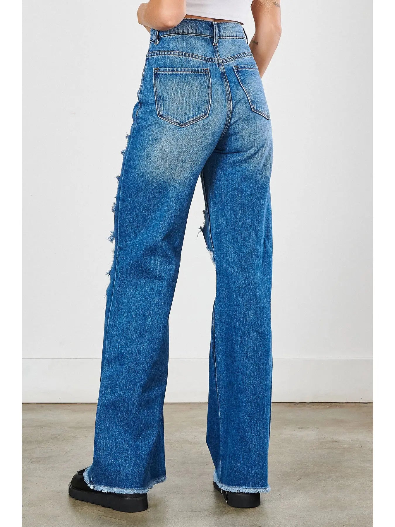 The generous 12.5" rise and 34" inseam create a flattering fit for diverse body types, while super distressed detailing and raw fringed hems deliver that coveted worn-in aesthetic.