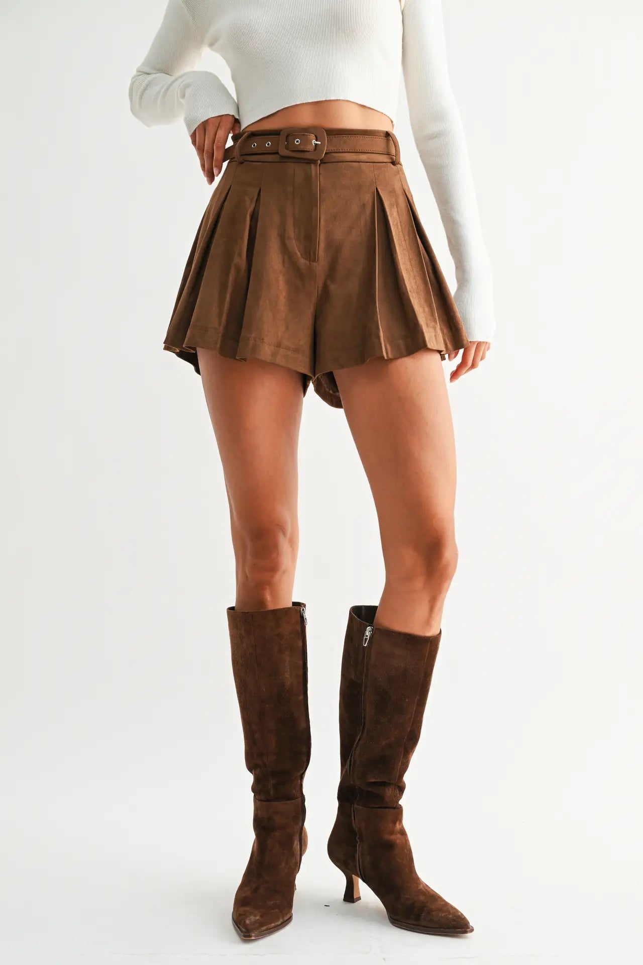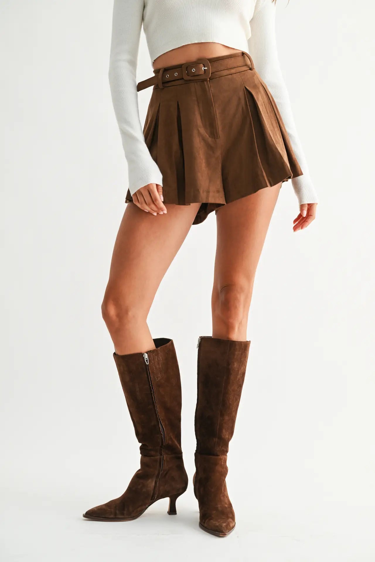 Elevate your wardrobe with these meticulously crafted high-waisted brown pleated suede shorts. Designed for the discerning individual seeking sophistication and comfort, these shorts seamlessly transition from the office to after-hours events. The supple suede fabric offers a rich texture, while structured pleating ensures a tailored fit that flatters every silhouette. Crafted from 90% polyester and 10% spandex, they deliver both durability and flexibility for all-day wear.