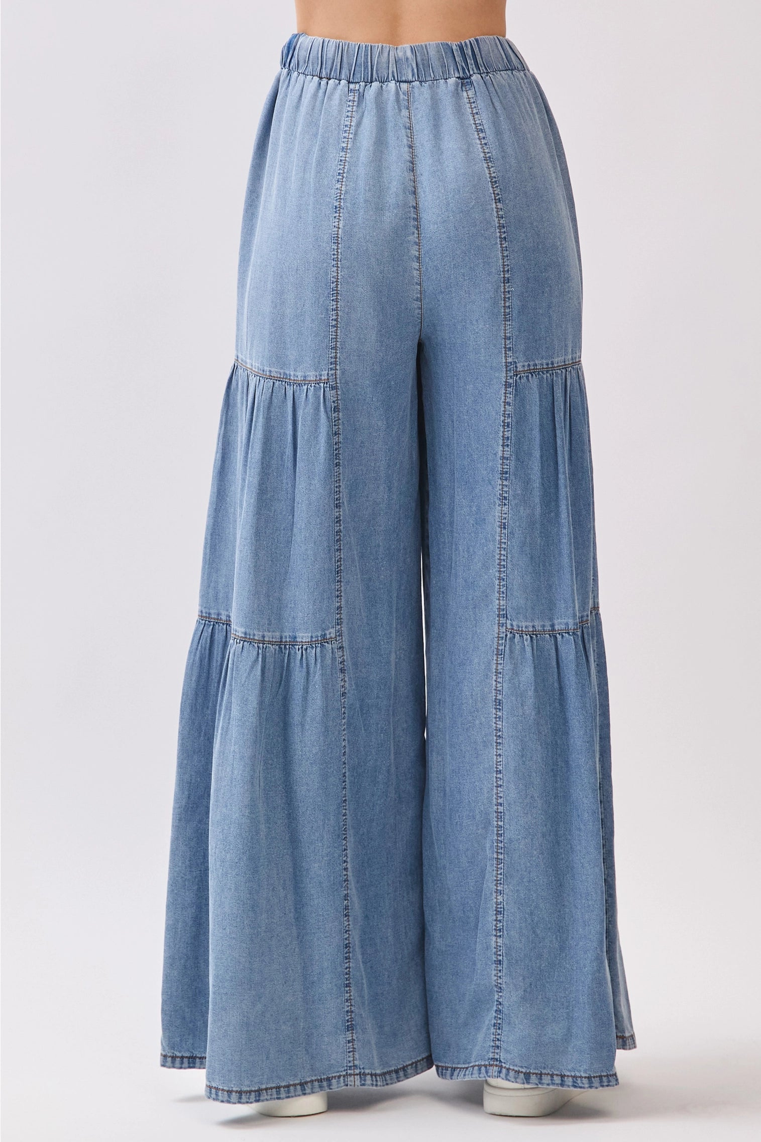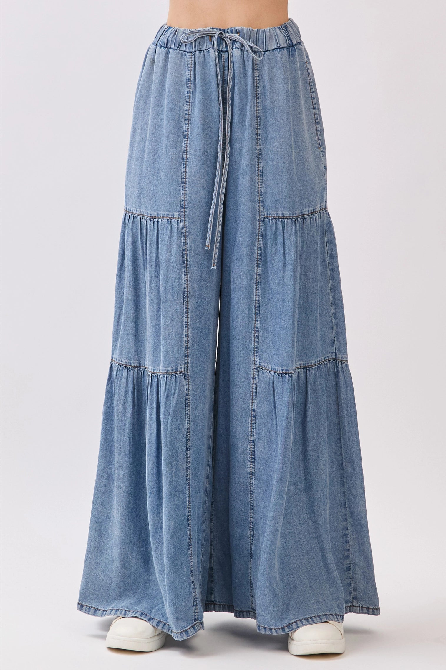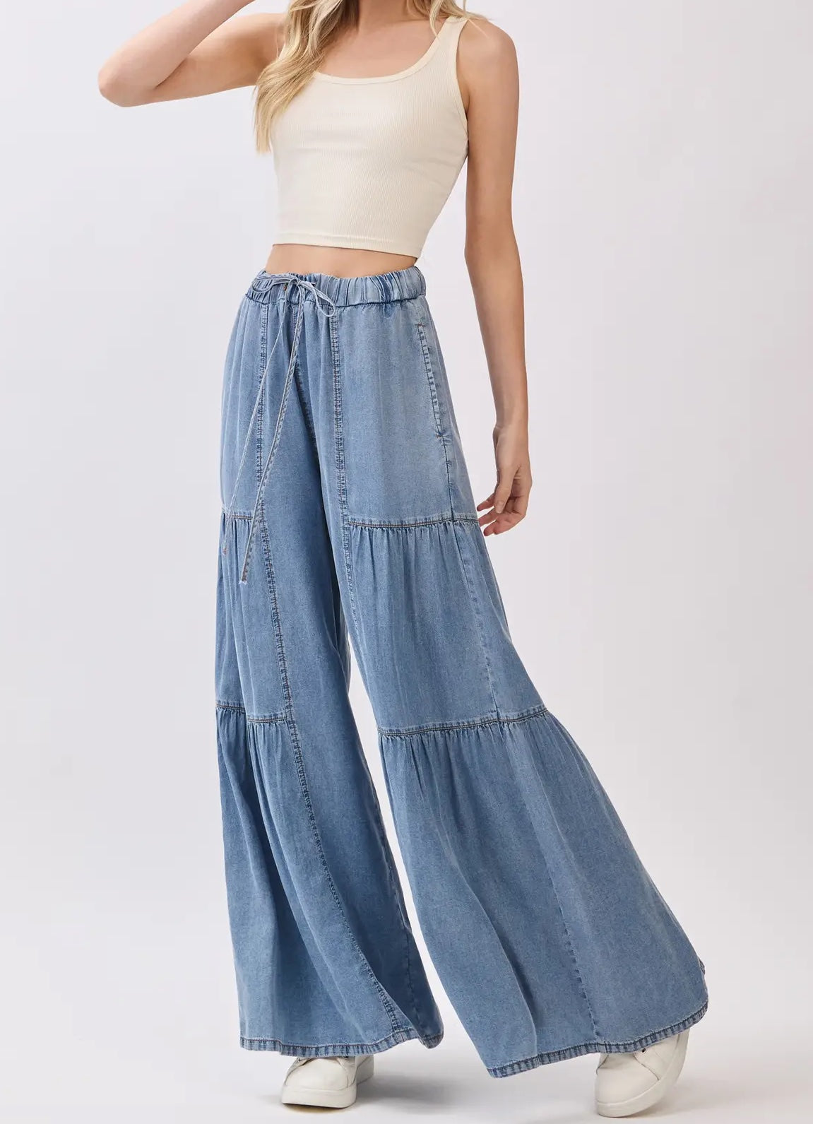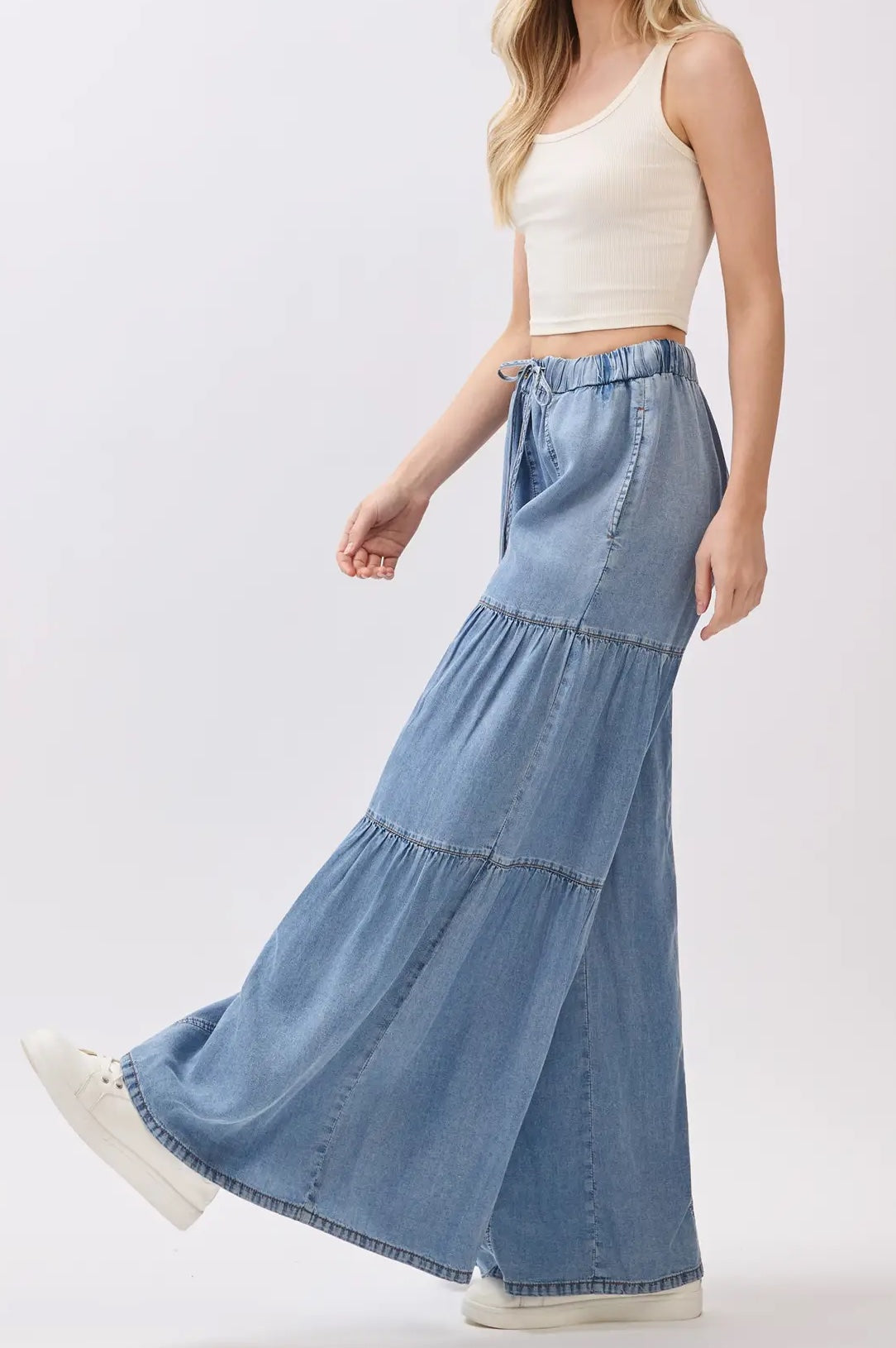 Embrace effortless style with these chambray wide leg pants, designed for the modern bohemian. The mineral-washed finish adds texture and visual interest, while the tiered silhouette creates beautiful movement with every step. An adjustable drawstring waistband ensures a custom fit, and the flowing wide leg cut flatters all body types. Versatile enough for weekend adventures or dressed-up occasions, these pants deliver comfort without compromising on sophistication. Your new go-to for relaxed elegance.