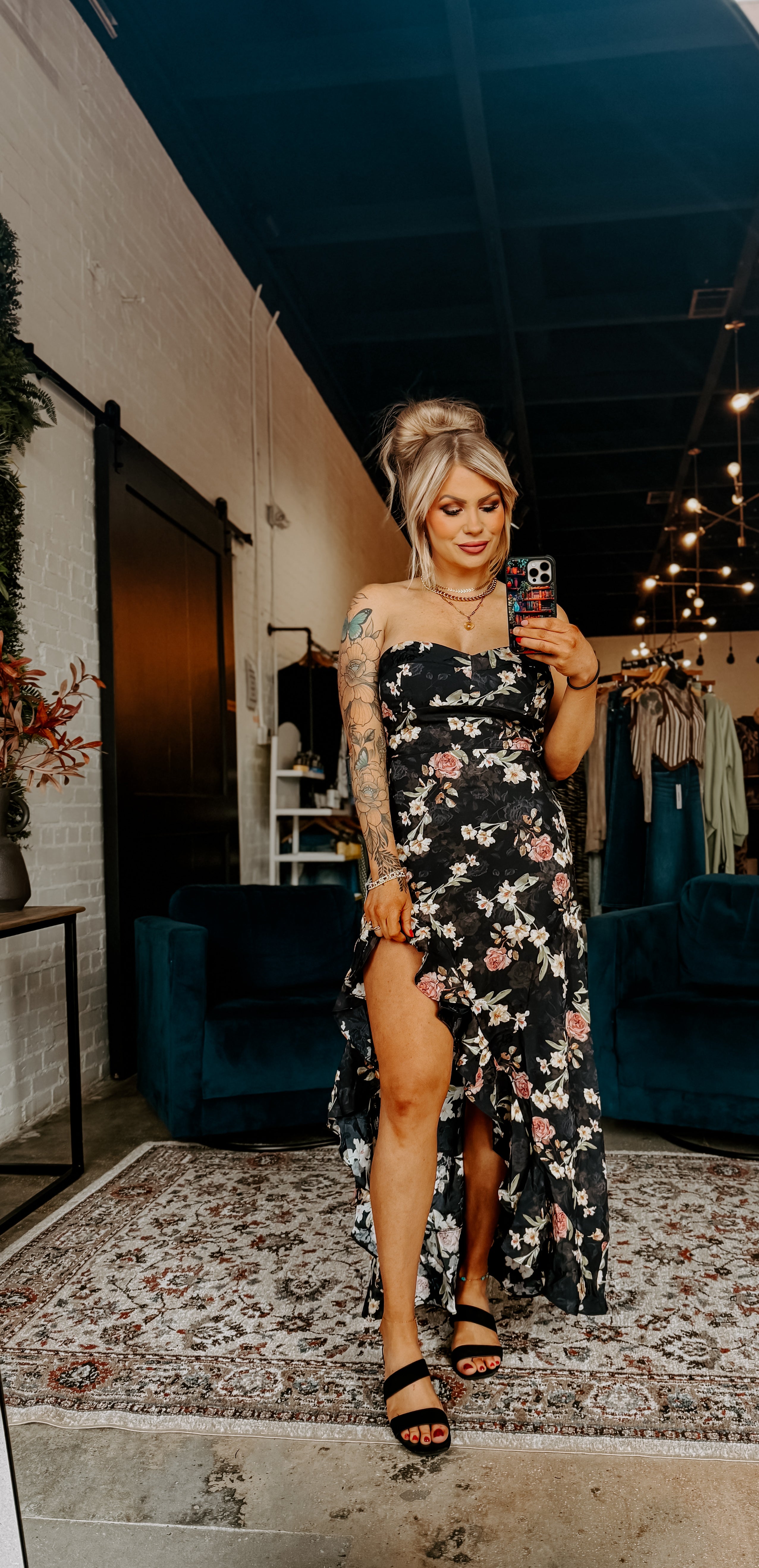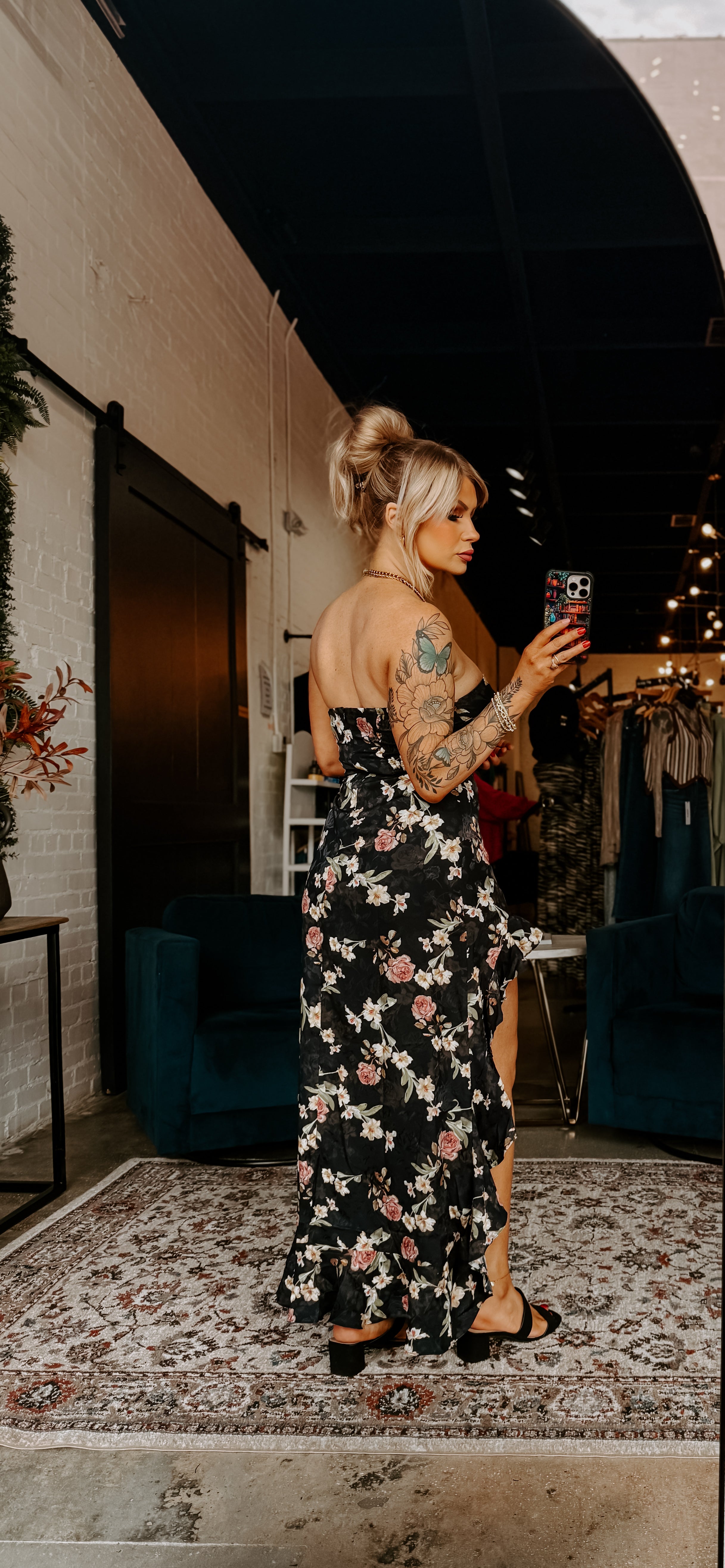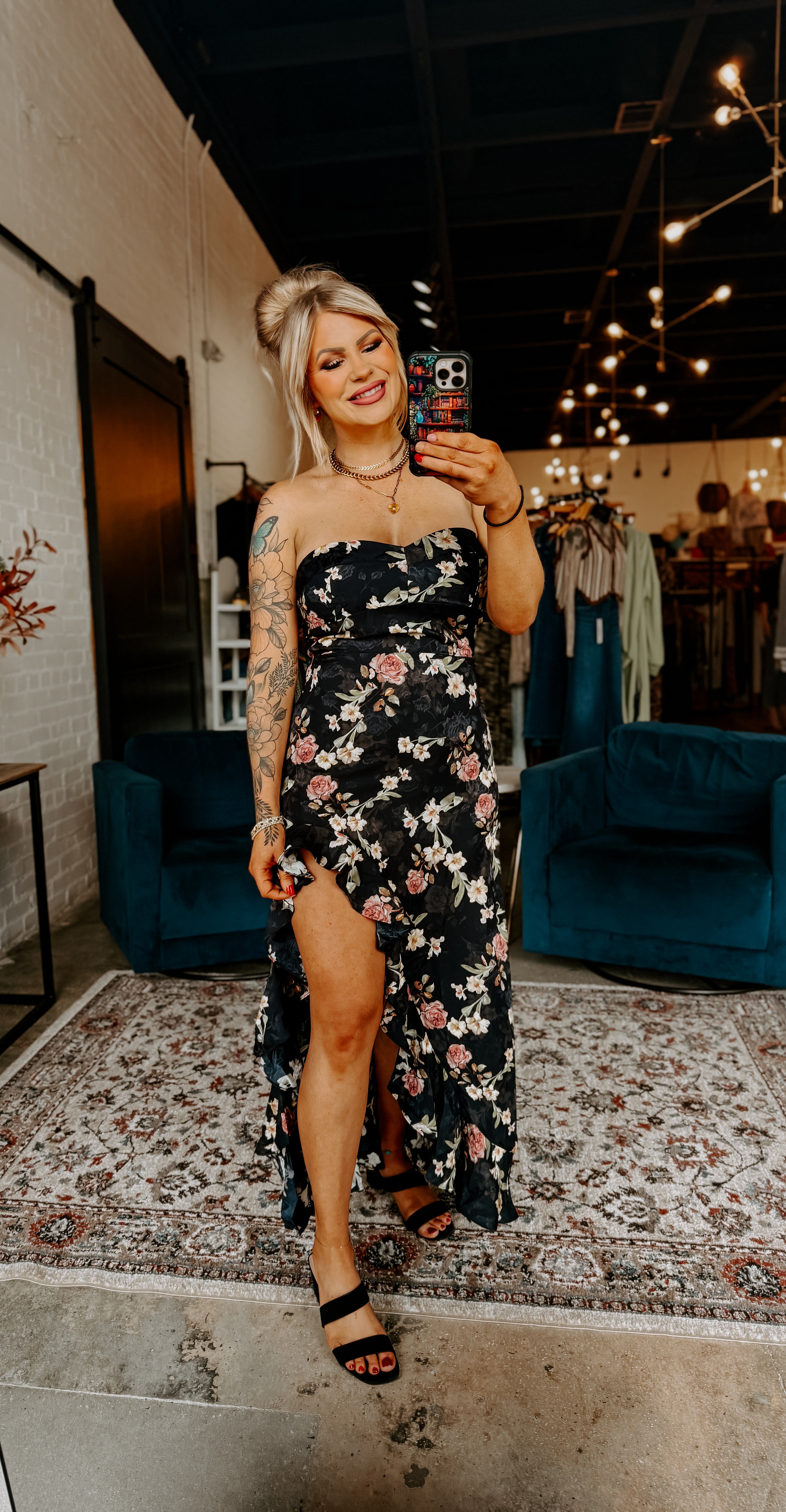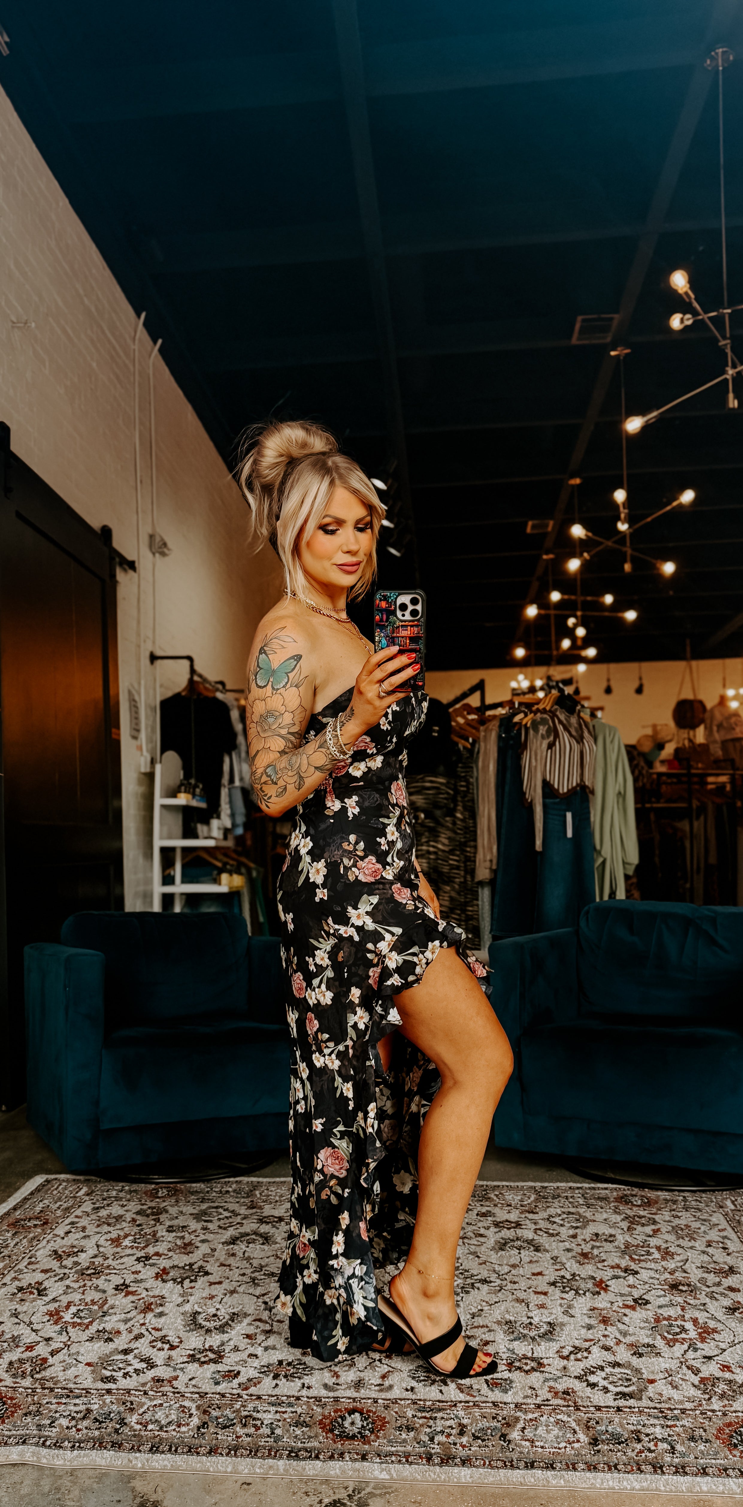 Elevate your evening wardrobe with this stunning floral print satin jacquard maxi dress. The romantic sweetheart neckline frames your silhouette beautifully, while the fitted bodice through the hips creates a flattering, feminine shape. Dramatic asymmetrical ruffled legs with a split add movement and sophistication to every step. A hidden center zipper ensures a seamless look, and the fully lined construction provides comfort and confidence. Perfect for special occasions, date nights, or whenever you want to make an unforgettable impression.