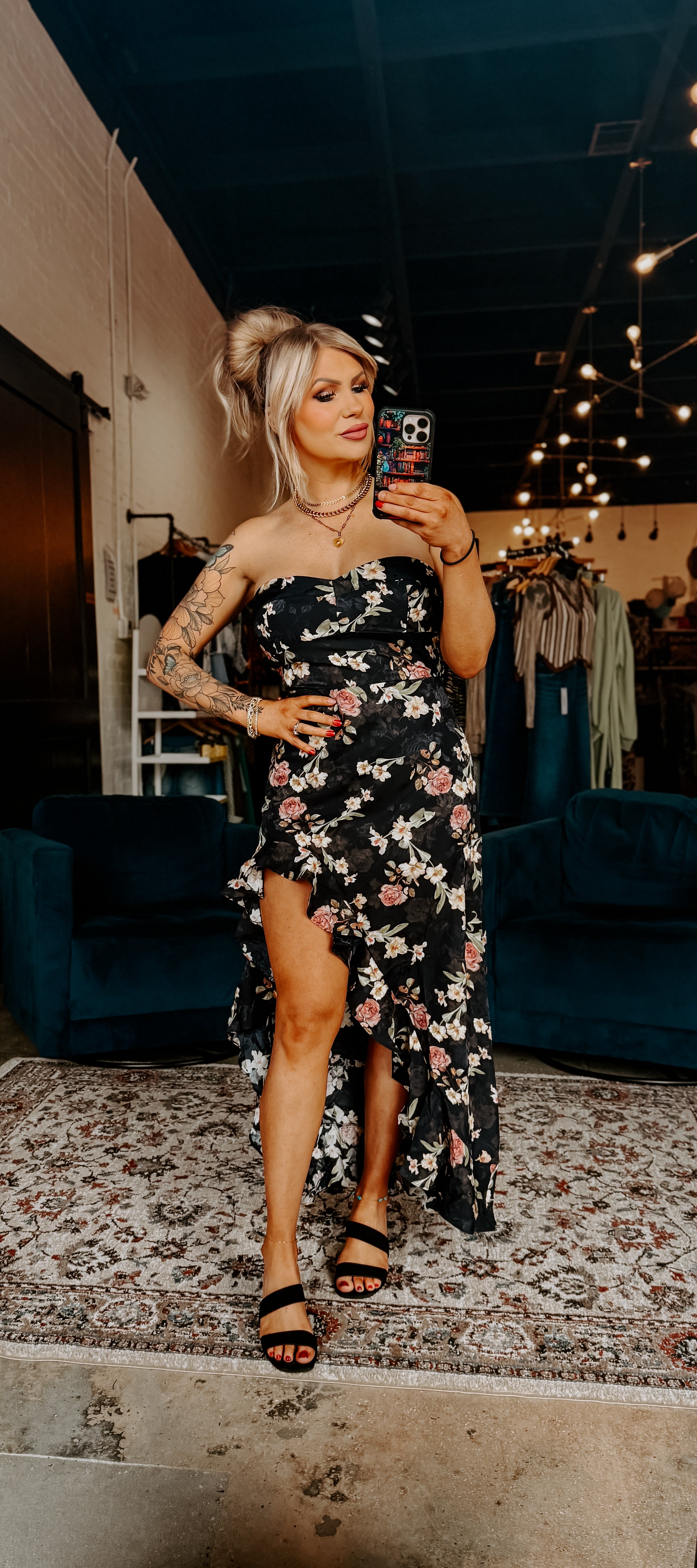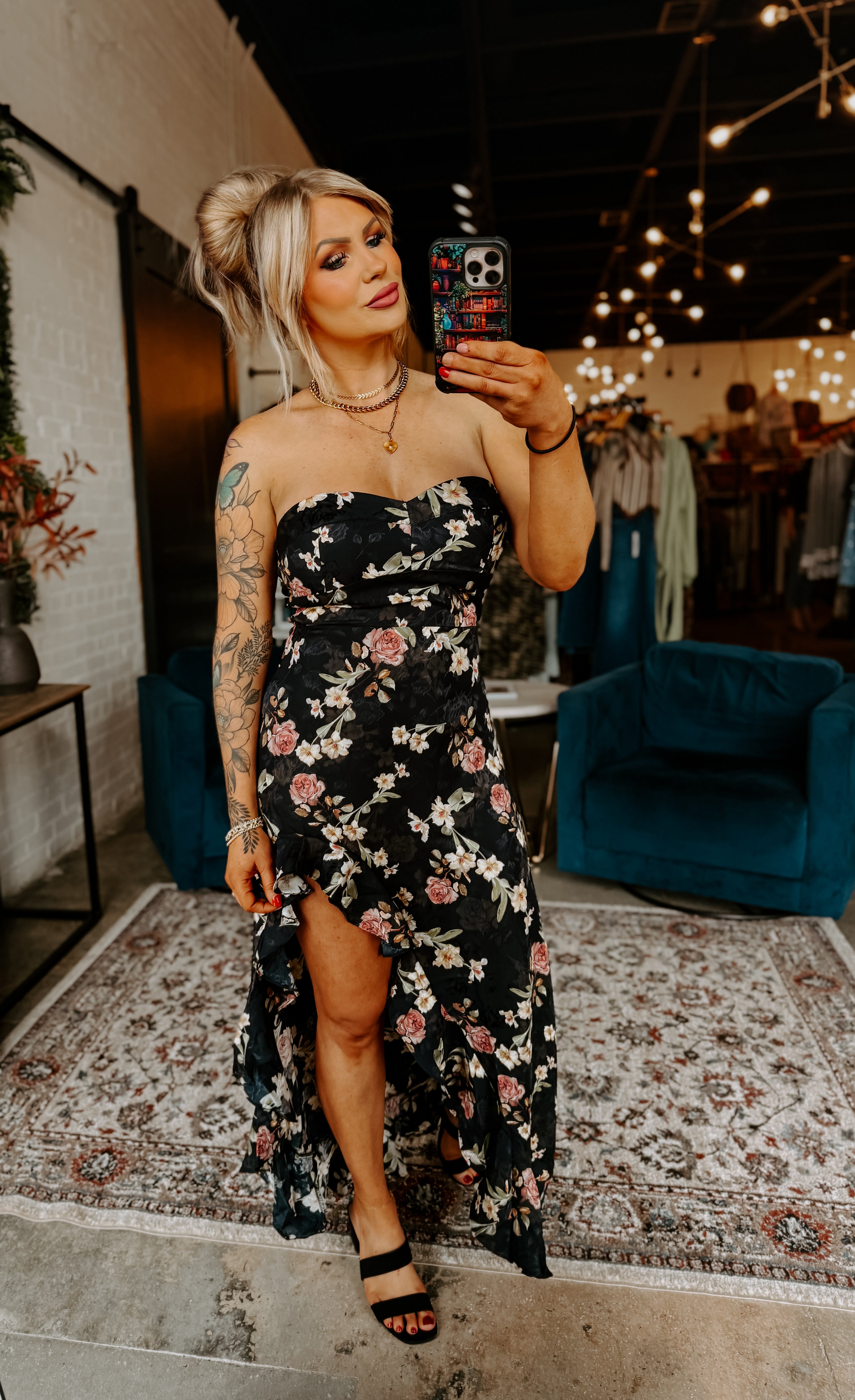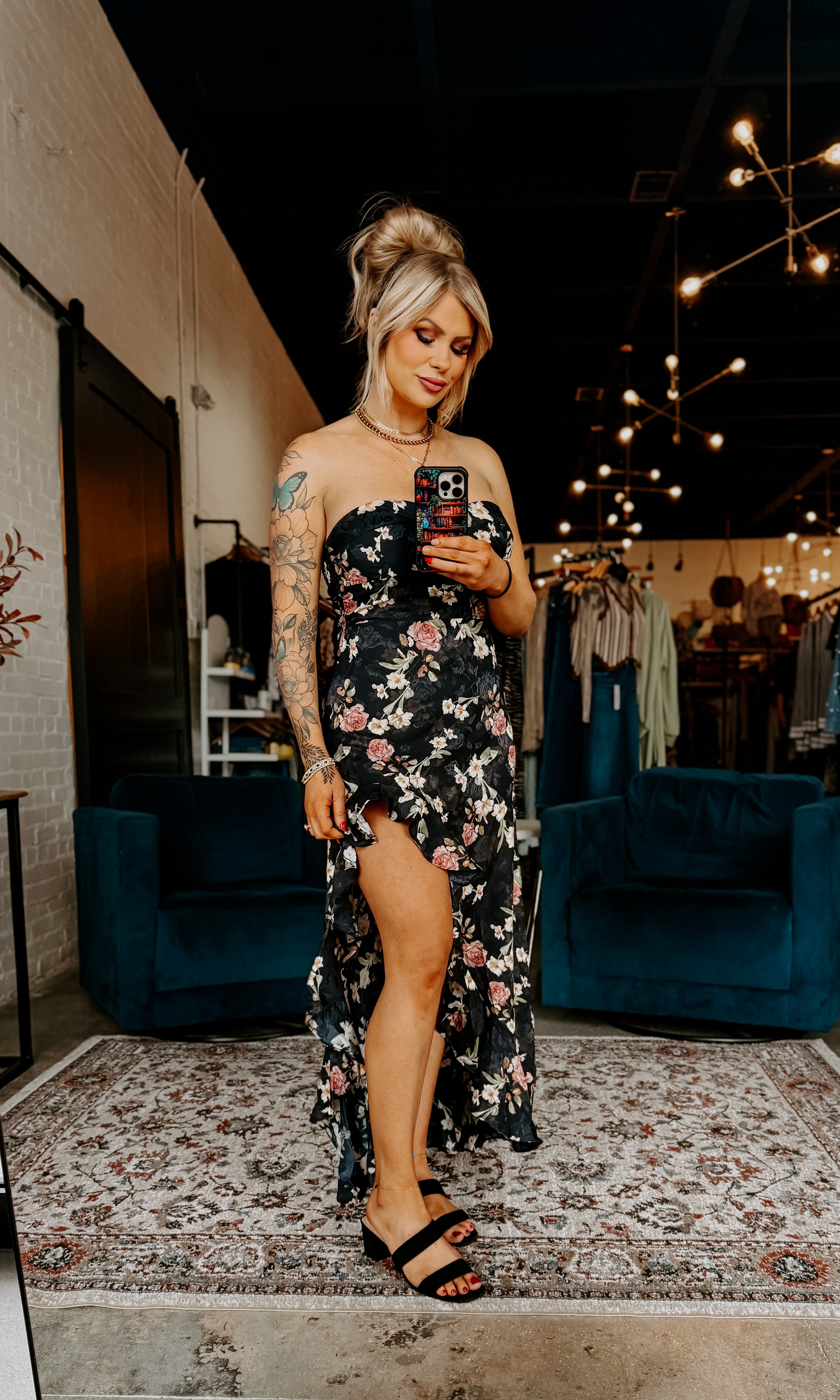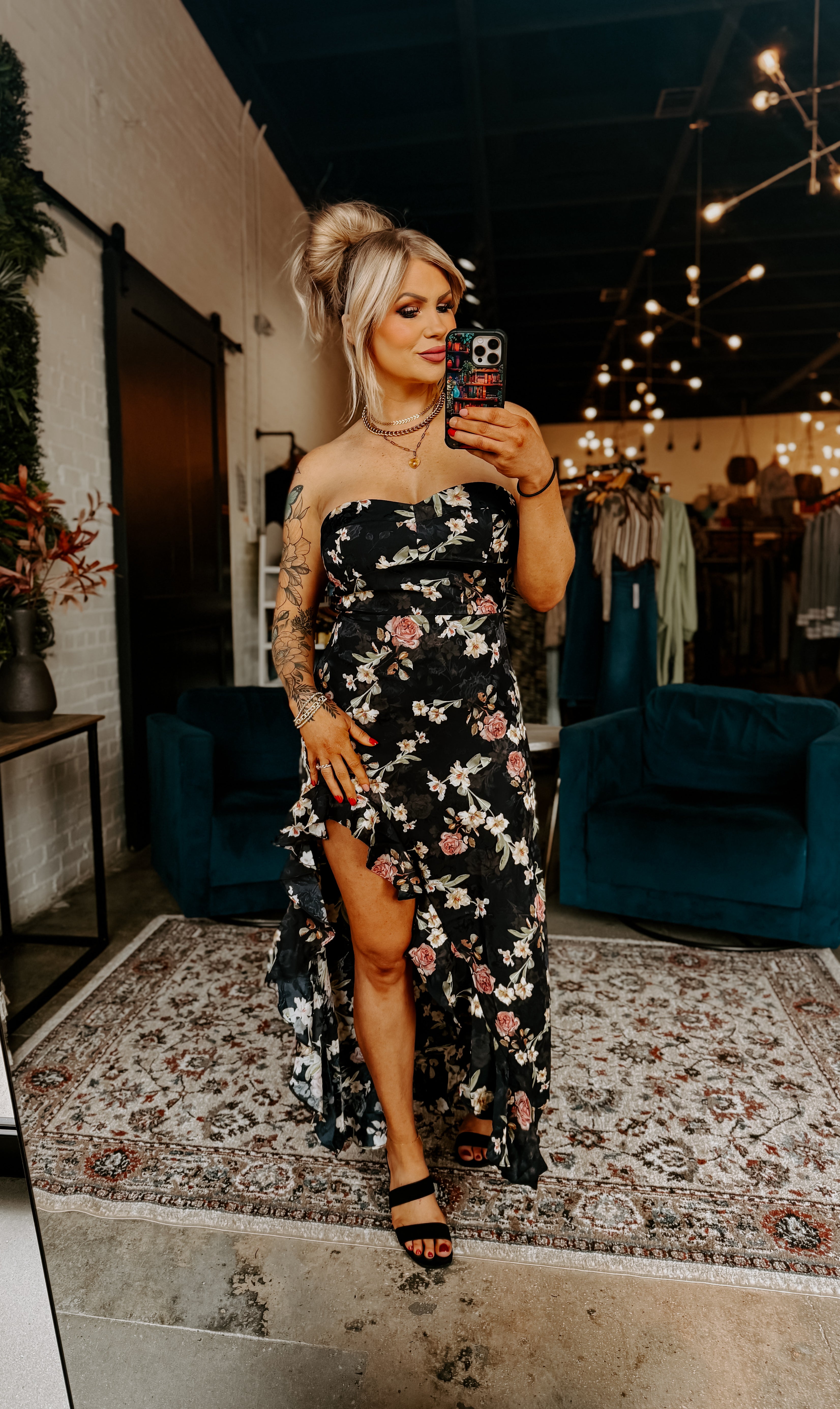 Elevate your evening wardrobe with this stunning floral print satin jacquard maxi dress. The romantic sweetheart neckline frames your silhouette beautifully, while the fitted bodice through the hips creates a flattering, feminine shape. Dramatic asymmetrical ruffled legs with a split add movement and sophistication to every step. A hidden center zipper ensures a seamless look, and the fully lined construction provides comfort and confidence. Perfect for special occasions, date nights, or whenever you want to make an unforgettable impression.