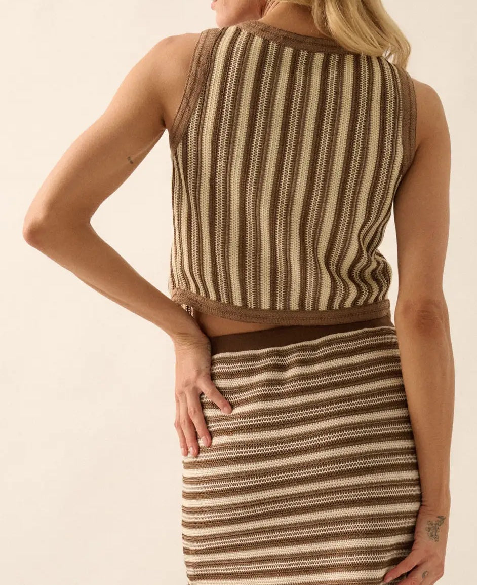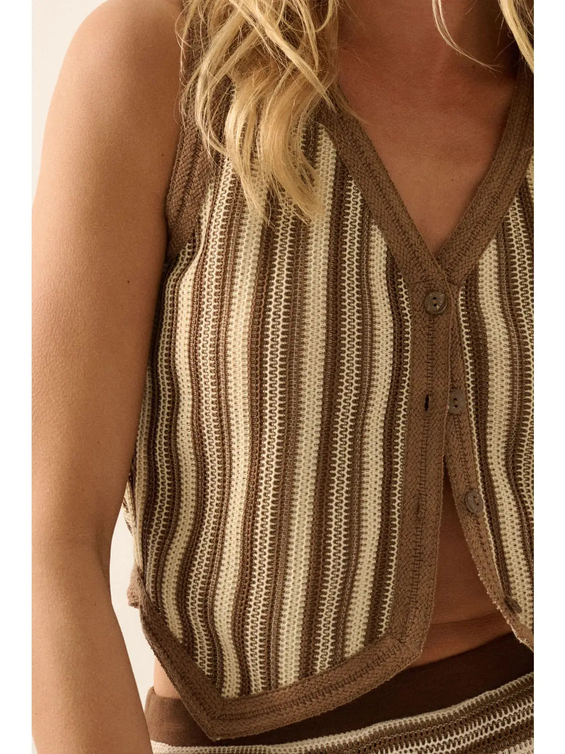 Layer effortlessly with this charming striped crochet vest top. The relaxed silhouette and cropped length create a flattering, modern look that pairs beautifully with everything in your wardrobe. Featuring a classic V neckline, sleeveless design, and button-front closure adorned with natural coconut wood buttons, this piece combines comfort with timeless style. Solid contrast trim and a distinctive peaked hem add sophisticated detail, while the breathable crochet knit keeps you cool and comfortable. Perfect for transitional seasons or layering year-round, this versatile vest top is an essential addition to any casual wardrobe.