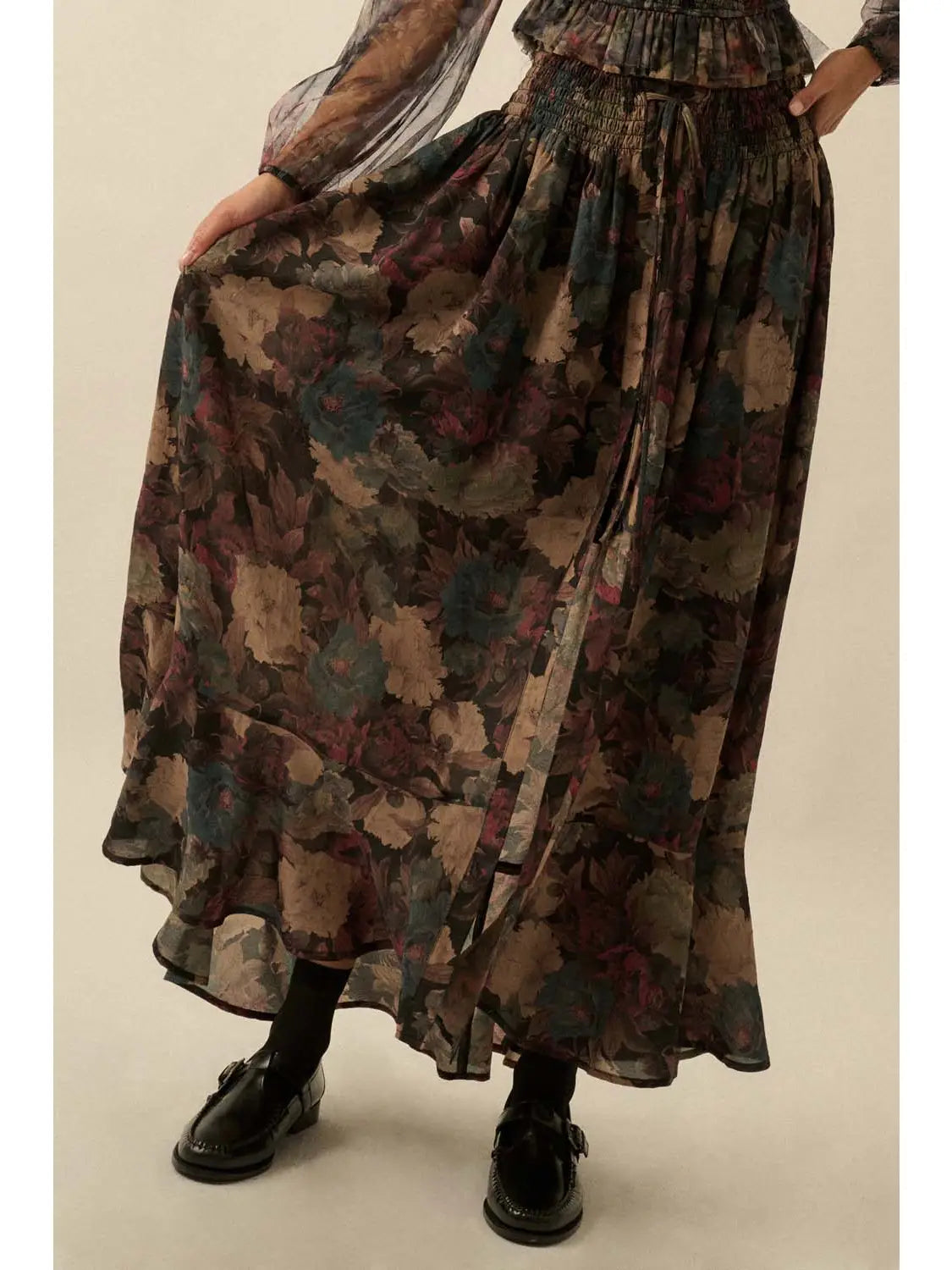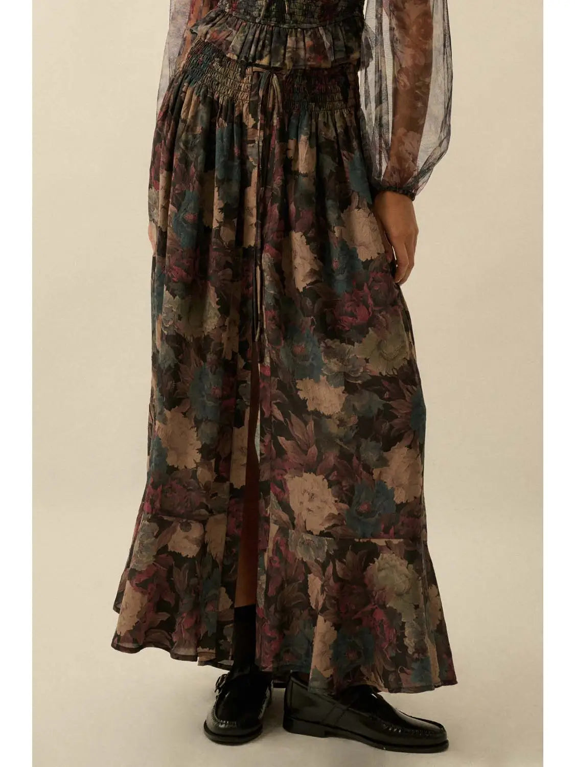 Embrace effortless elegance with this floral-print woven maxi skirt, designed for comfort and style. The wrinkle-texture fabric adds visual interest while remaining easy to care for, while the smocked elastic waistband with drawstring ensures a customizable fit. A button loop front closure and practical front slit provide functional details, and the charming ruffle hem adds movement and dimension. Featuring partial lining and a loose silhouette, this ankle-length skirt flatters all body types and transitions seamlessly from casual days to evening occasions.