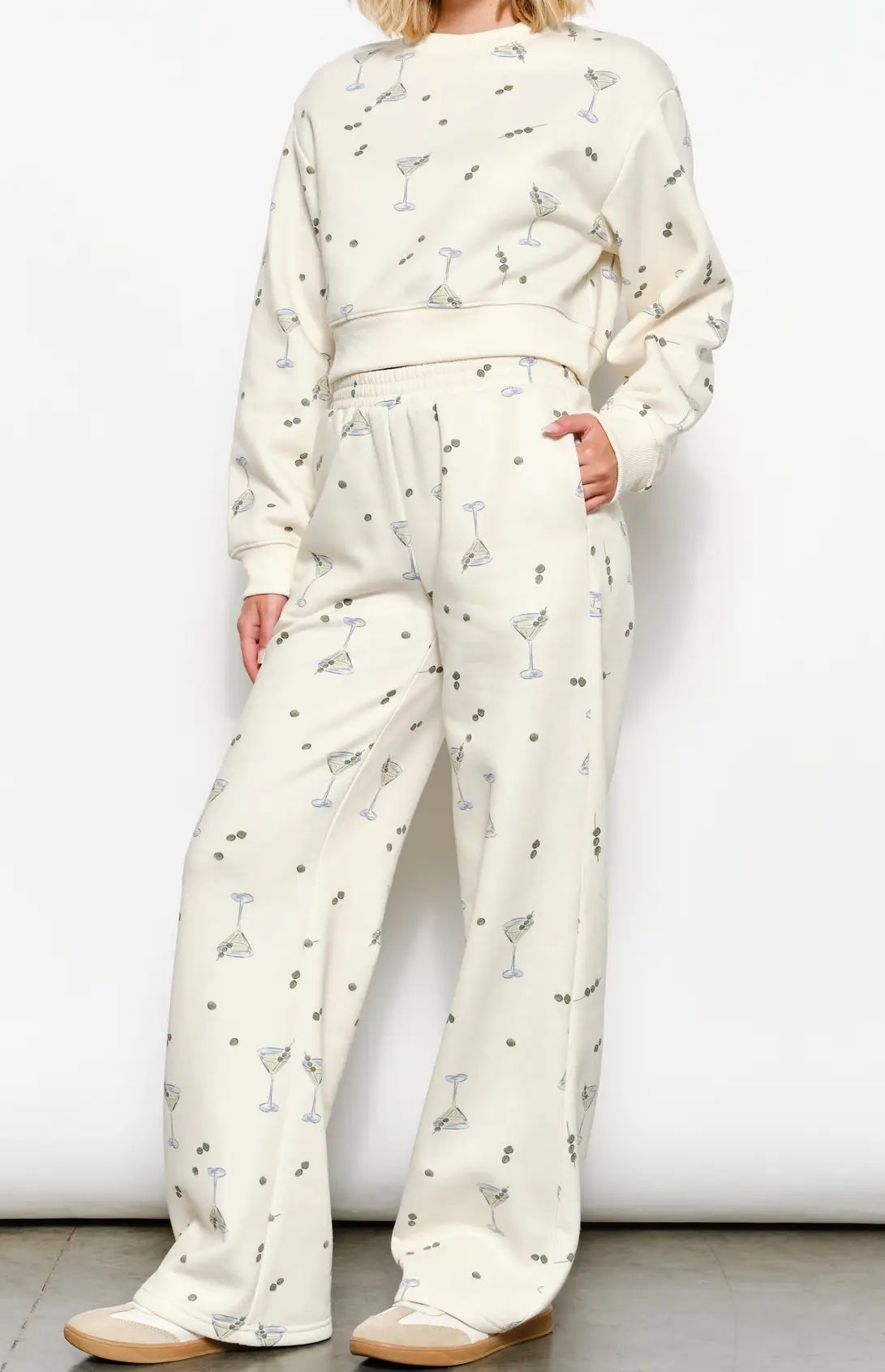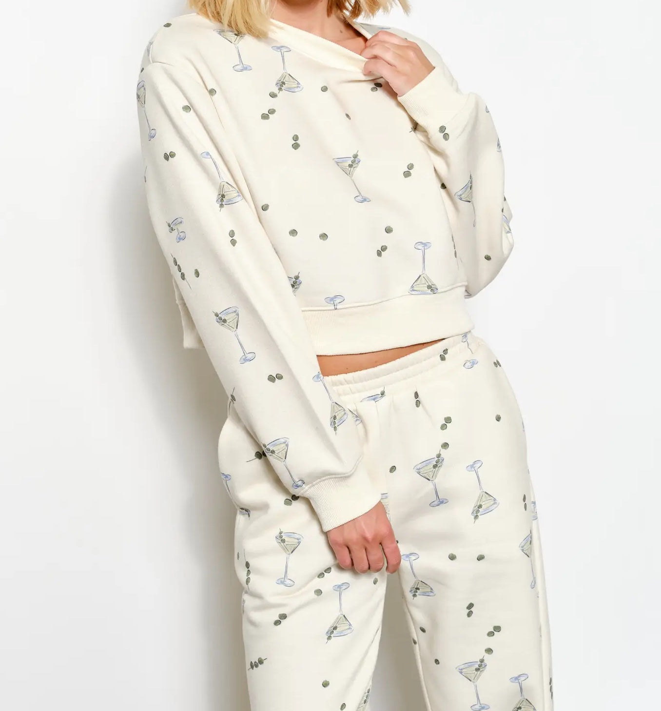 Raise a toast to style with the MARTINI SWEATSHIRT—a playful piece that celebrates good times in comfort. This cropped sweatshirt features an exclusive martini print that instantly elevates your casual rotation with personality and charm. Long sleeves provide cozy warmth while the modern cropped cut flatters your frame and works beautifully for layering over tees or under jackets. Whether you're heading out for brunch or keeping it casual at home, this sweatshirt brings a fun, flirty energy to every outfit.