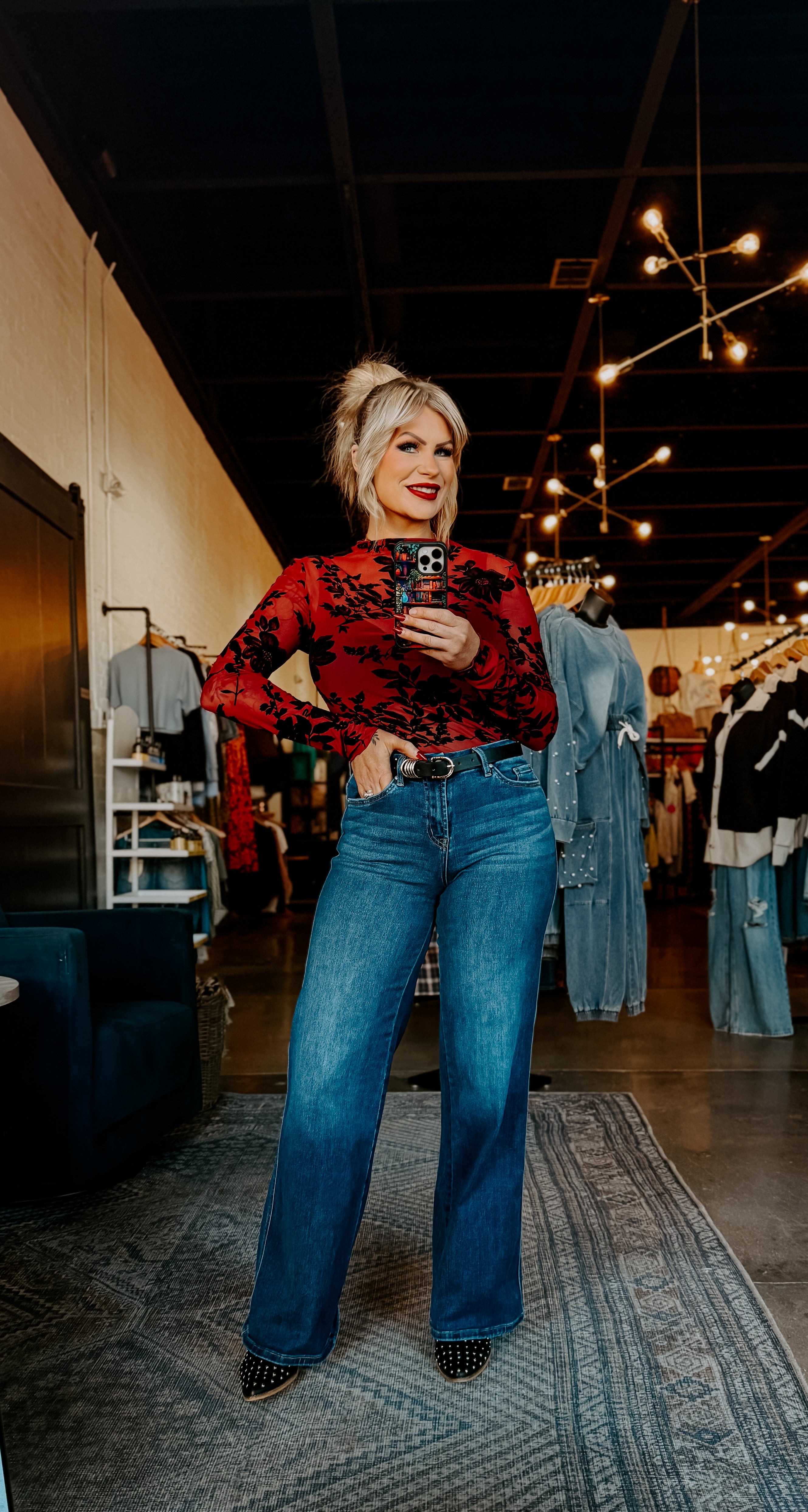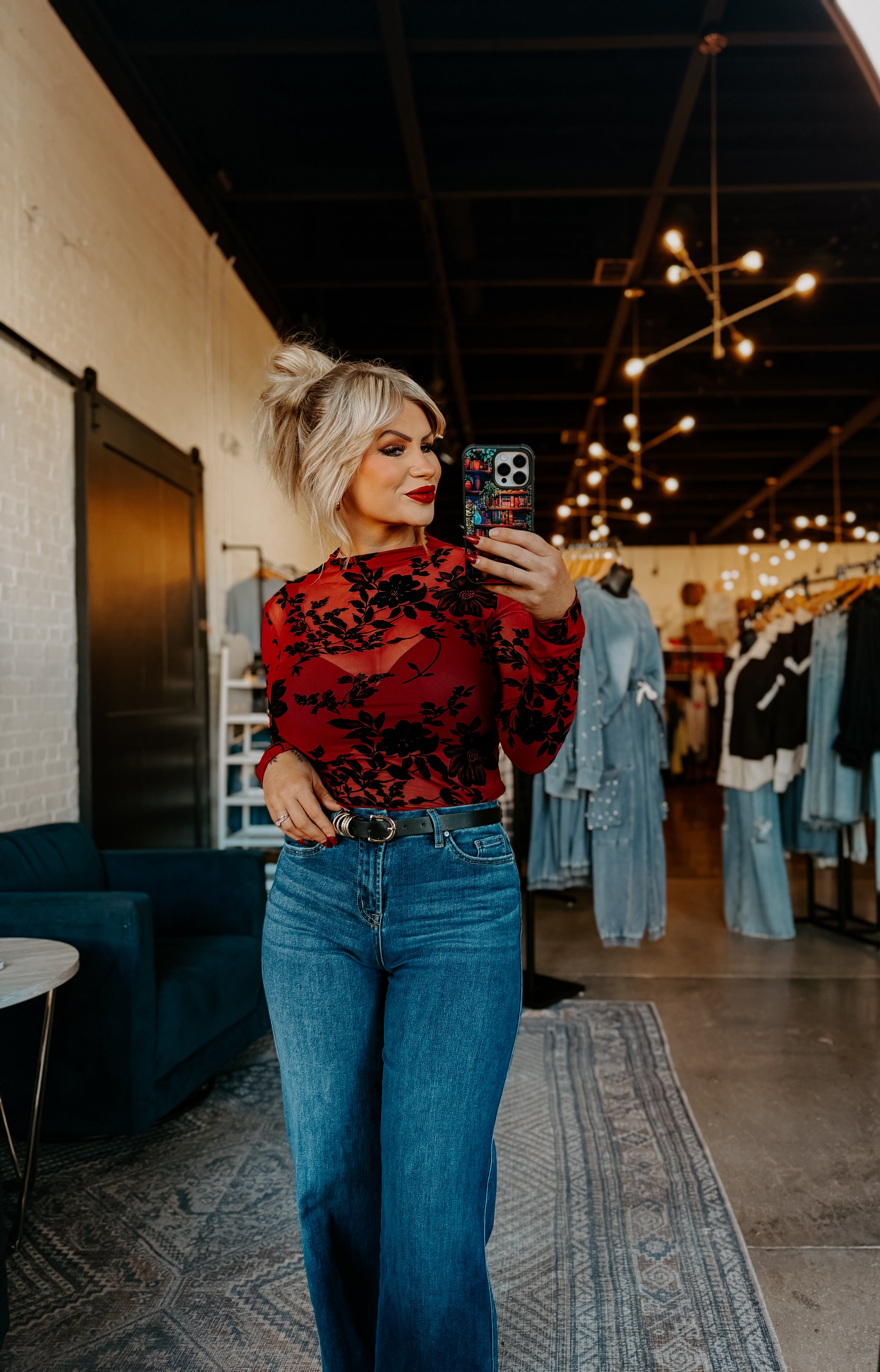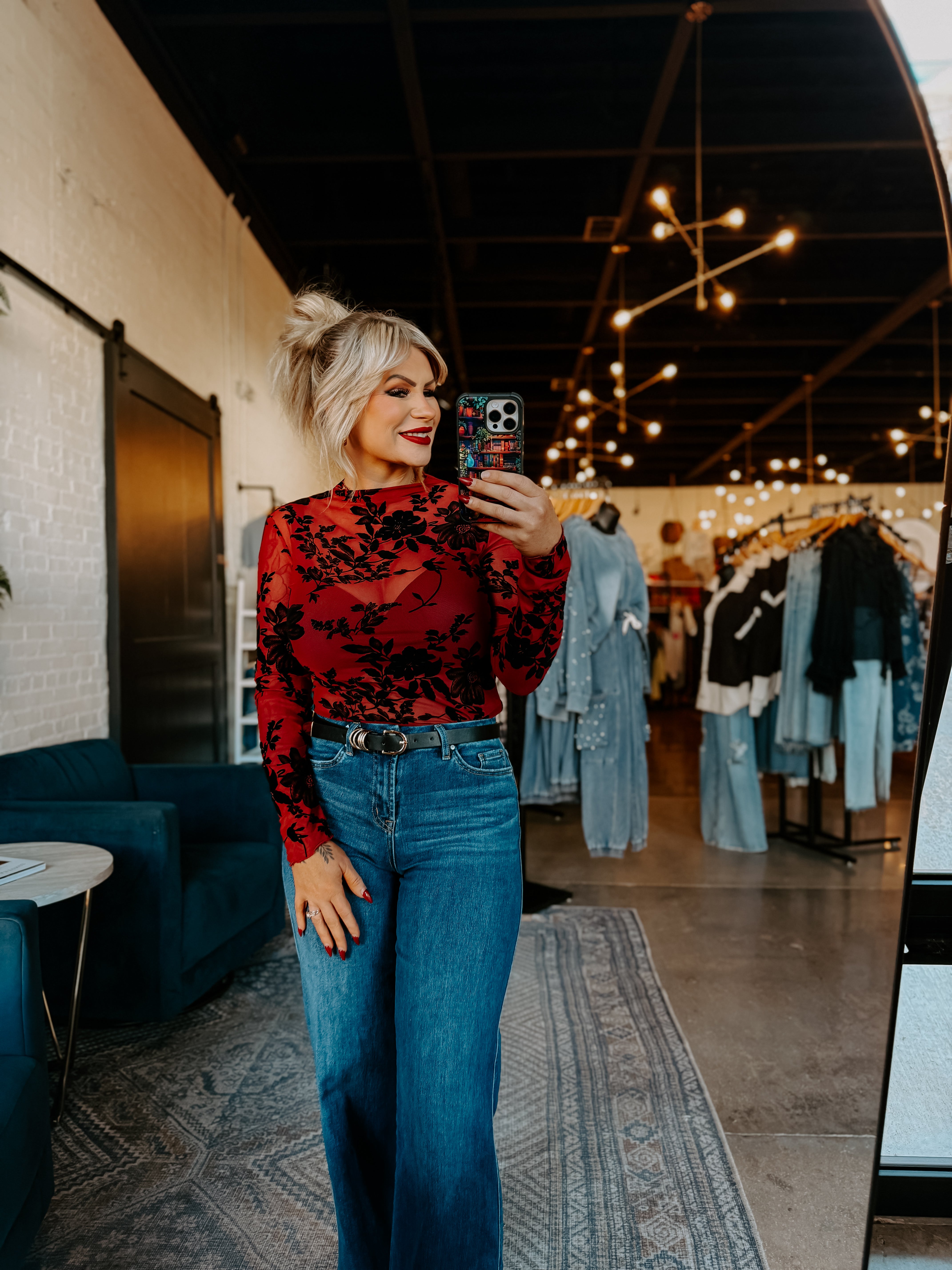Elevate your everyday wardrobe with this stunning sheer mesh top featuring delicate floral flocking that catches the light beautifully. The mock neck design offers a sophisticated silhouette while long sleeves provide versatile coverage for any season. The intricate floral print adds texture and visual interest, making this piece perfect for layering or wearing solo over a slip. Whether you're dressing up for an evening out or adding dimension to casual looks, this top delivers effortless elegance with its modern construction and timeless appeal.