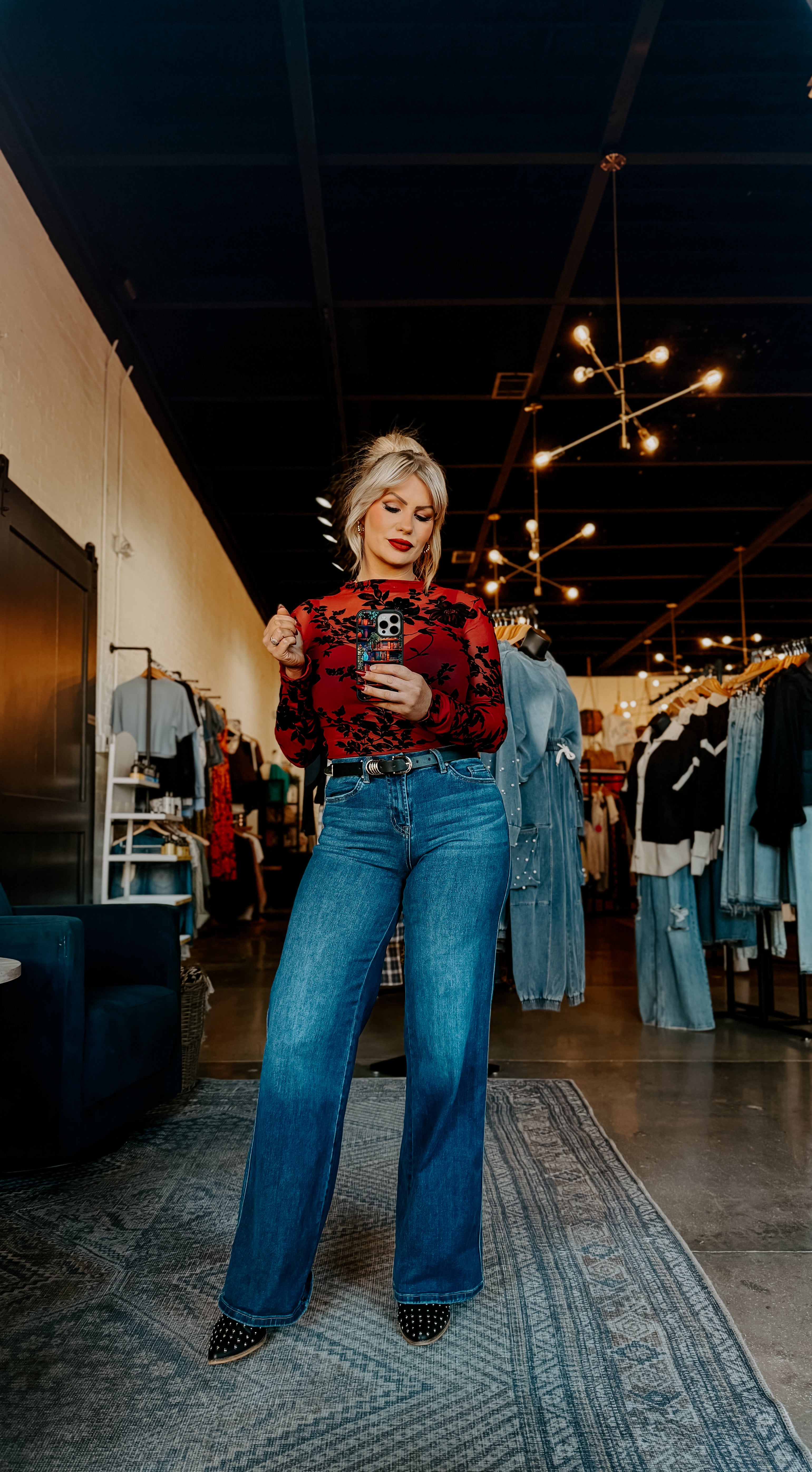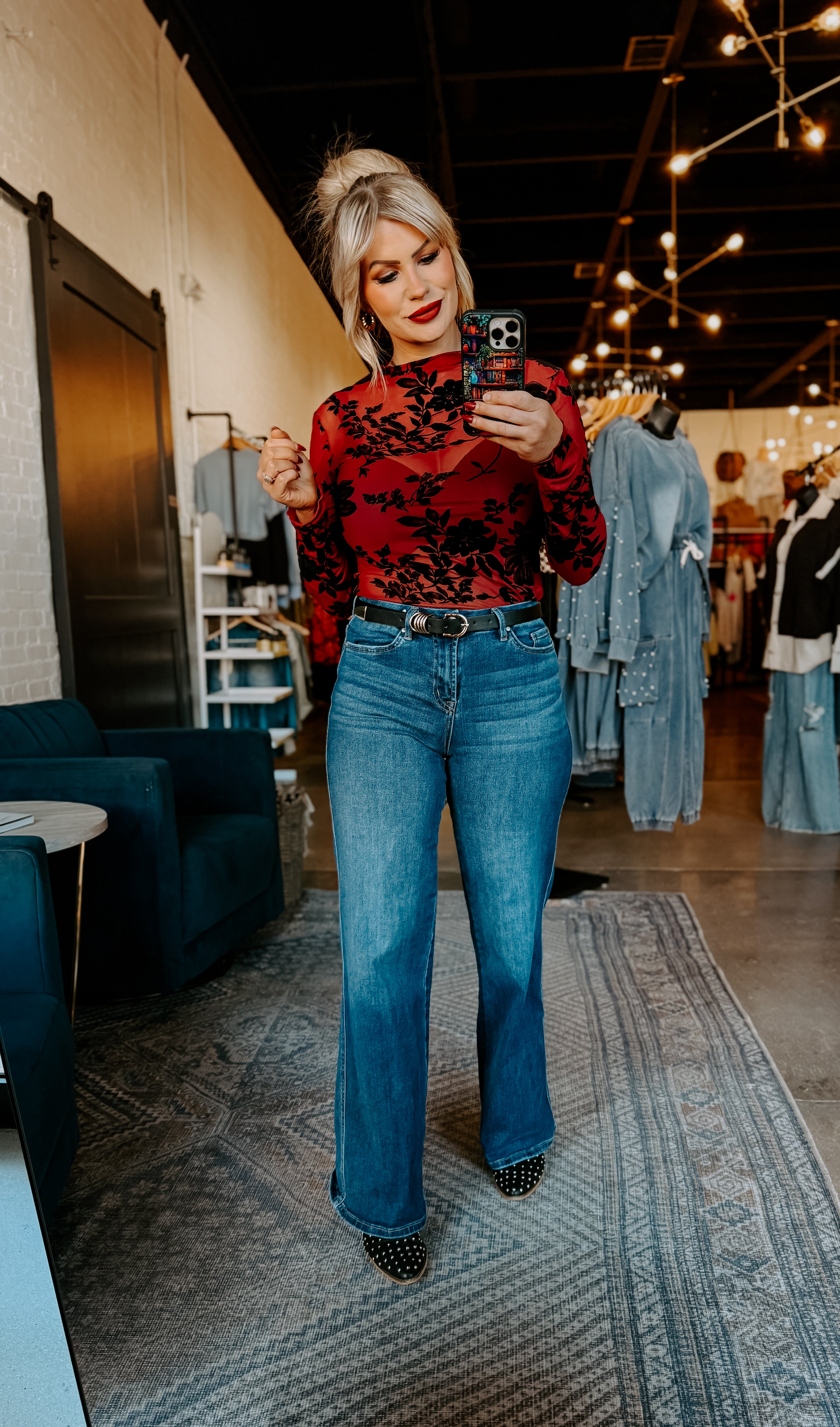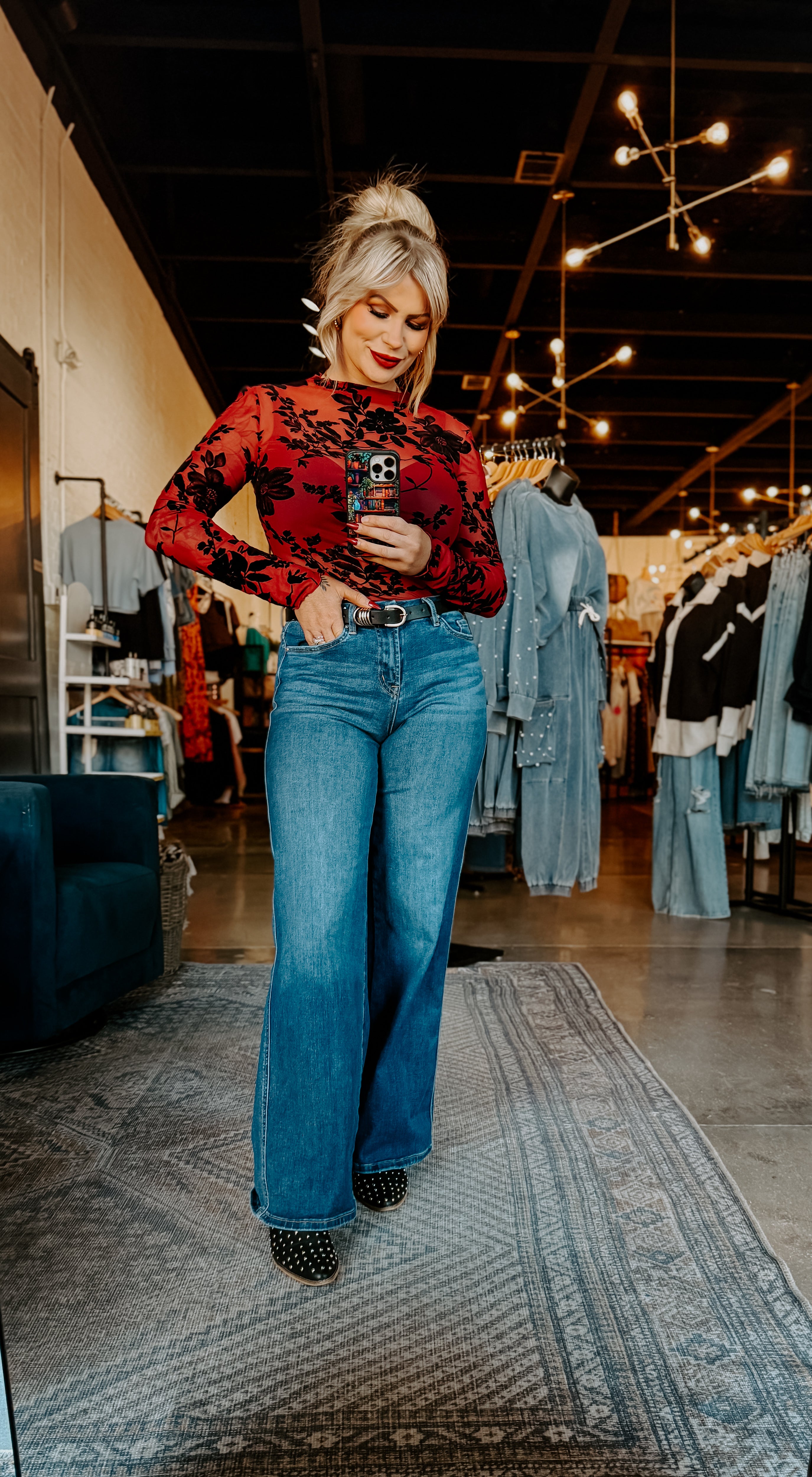 Elevate your everyday wardrobe with this stunning sheer mesh top featuring delicate floral flocking that catches the light beautifully. The mock neck design offers a sophisticated silhouette while long sleeves provide versatile coverage for any season. The intricate floral print adds texture and visual interest, making this piece perfect for layering or wearing solo over a slip. Whether you're dressing up for an evening out or adding dimension to casual looks, this top delivers effortless elegance with its modern construction and timeless appeal.