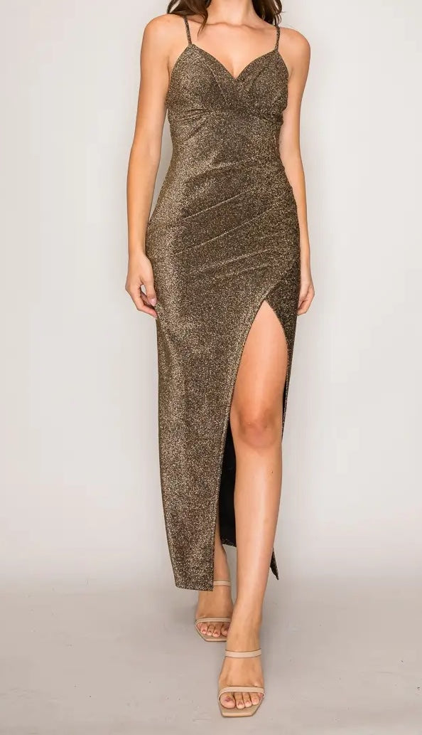 Elevate your evening with the Night Our Dress, a stunning maxi that commands attention. This sleek silhouette features a flattering sweetheart neckline and delicate spaghetti straps that frame the shoulders beautifully. The pleated wrap bodice creates a refined, sculpted look while the front slit adds an alluring touch of sophistication. Crafted from a luxurious lurex knit blend, this dress shimmers with every movement, catching light and turning heads all night long. The metallic shimmer combined with premium stretch ensures you'll feel as confident as you look. Perfect for galas, celebrations, or any occasion where you want to make an unforgettable impression.