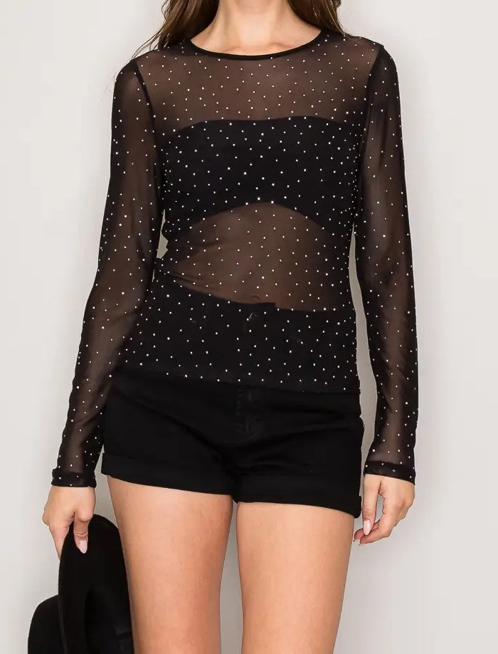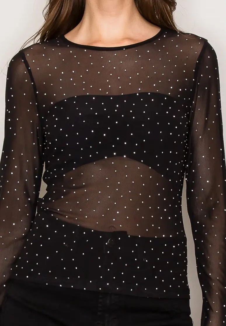 Elevate your everyday style with this stunning rhinestone embellished mesh long sleeve knit top. Crafted from stretch power mesh in a luxurious polyester-spandex blend, this piece offers both comfort and glamour. The all-over rhinestone detailing catches the light beautifully, making it perfect for nights out or special occasions. Features a classic crew neck and long sleeves for versatile layering. The unlined design keeps things lightweight and breathable, while the stretch fabric moves with you