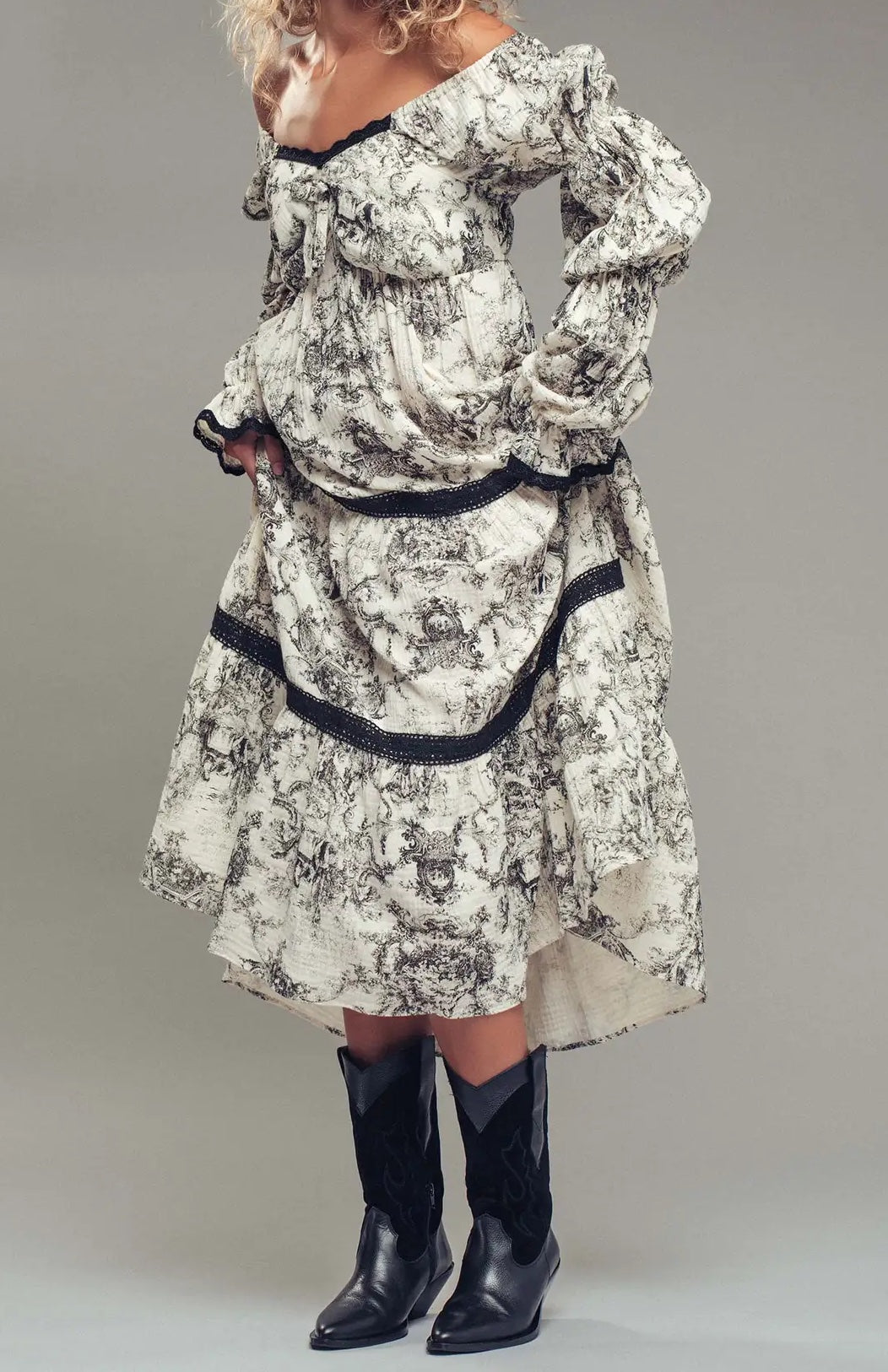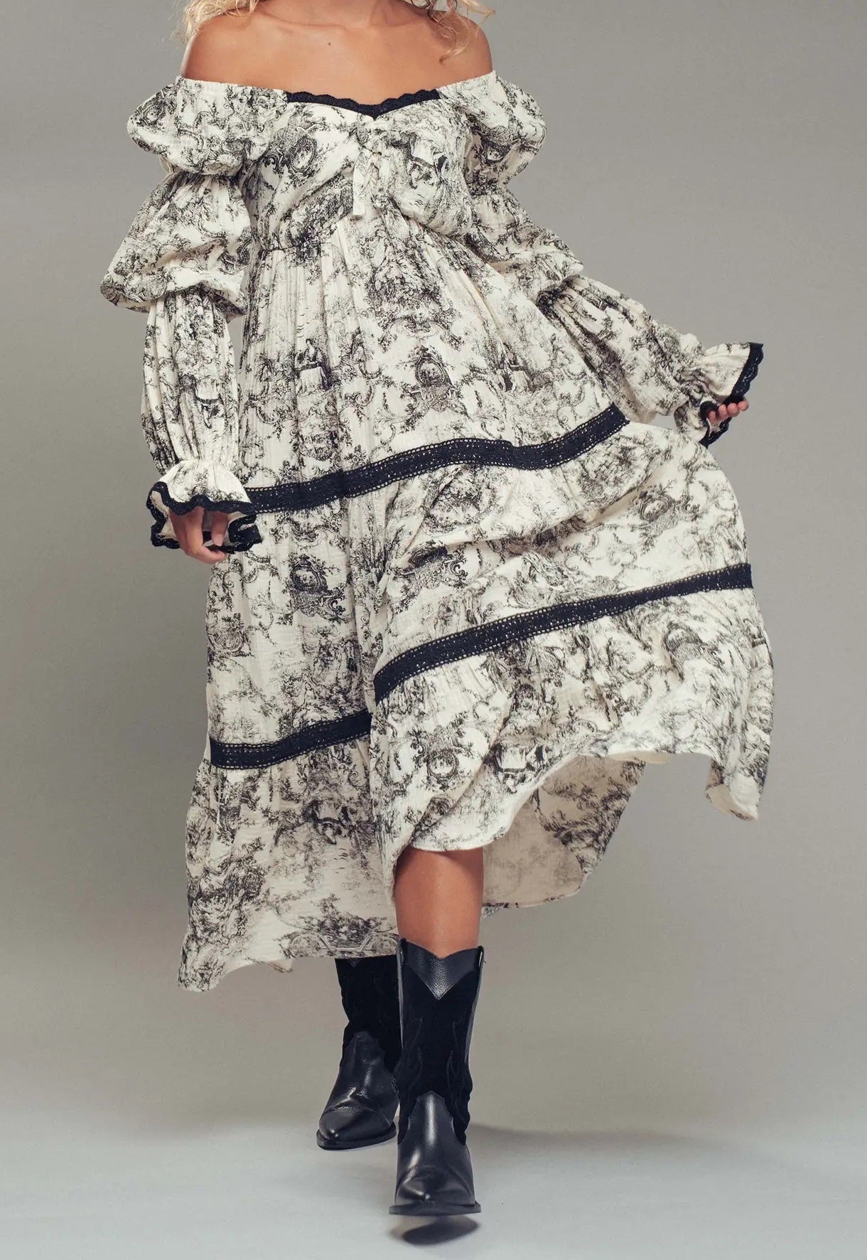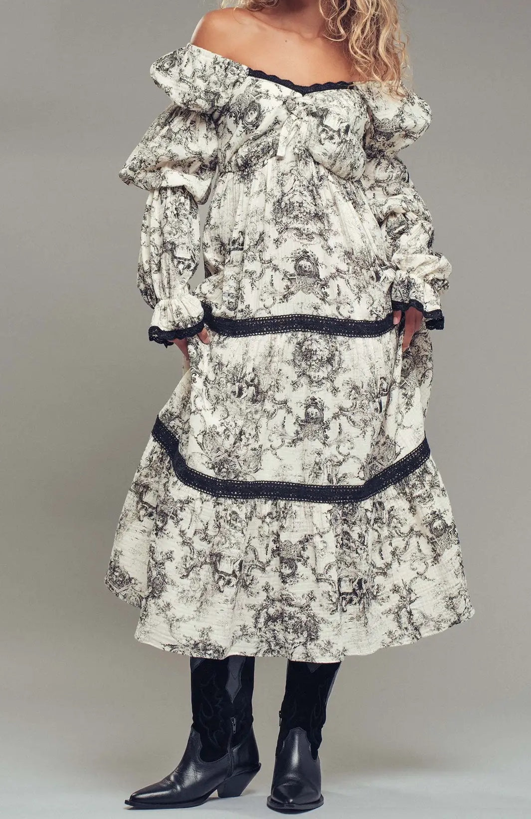 Embrace timeless elegance with this romantic midi dress, designed to turn heads at any special occasion. The off-shoulder neckline and voluminous layered puff sleeves create an enchanting silhouette, while delicate lace trim adorns the gracefully tiered skirt. A shirred bodice ensures a flattering fit that flatters every figure. Crafted from soft cotton with polyester-blend accents, this vintage-inspired piece transitions effortlessly from garden parties to evening celebrations. Perfect for those seeking understated sophistication with romantic flair.