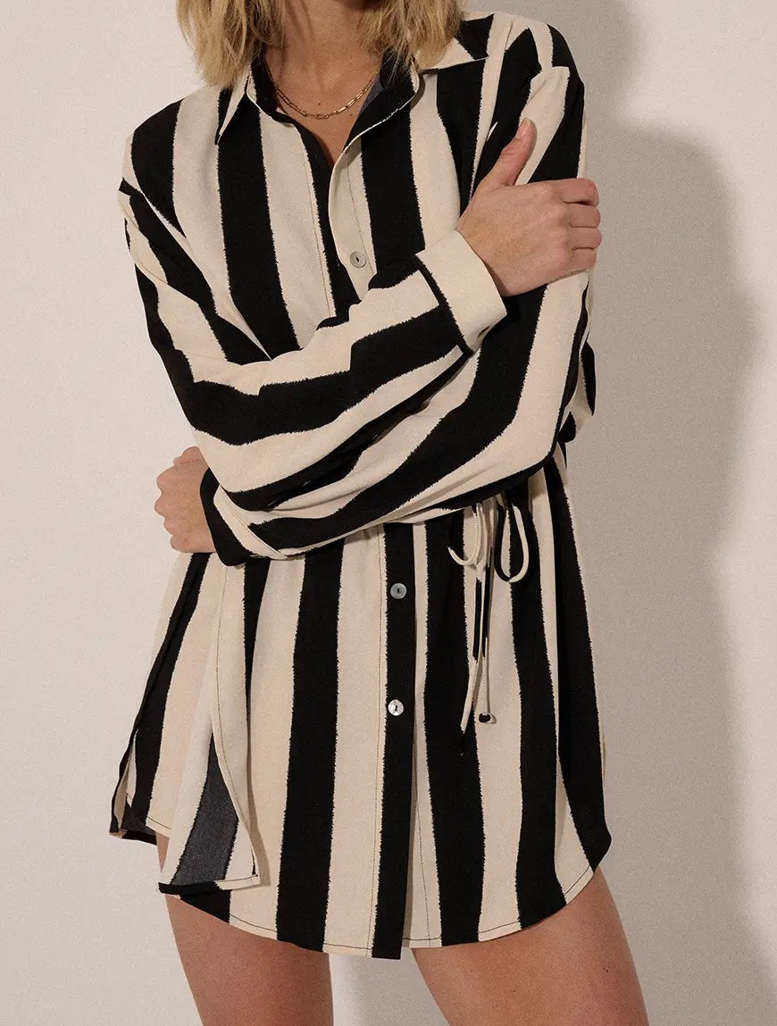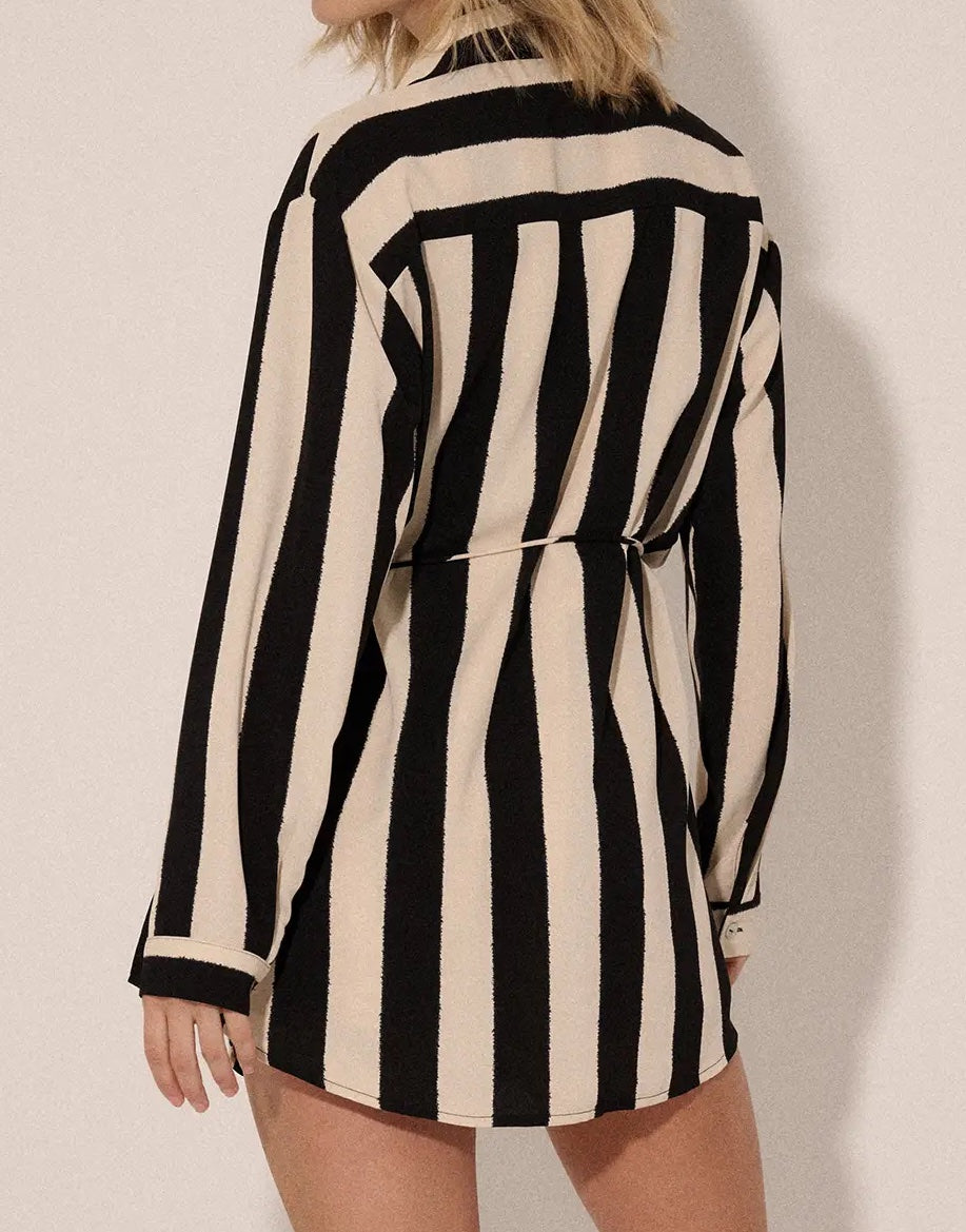Effortlessly chic and undeniably comfortable, this striped woven romper combines timeless style with practical design. The classic collar and button front create a polished look, while dropped shoulders and a relaxed fit offer modern ease. Long sleeves with buttoned cuffs add versatility for layering, and the curved back hem provides flattering movement. Functional side pockets keep essentials close, side slits enhance mobility, and the yoke back ensures a structured silhouette. Lined shorts and a relaxed cut make this the perfect piece for transitioning from casual days to evening outings with confidence and comfort.