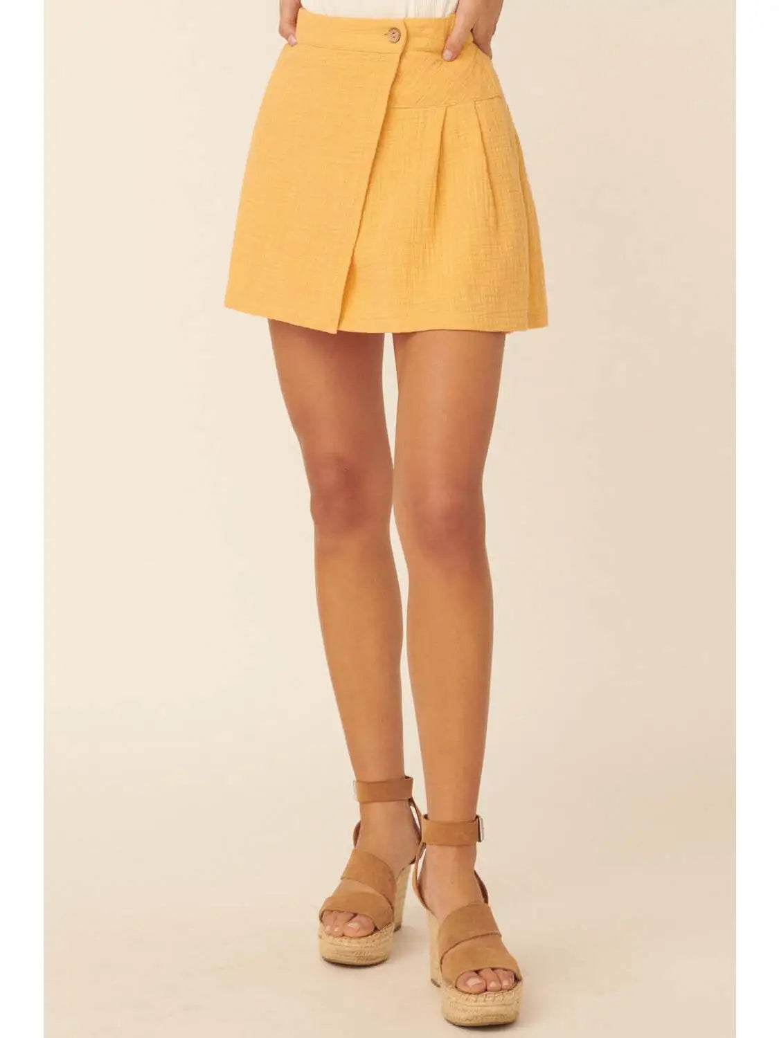 This mini skirt features a solid woven fabric designed for a relaxed fit that ensures comfort throughout the day. It includes a banded waist for a secure yet flattering silhouette, complemented by a buttoned wrap detail that adds subtle sophistication. The pleated back detail enhances movement and visual interest, making it a versatile piece suitable for both casual and polished looks.