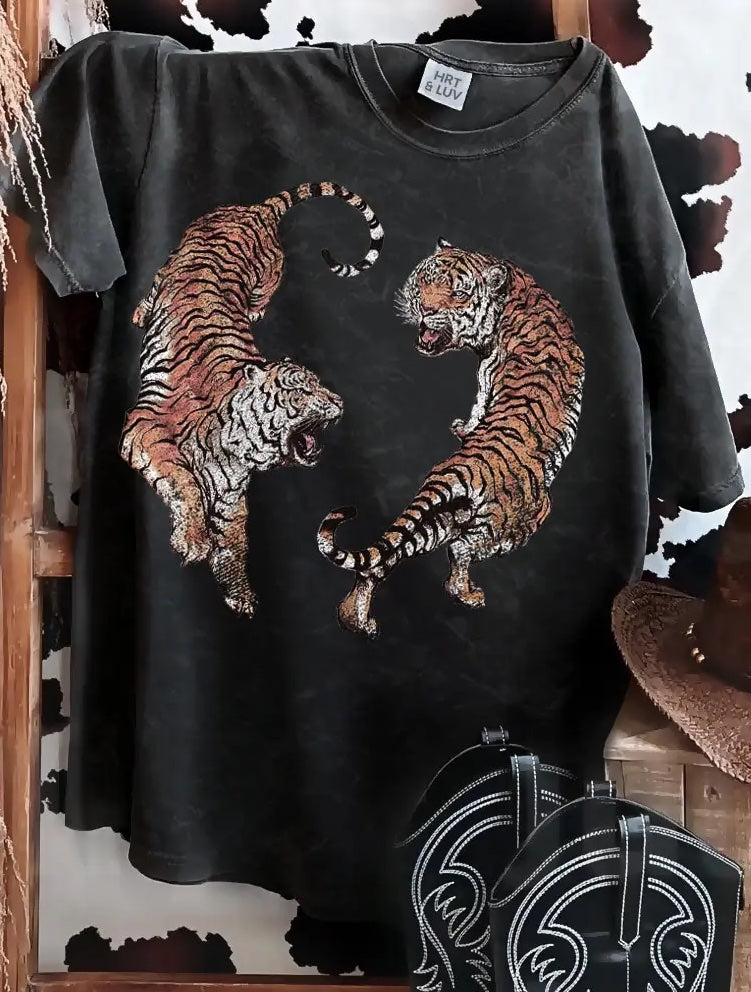 Embrace vintage style with our Tiger Tee, a women's cotton graphic top that delivers authentic retro charm with modern comfort. Our exclusive enzyme and mineral wash process creates an irresistibly soft fabric that feels broken-in from day one. Pre-shrunk for lasting fit, this screen-printed tee transitions effortlessly from casual outings to relaxed weekends. Care is simple—just cold water wash with like colors, skip the bleach, and tumble dry low to maintain that coveted worn-in feel. Available in a flattering cut (Size Small: 26" length, 20" chest). Experience the perfect blend of nostalgia and everyday wearability.