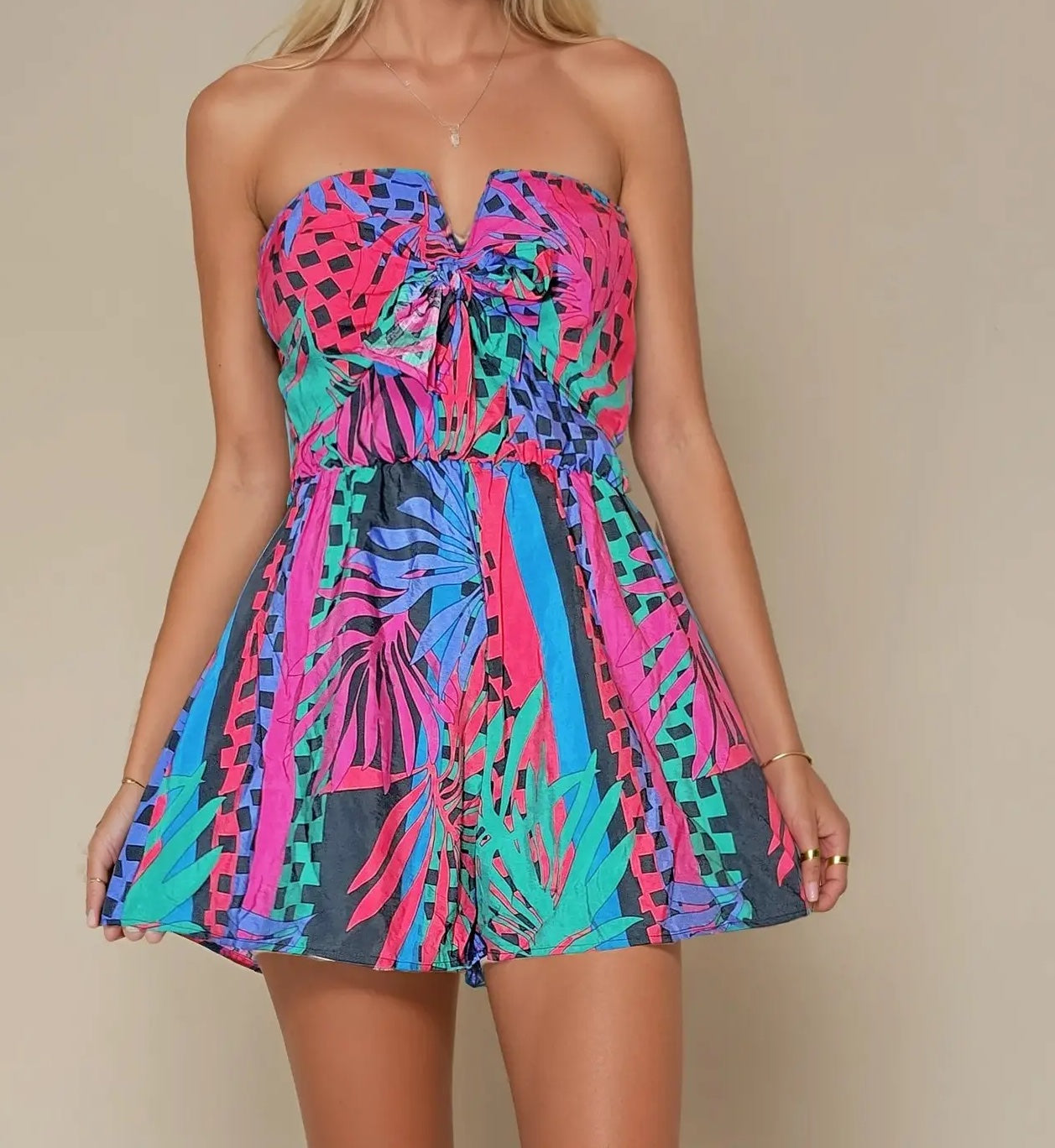 Escape to paradise in this vibrant tropical jumper, designed for effortless summer style. The flattering V-neckline and fitted tube top create a chic silhouette, while the playful printed pattern brings island-inspired flair to any occasion. Lined shorts provide comfort and coverage you can count on, making this one-piece wonder perfect for everything from beach days to casual outings. Crafted from lightweight 100% polyester, it's breathable, easy to care for, and ready for adventure. Whether you're lounging poolside or exploring a new destination, this romper delivers style without compromise.