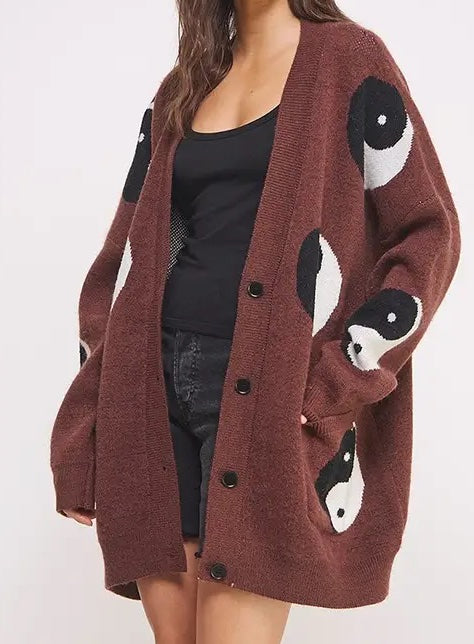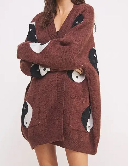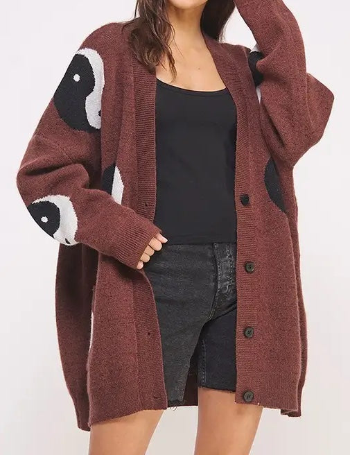 Make a statement with this plus-sized yin yang cardigan that's anything but ordinary. The oversized silhouette and striking yin yang design create an effortlessly cool aesthetic that works as a standalone dress when paired with your favorite boots. Button-up styling gives you complete control over your look, while functional front pockets add practicality to the mix. The soft V-neckline and relaxed fit flatter every figure, making this imported piece a wardrobe essential for those who refuse to compromise on style or comfort. Layer it, wear it solo, or dress it up—this cardigan adapts to your mood.