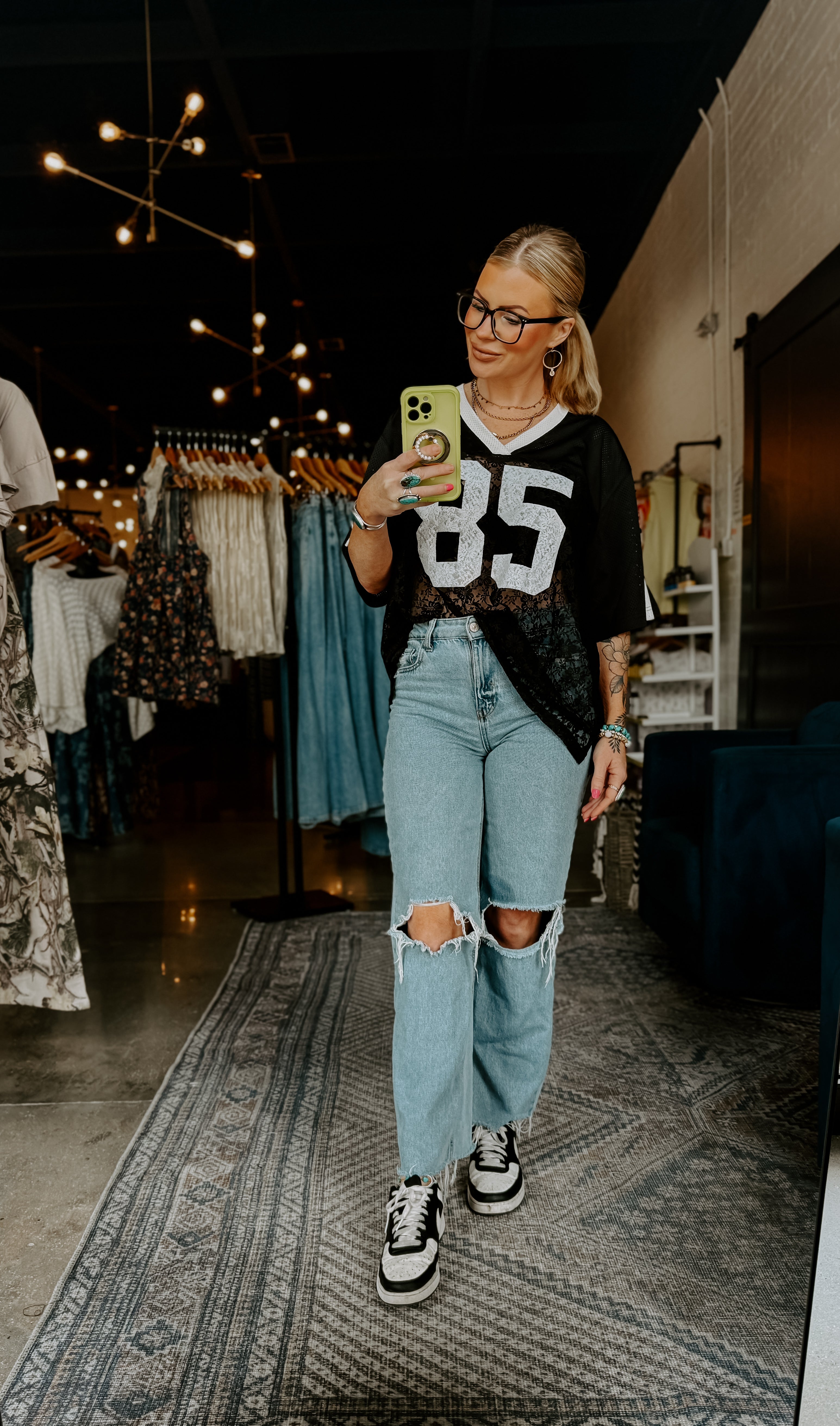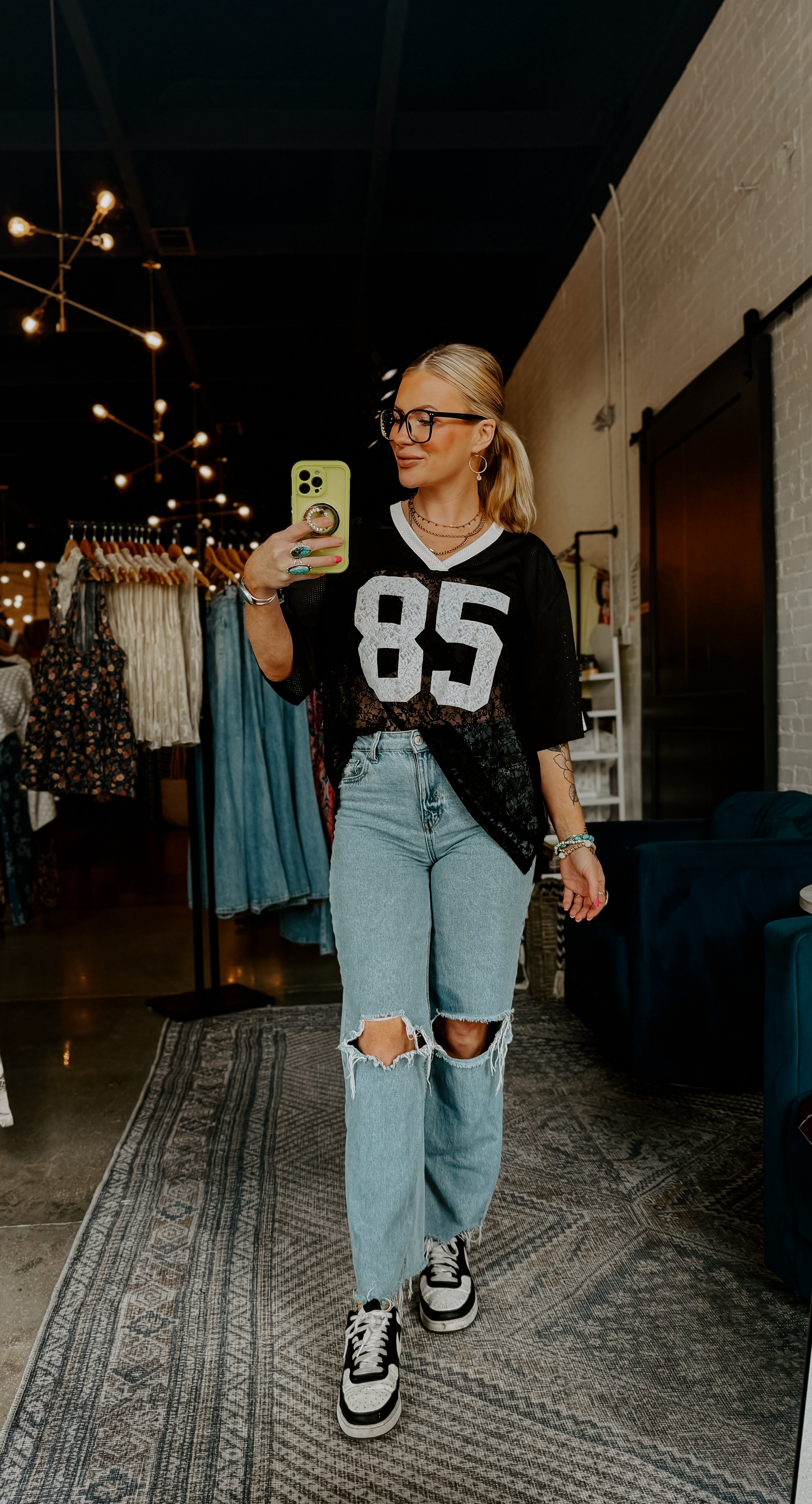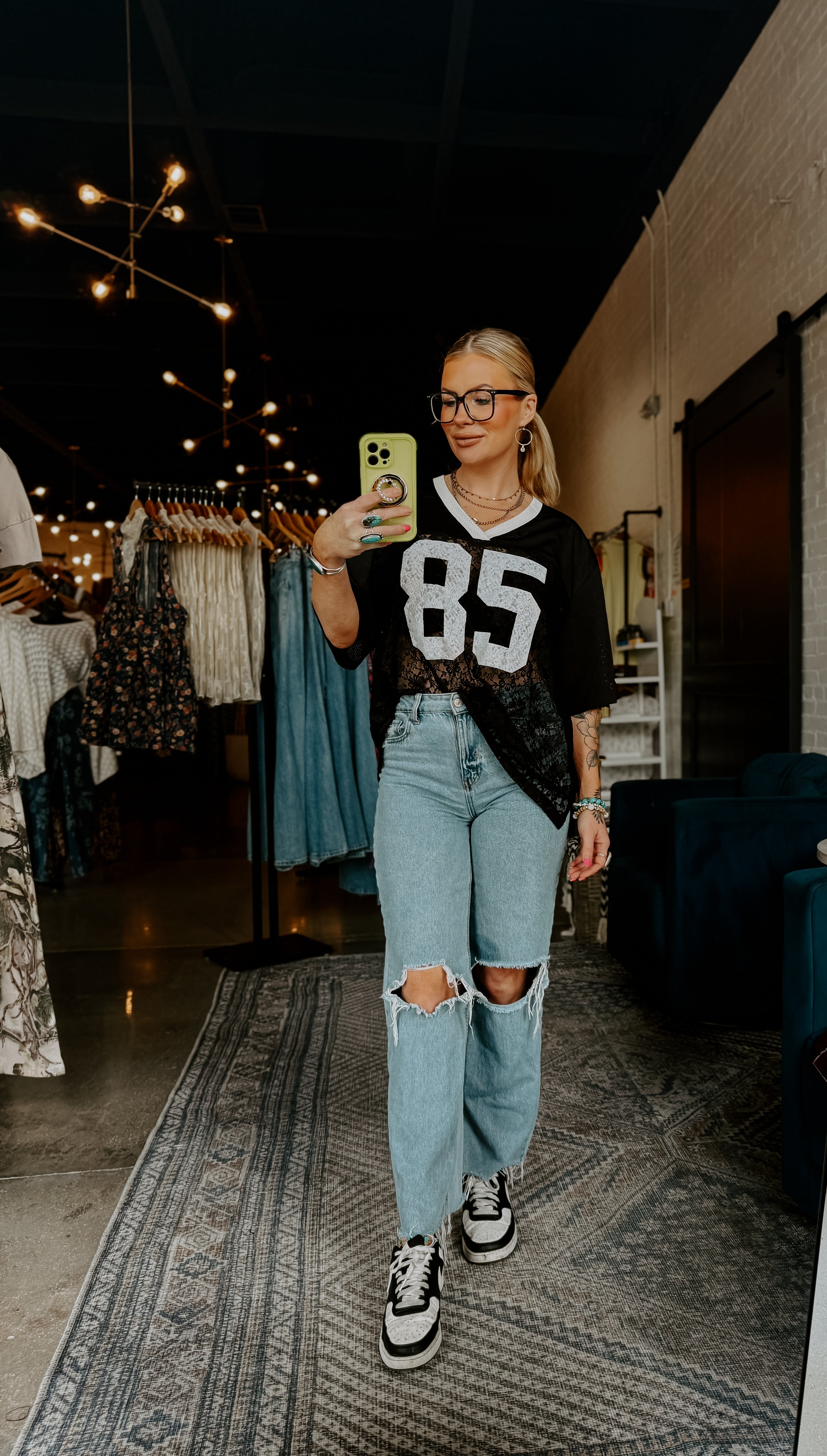 This oversized short-sleeve jersey top combines sporty functionality with feminine details. Crafted from breathable jersey mesh, it features a sheer floral lace bodice that adds subtle elegance. The bold "85" graphic on the front complements the V-neckline and dropped shoulders, both highlighted by contrast stripes. Side slits enhance mobility and style, while the relaxed fit ensures comfort. Ideal for pairing with shorts and sneakers, this top offers a chic, athletic look perfect for casual weekend wear.