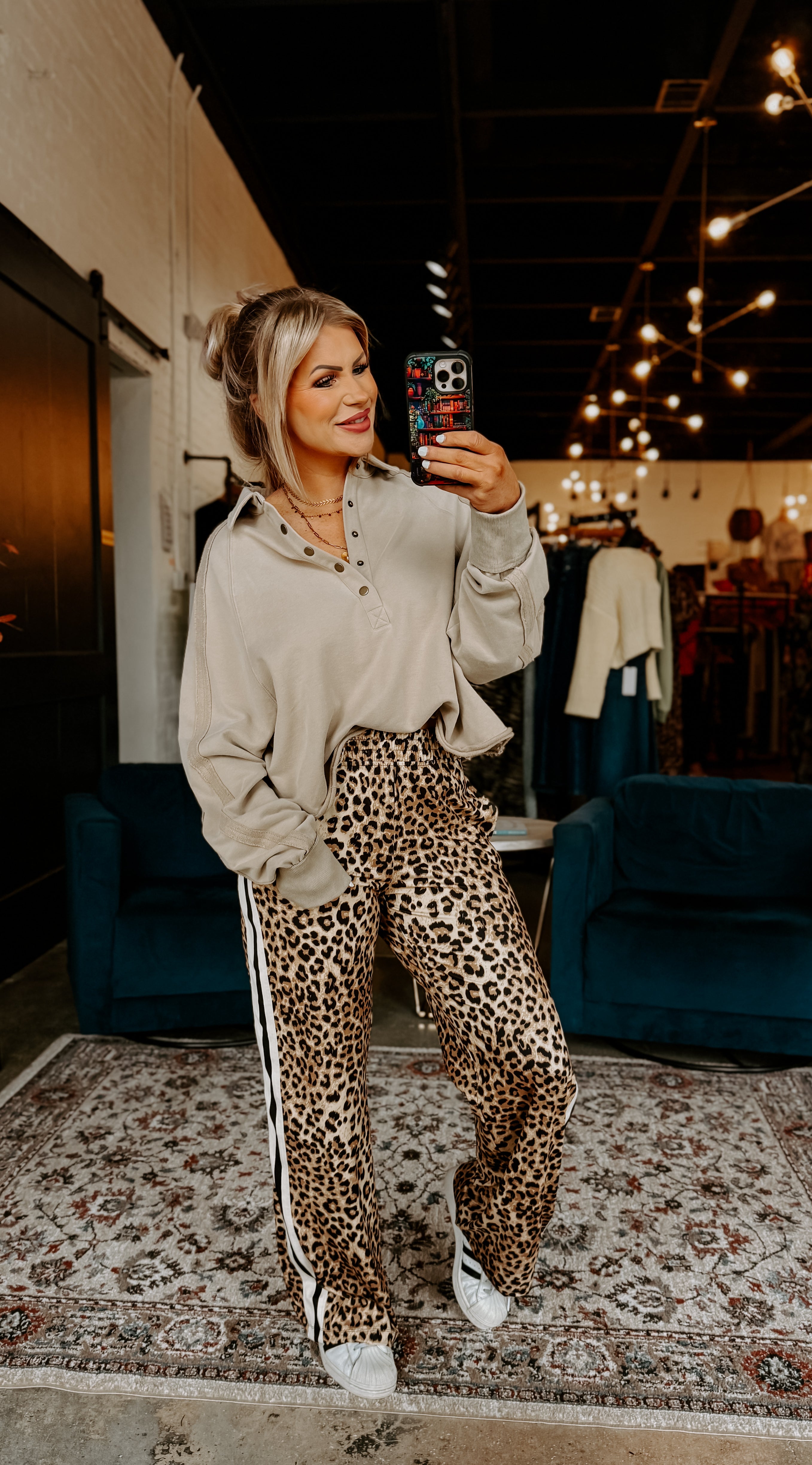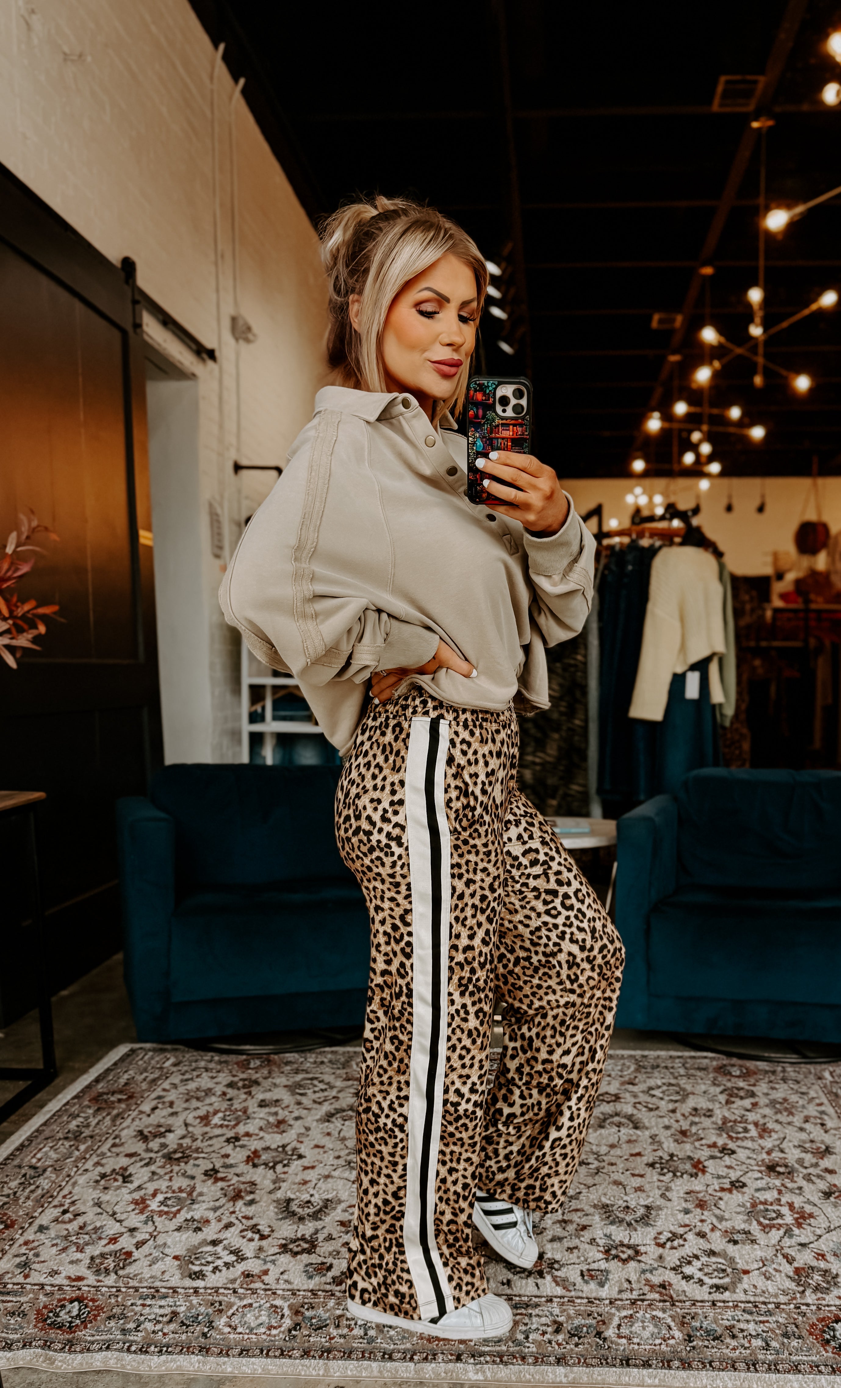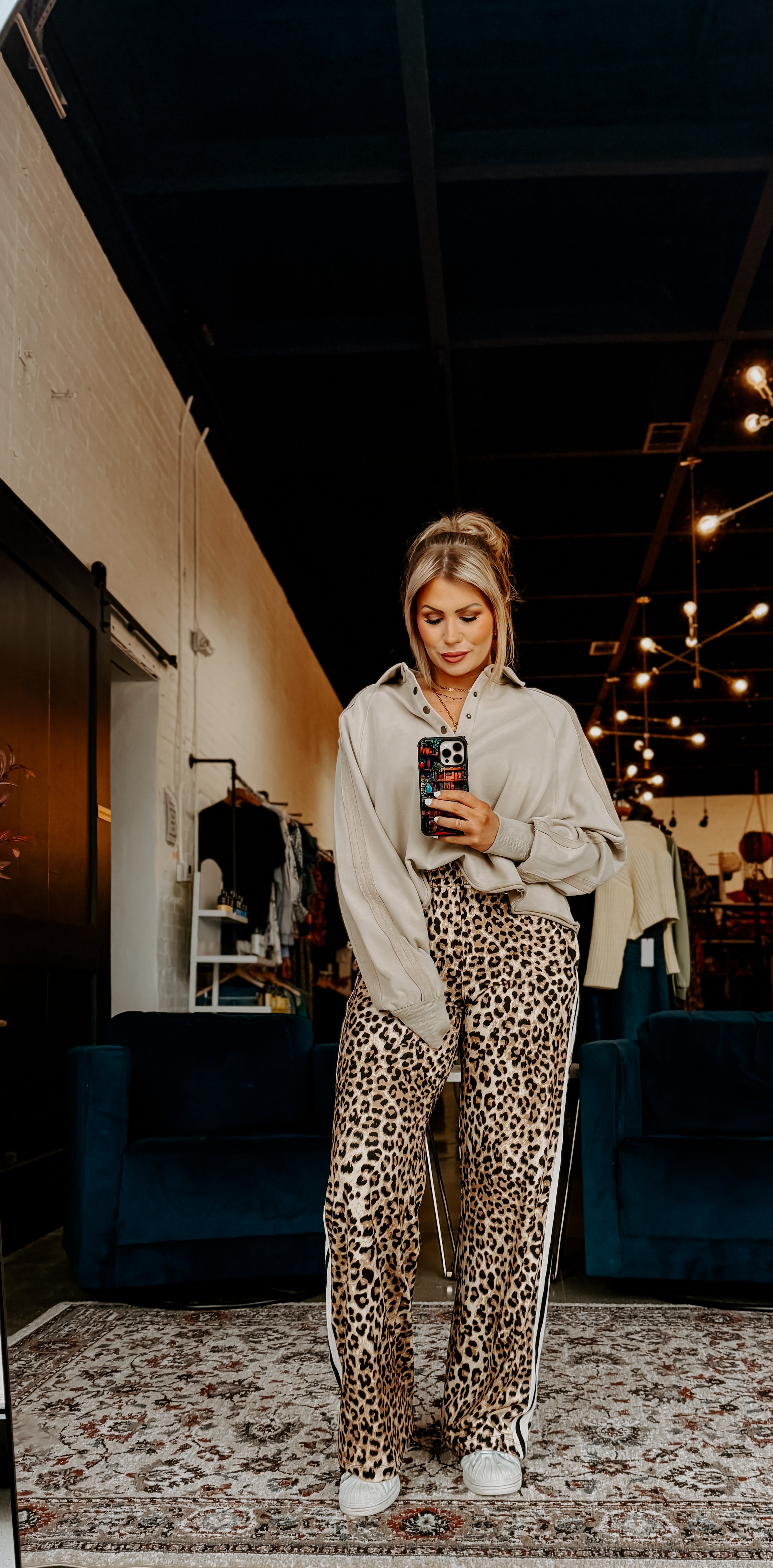 Slip into ultimate comfort with our Animal Butter Pants, crafted from incredibly soft fabric that feels like a gentle embrace. These leopard-print bottoms feature sleek stripes running down the outer seams, creating a modern edge that elevates any casual look. Perfect for lounging at home or stepping out in style, the luxurious softness makes them impossible to resist. The striking animal print paired with contrasting stripes delivers effortless sophistication without sacrificing the cozy feel you crave. Experience the perfect blend of fashion-forward design and cloud-like comfort.