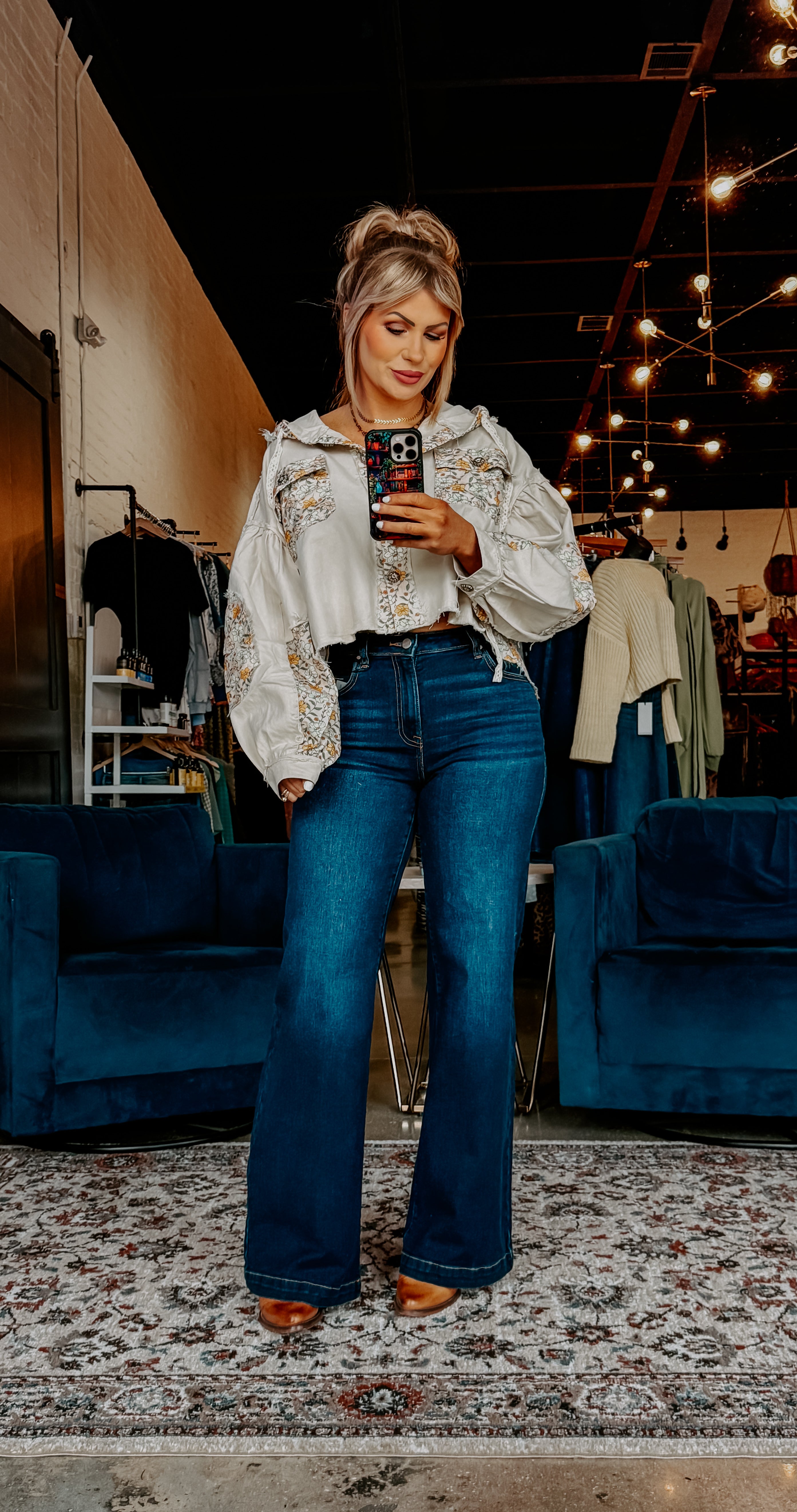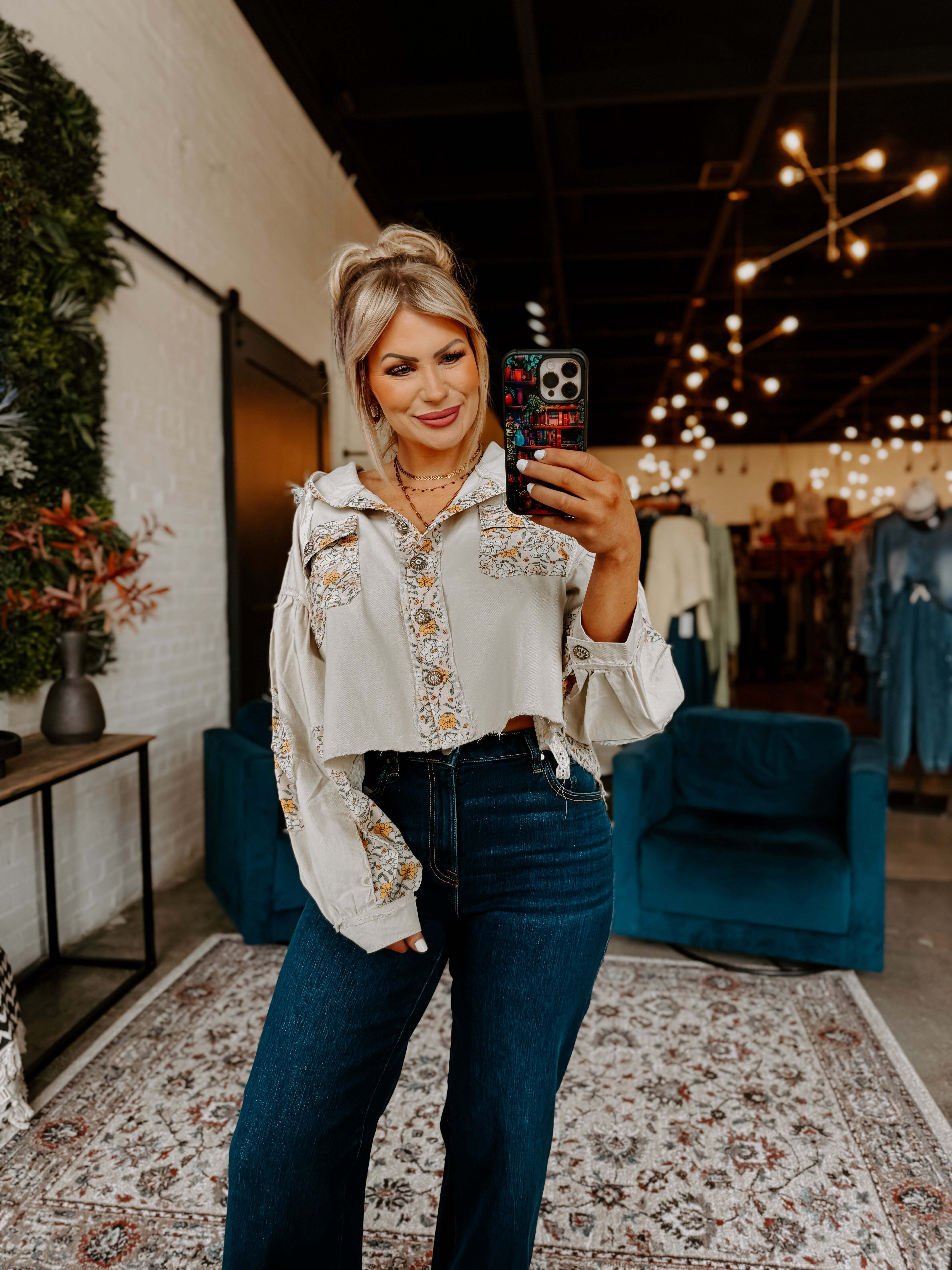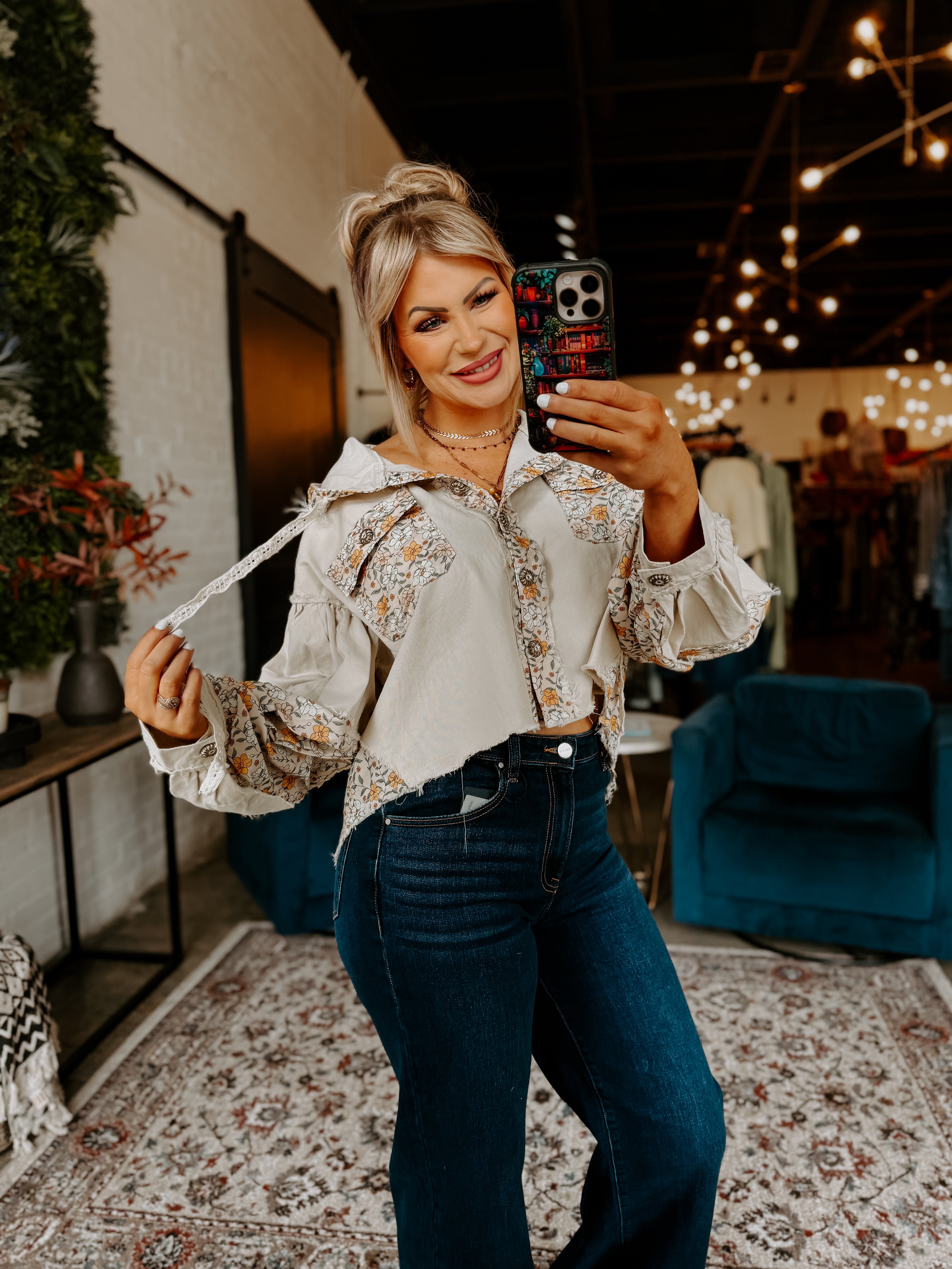 Elevate your wardrobe with this striking cropped twill top, featuring a sophisticated placket jacket design that commands attention. The voluminous balloon sleeves add contemporary flair, while the frayed edges and delicate pointed floral pattern create visual interest and texture. Cut to a flattering cropped length, this piece transitions seamlessly from casual outings to elevated occasions. The structured twill fabric ensures durability and maintains its shape, making it a versatile staple you'll reach for again and again. Perfect for layering or wearing solo, this top brings effortless style and personality to any ensemble.