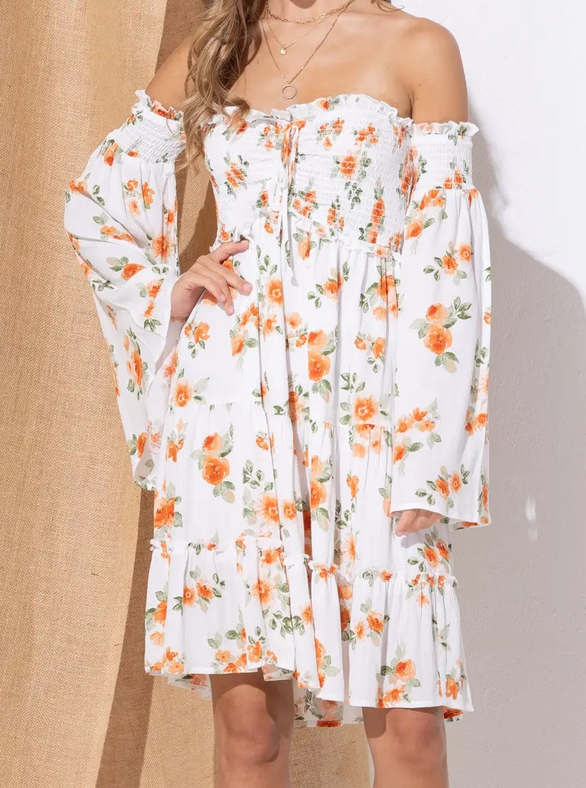 This Floral Rayon Crinkle Smocked Front Cinch Tie Bell sleeve Tiered Mini Dress features a unique smocked front design and a cinch tie to accentuate your figure. Made with lightweight, breathable rayon fabric, it offers both comfort and style. The tiered skirt creates a flowy, feminine silhouette that is perfect for any occasion.