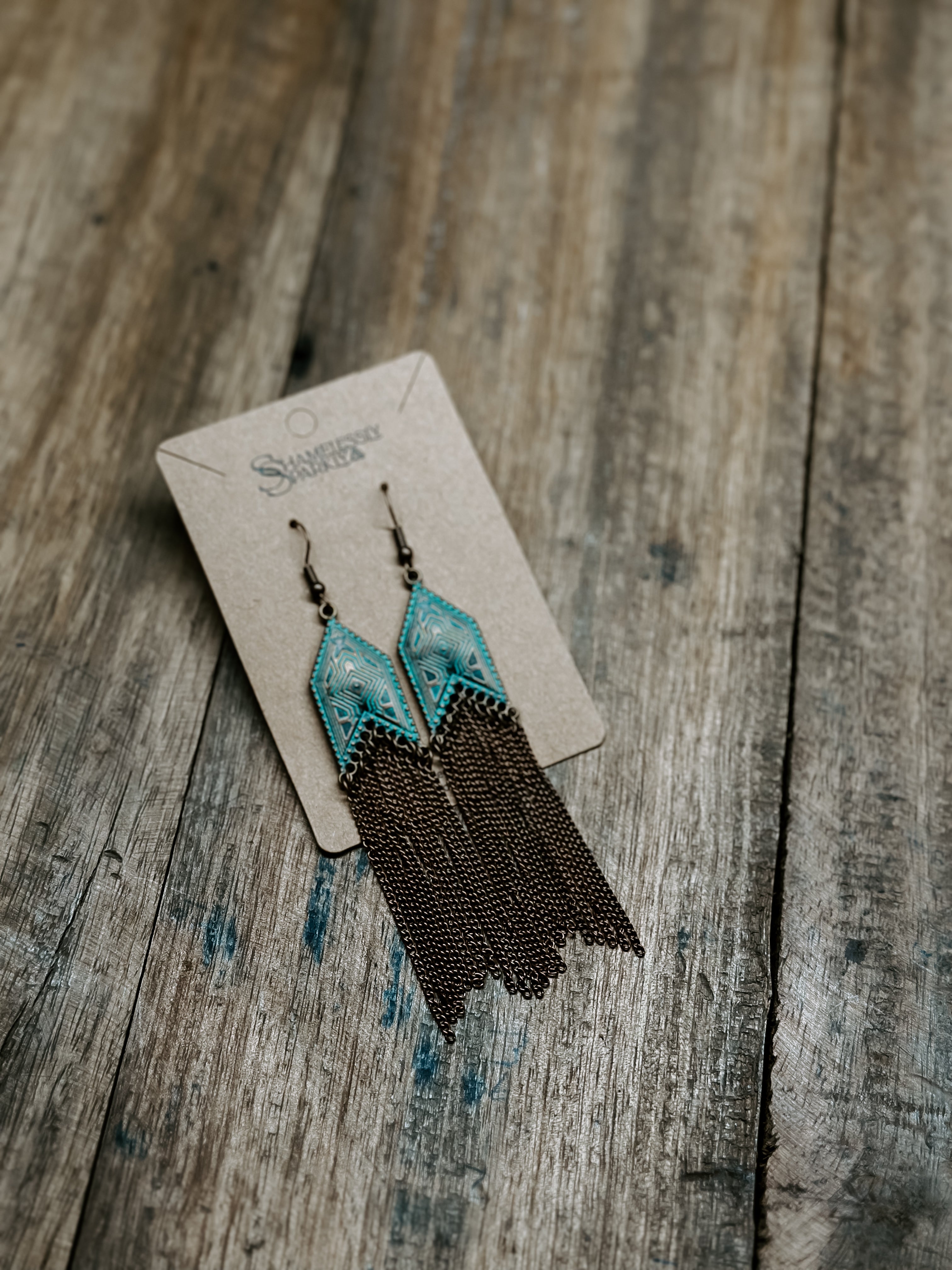 Add some boho flair to your style with our Boho Metal Drop Earrings! These Bohemian Patina Turquoise Earrings are approximately 0.75"x4.1" and will make a bold statement. Embrace your adventurous side and stand out from the crowd with these unique earrings!
