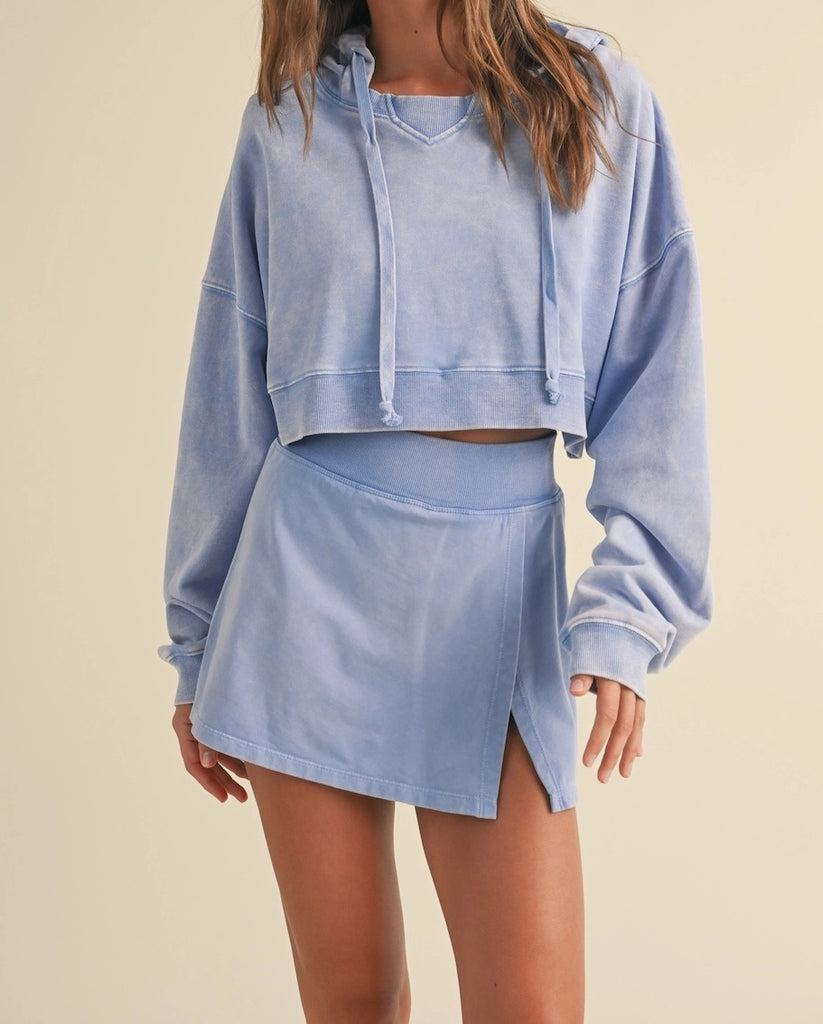 Effortlessly chic, our dropped shoulder and boxy silhouette top is designed for ultimate comfort and style. With a cropped length and adjustable drawstrings, this top can be worn at home or after your workout. Made with 85% cotton and 15% polyester for a luxurious feel. Elevate your loungewear game with this must-have piece.