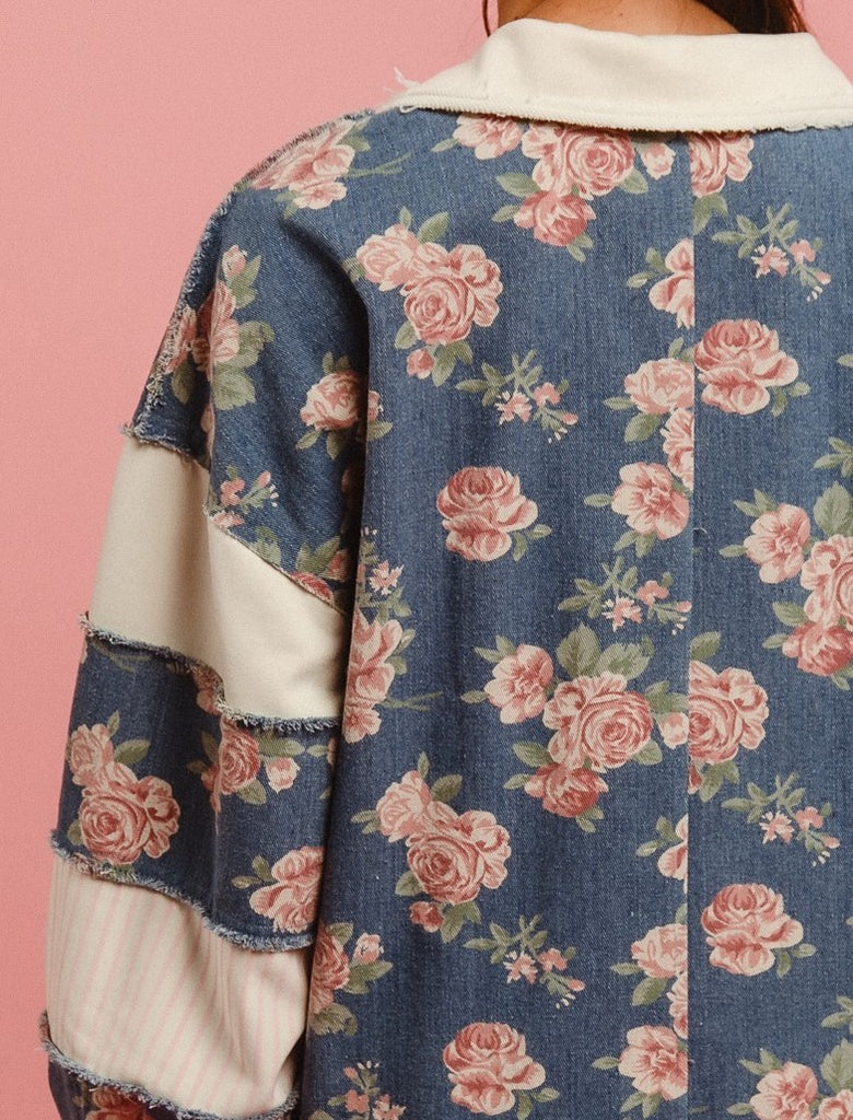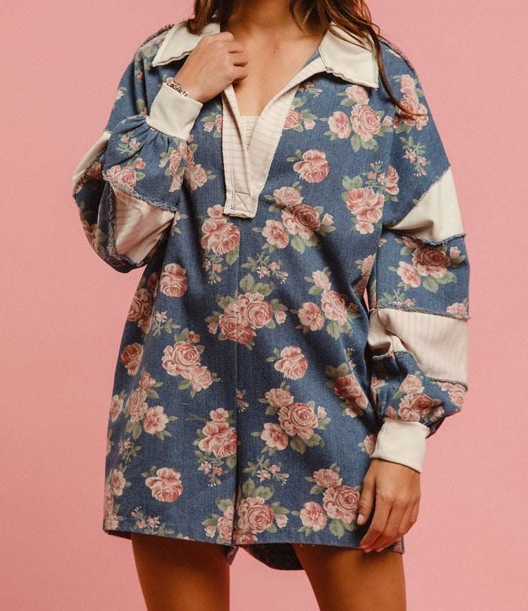 Flaunt your floral flair with this washed denim romper, complete with a contrast collar for a touch of playful sophistication. Perfect for a day out, this romper is sure to turn heads with its unique design and comfortable fit. You'll bloom with confidence in this must-have piece!
