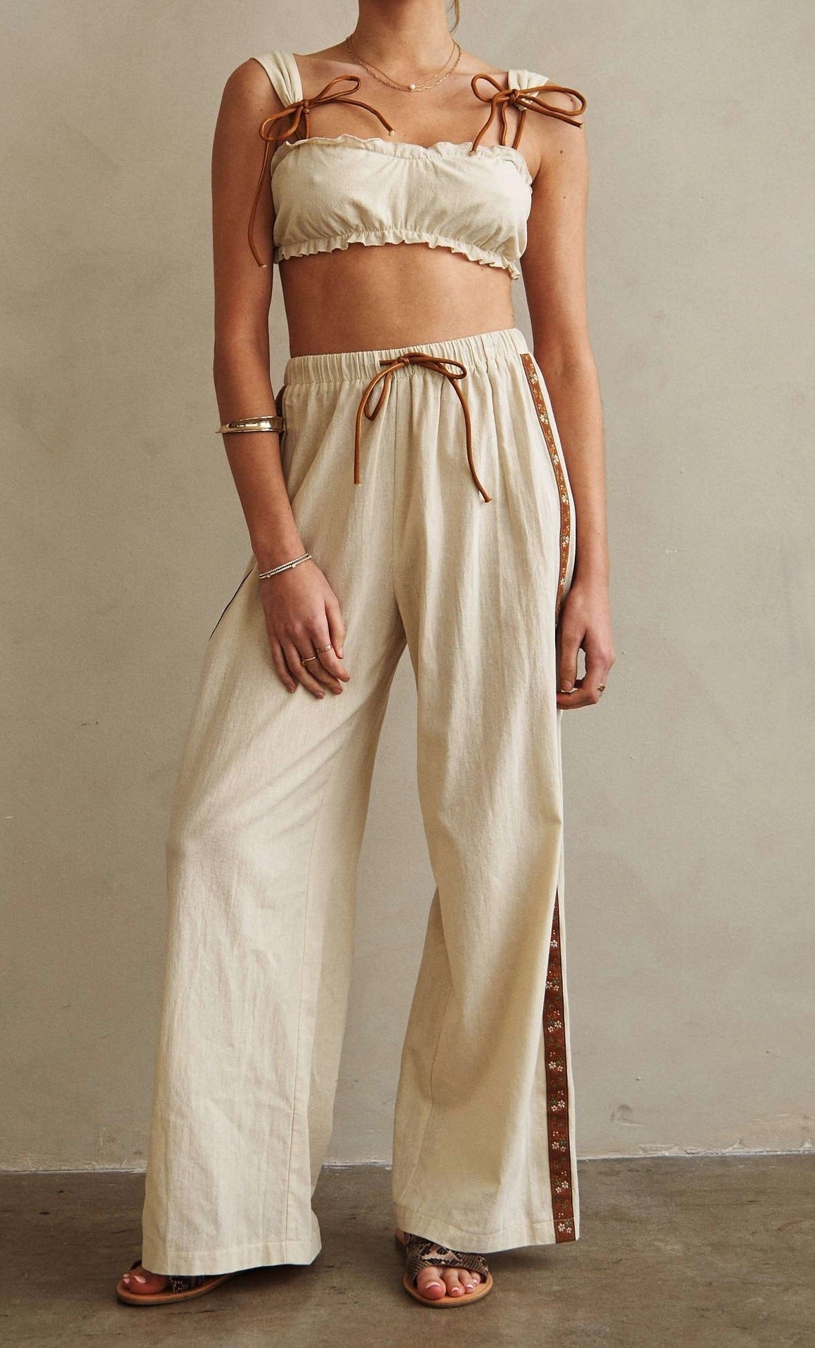 Introducing our elegant Floral Side Stripe Pants. Featuring an elastic tie waist and wide leg design, these pants offer both style and comfort. The delicate floral side stripe adds a touch of luxury and sophistication.