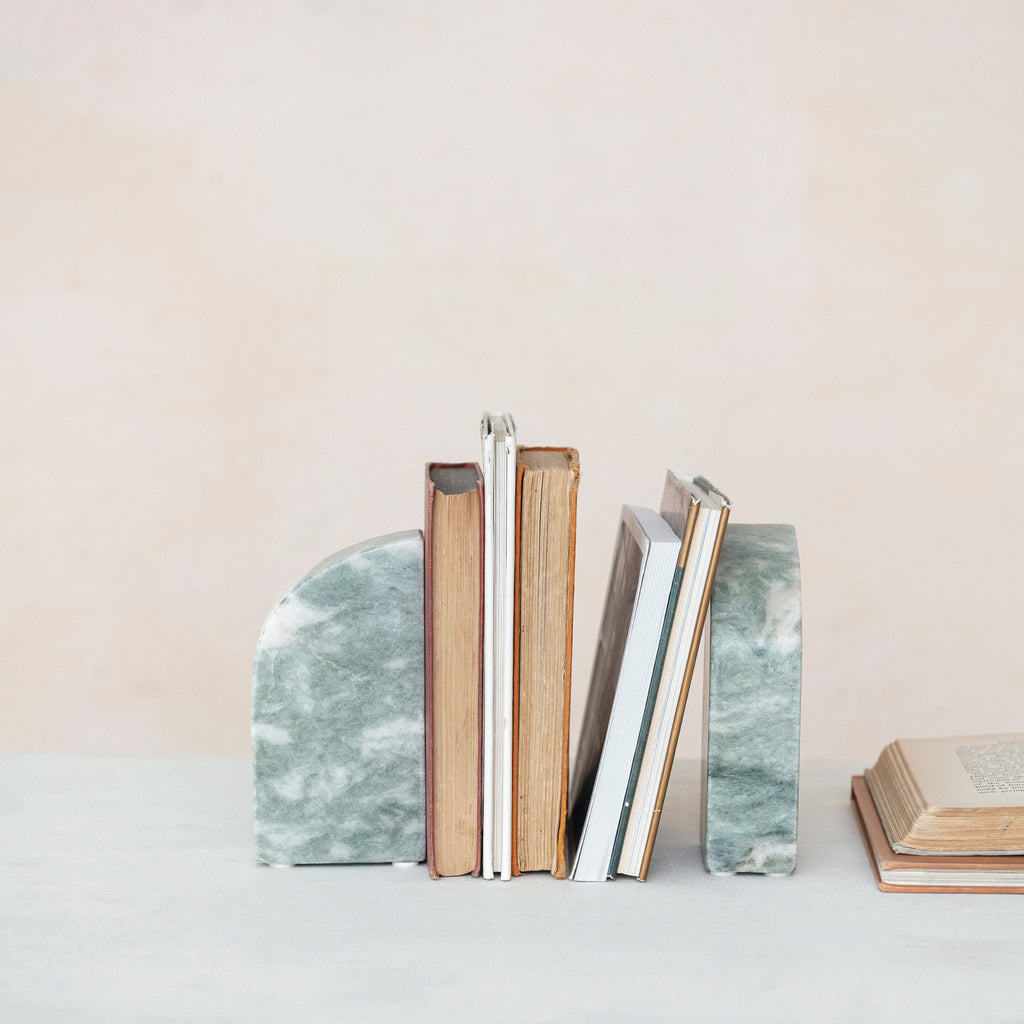 Elevate your space with our Green Half Arch Marble Bookends. The unique shape adds modern artistry and timeless stability to any room. Each bookend stands 6.0 inches tall and spans 6.0 inches, perfectly proportioned to complement your collection. The rich green marble brings a tranquil and luxurious aura, making them a versatile addition to any decor style. Use them as bookends or individual sculptures to enhance your home or office aesthetic.