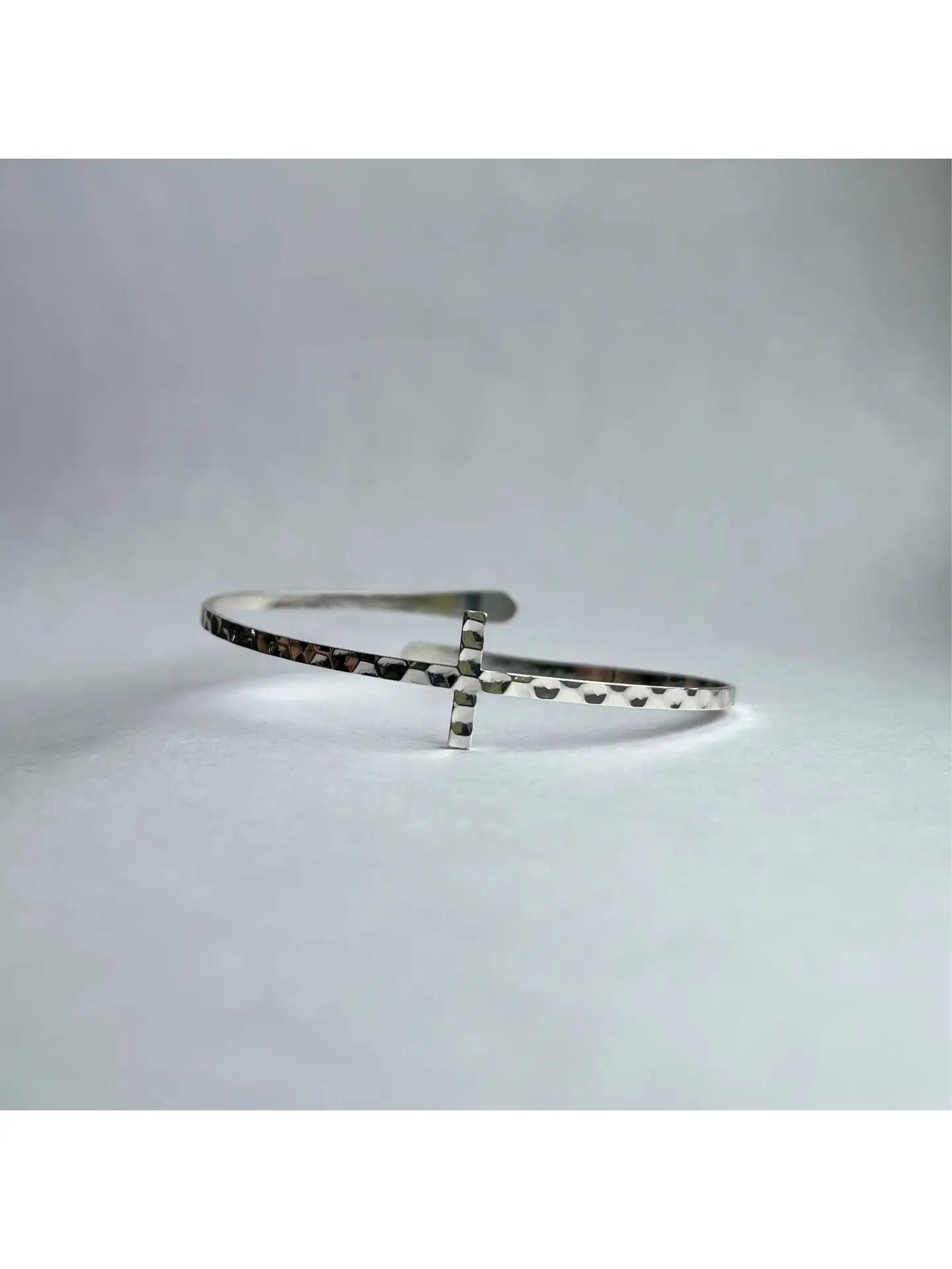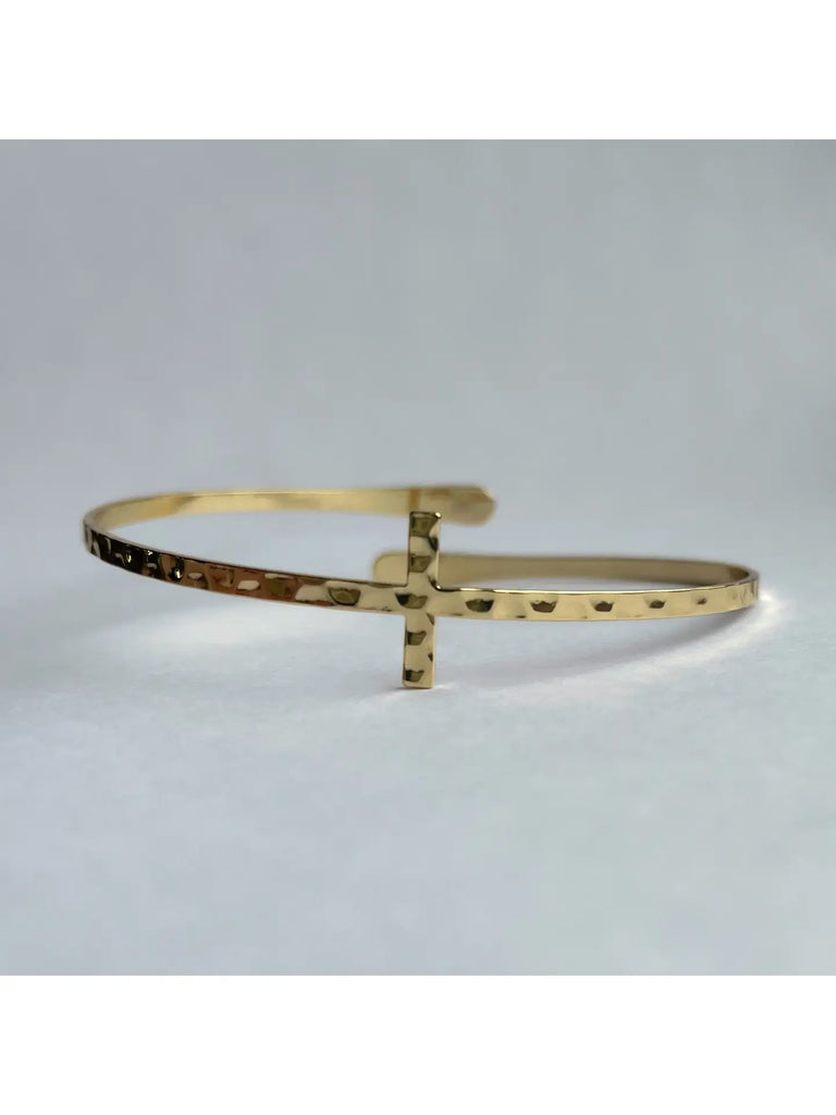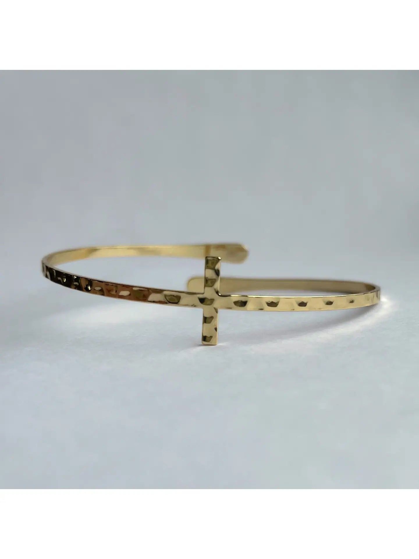Elevate your style and showcase your faith with the Terra Cross Bangle Bracelet. Featuring a cross cascading into the cuff, this lightweight and fashionable bracelet is the perfect accessory for any occasion. A versatile fit for any wrist, it's a must-have for yourself or as a meaningful gift for loved ones. Plus, it's safe for sensitive skin, making it perfect for all-day wear.