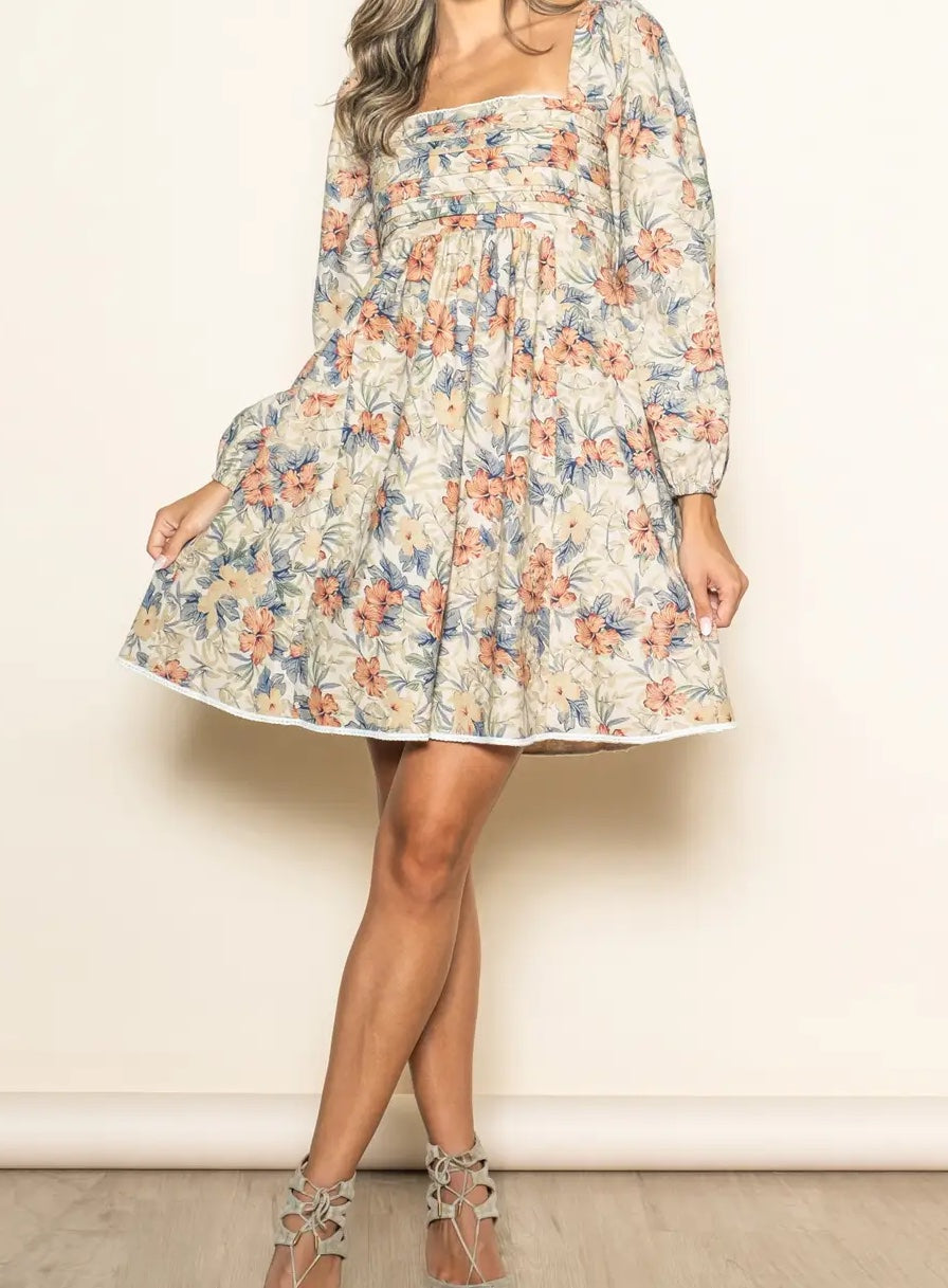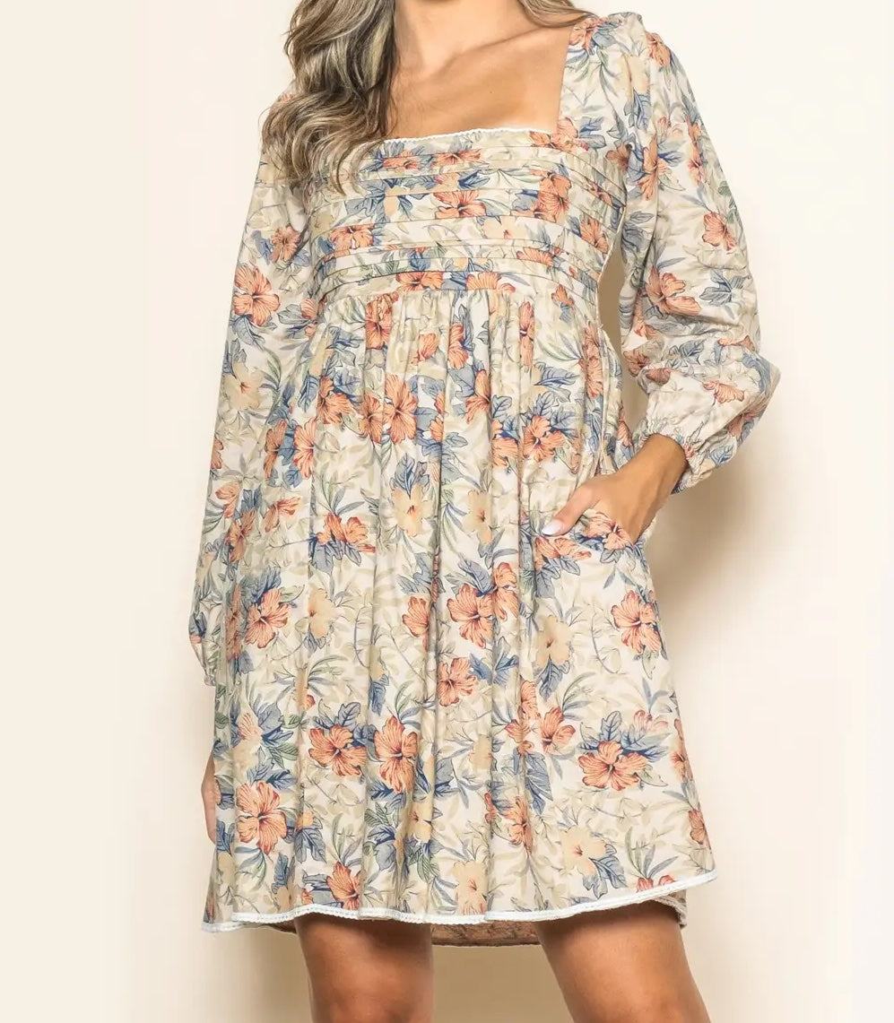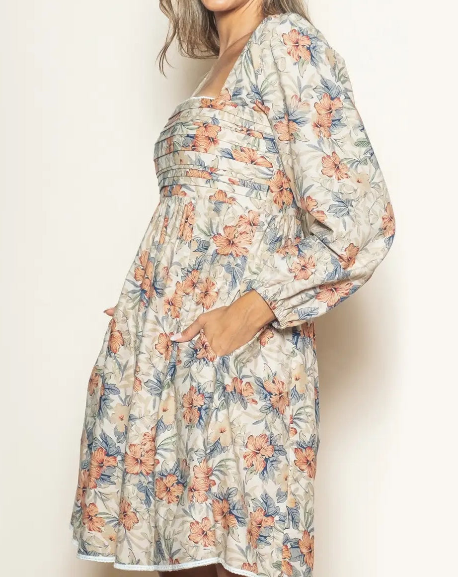 Elevate your style game with this stunning mini dress. The jacquard floral print adds a touch of sophistication and playfulness, while delicate lace accents bring a hint of romance. A flattering silhouette is created by the pleated front bodice, and the smocked back ensures a comfortable and perfect fit. Plus, practical side pockets make this design both fashionable and functional.