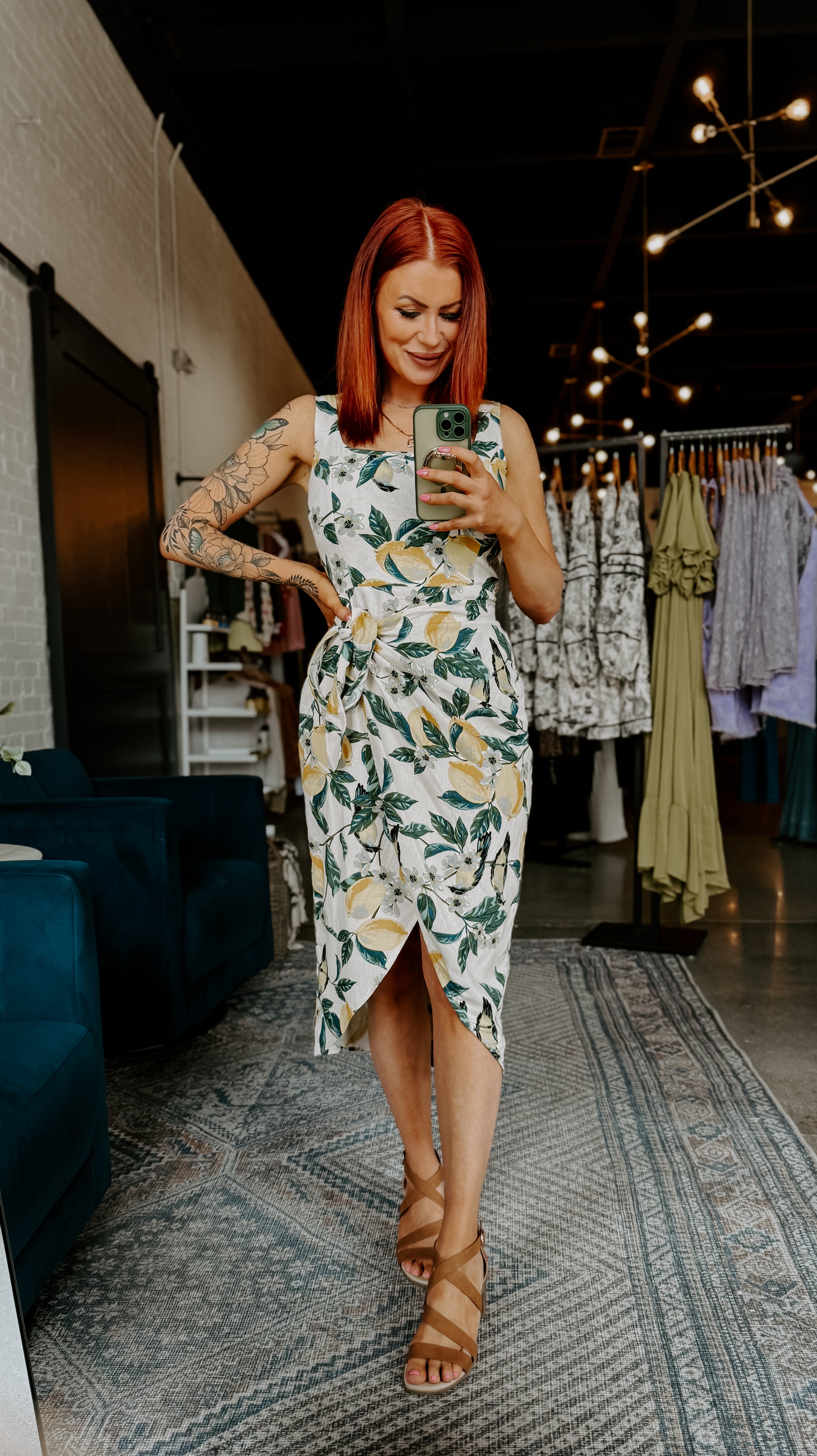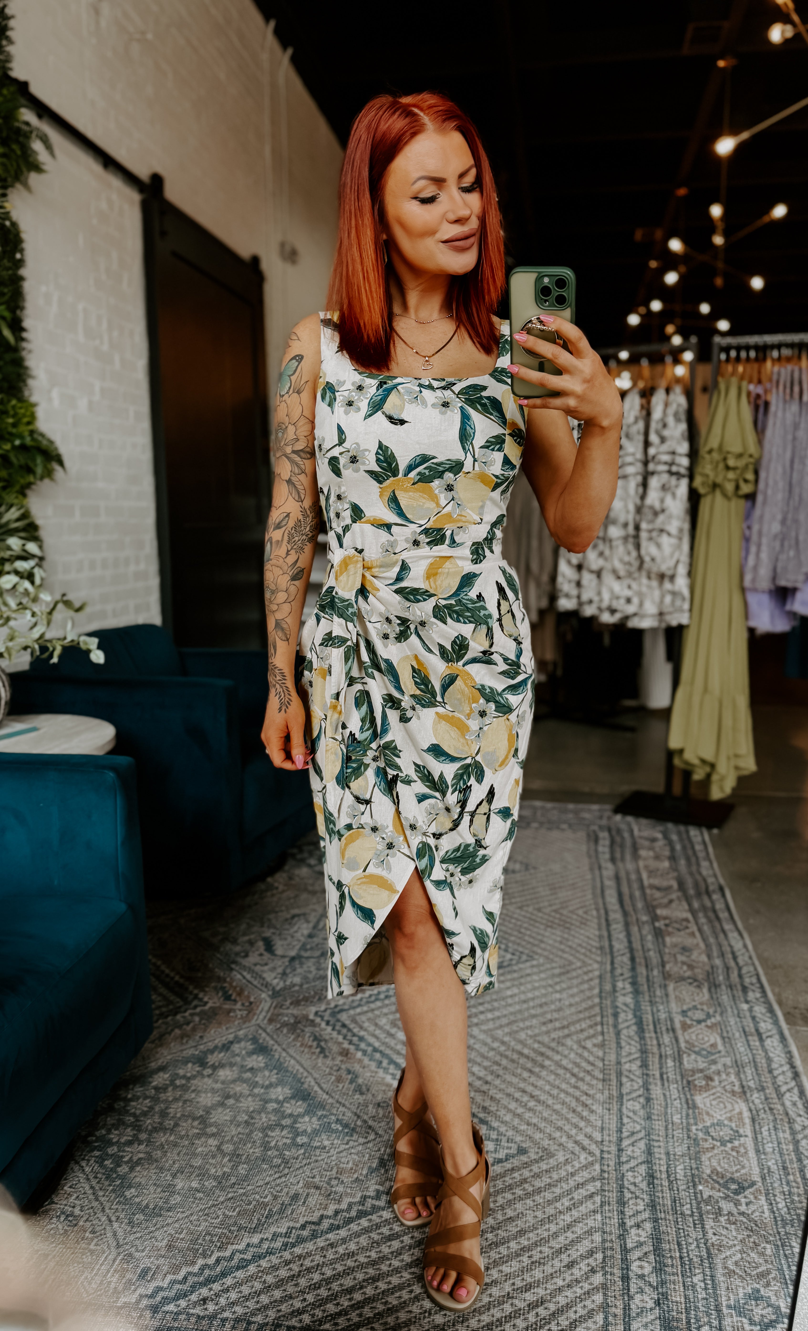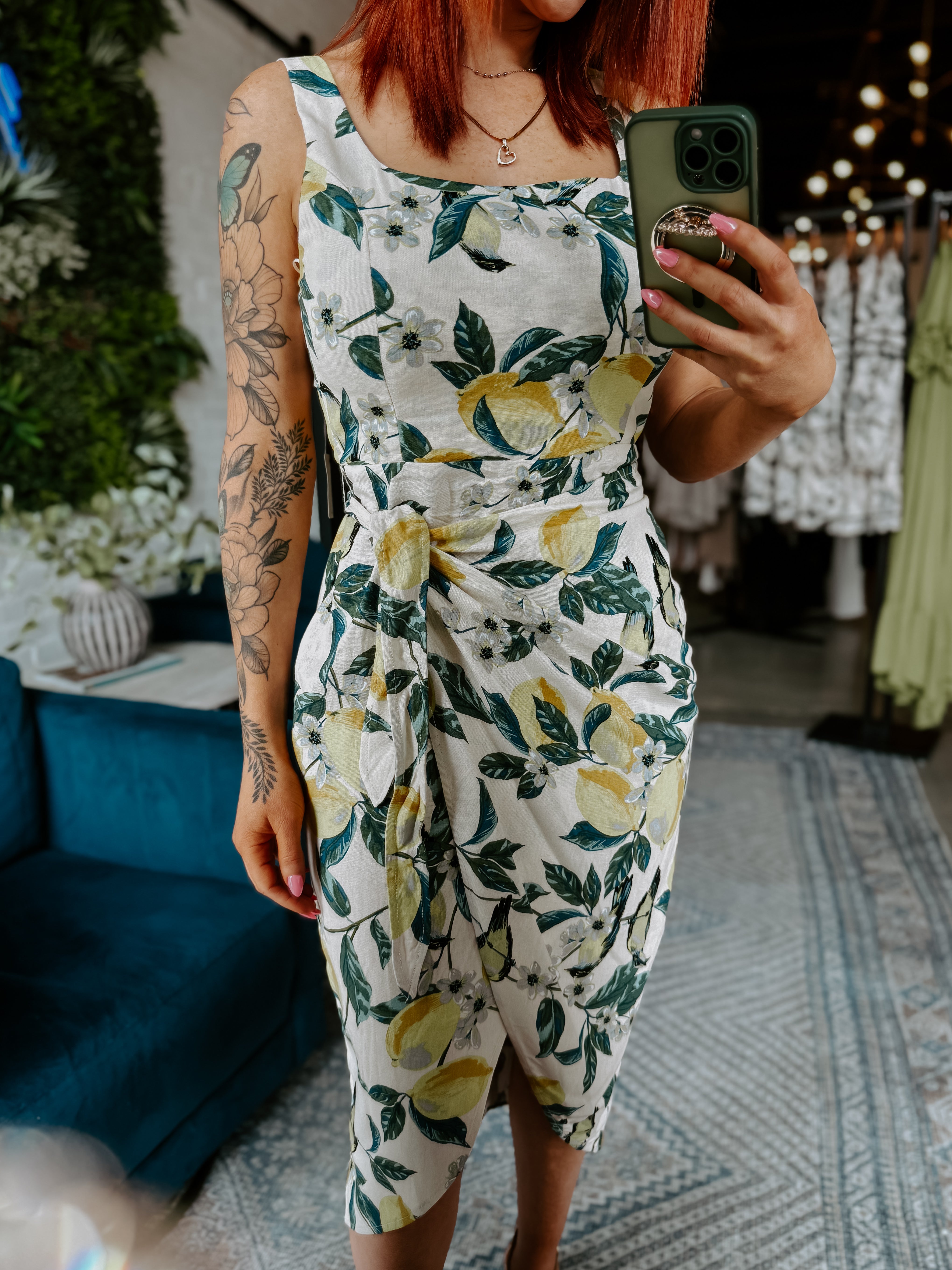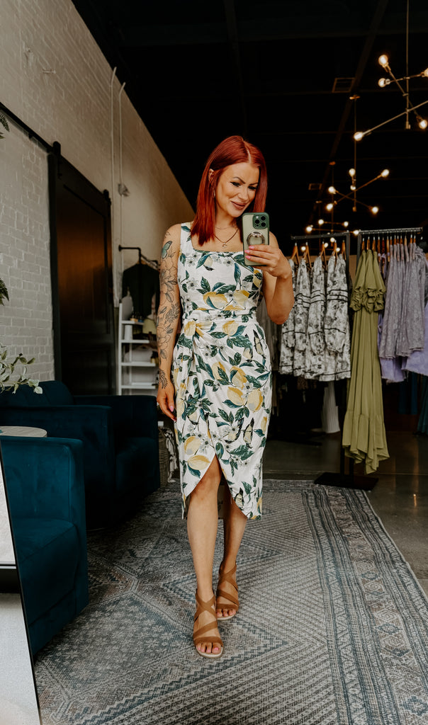 Elevate your wardrobe with our Lemon printed square neck tulip hem midi dress. The vibrant lemon print adds a touch of whimsy to the sophisticated square neckline and elegant tulip hem. Perfect for any occasion, this dress will turn heads and make a statement.