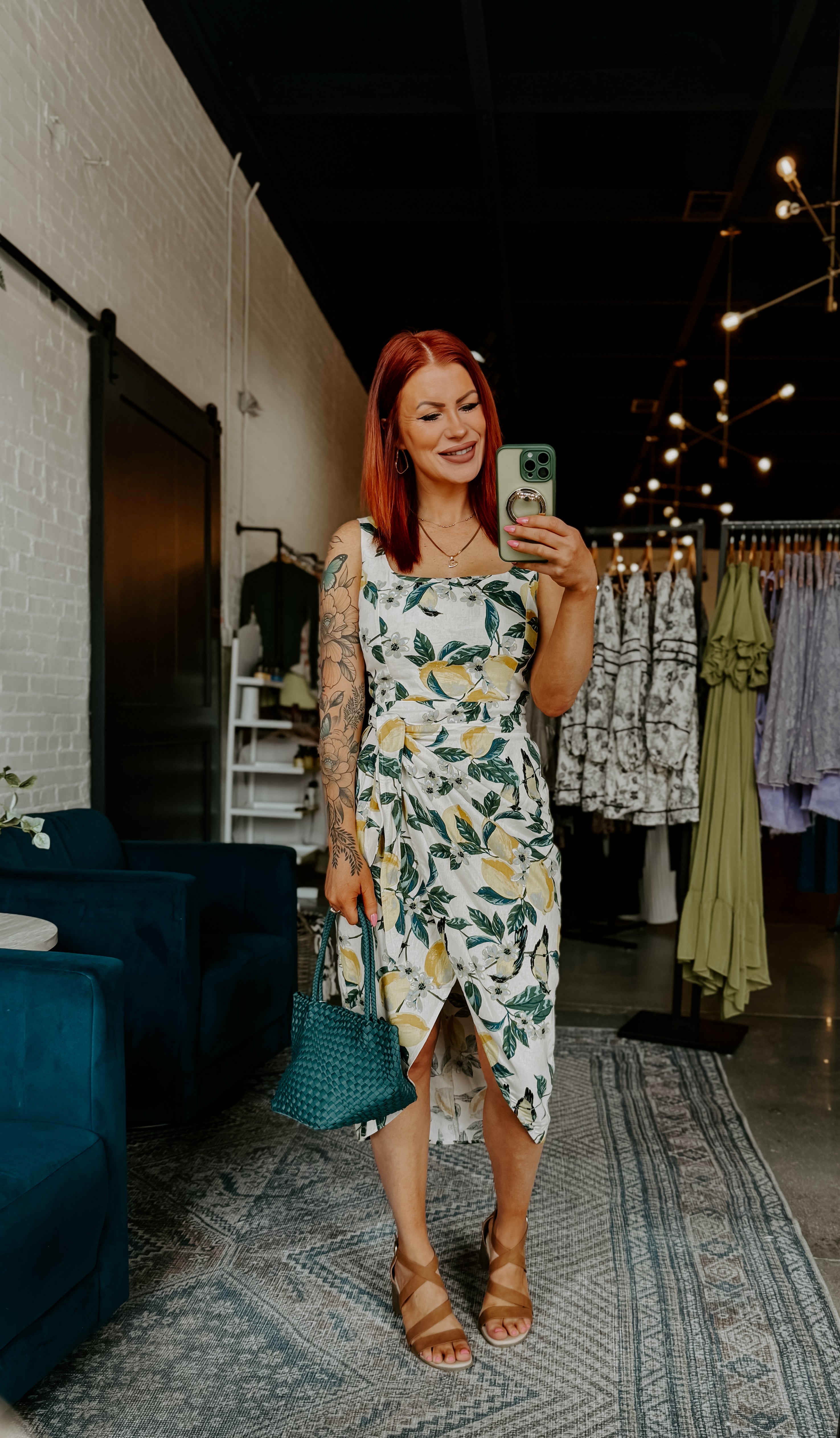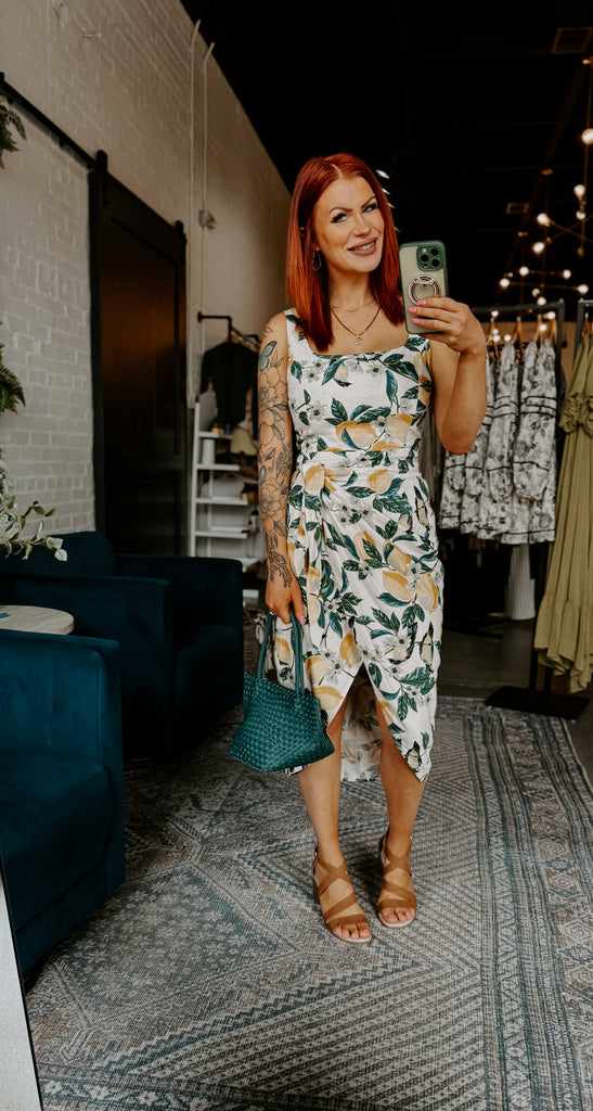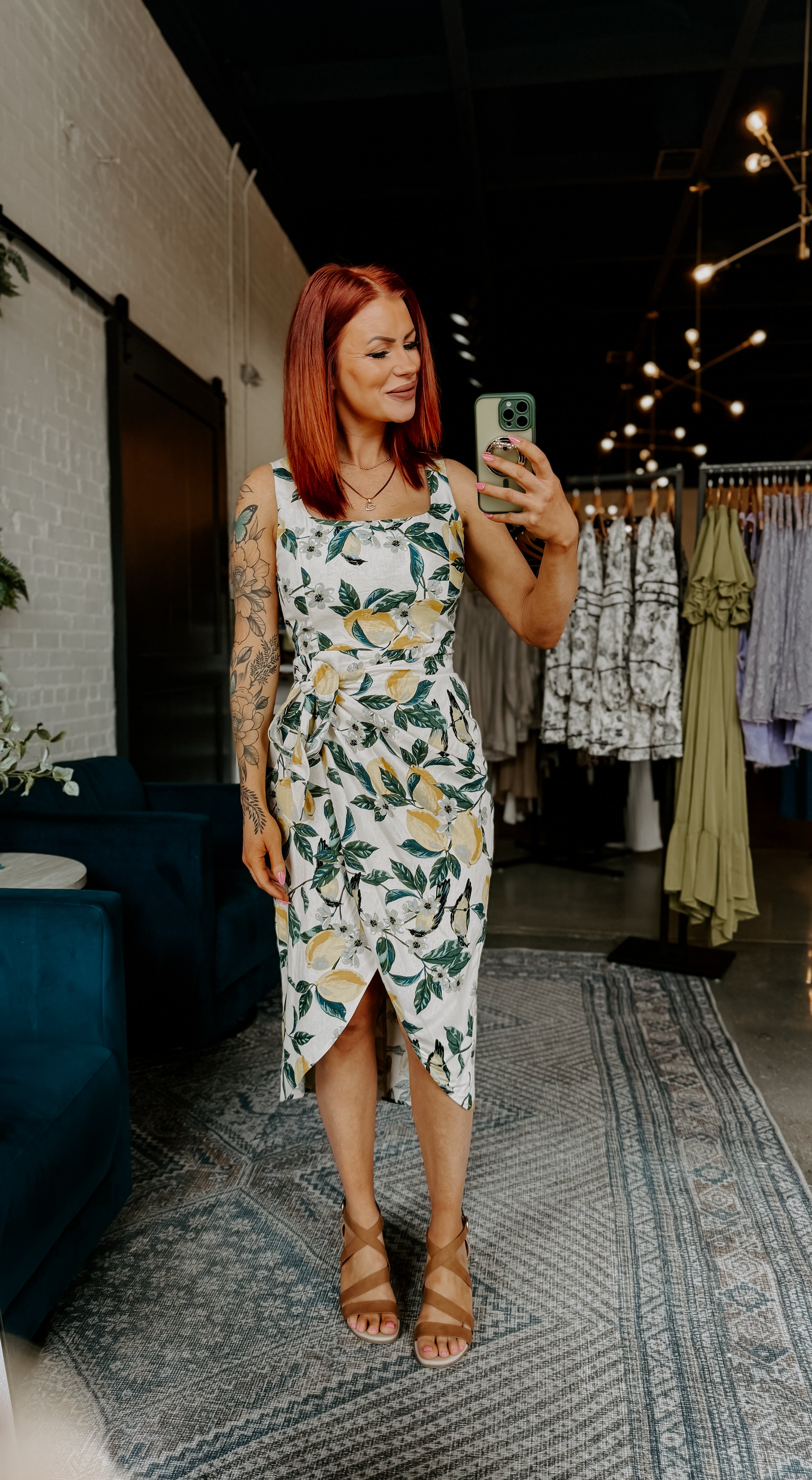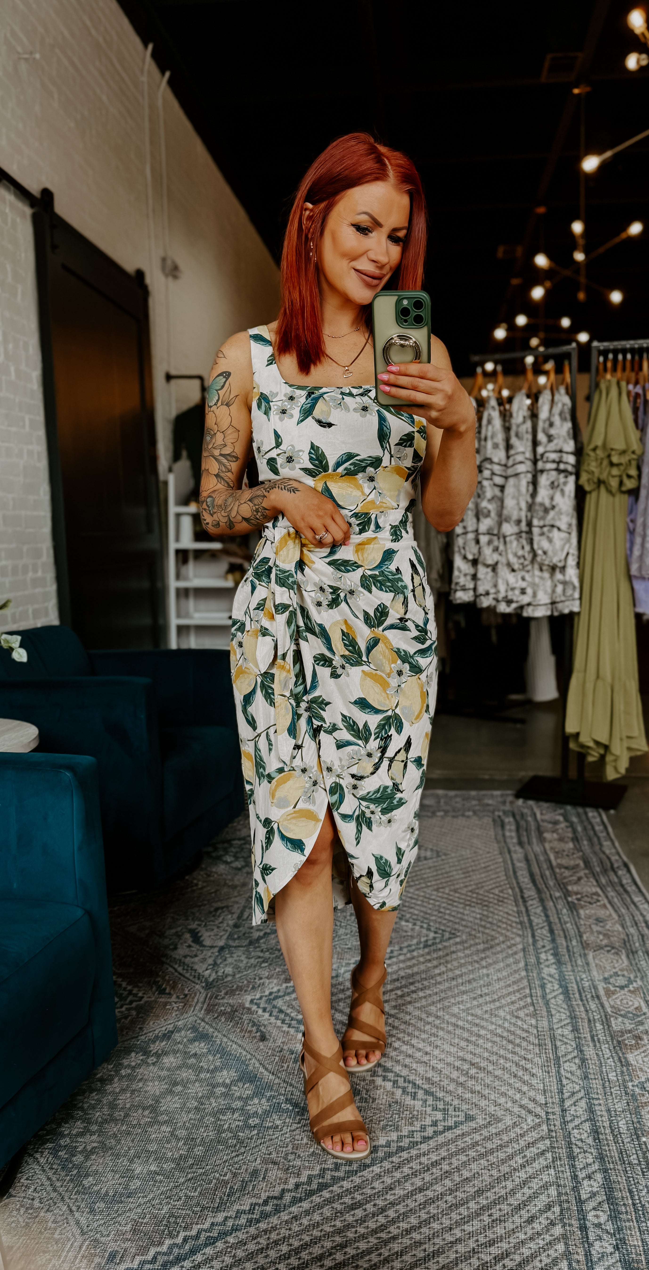 Elevate your wardrobe with our Lemon printed square neck tulip hem midi dress. The vibrant lemon print adds a touch of whimsy to the sophisticated square neckline and elegant tulip hem. Perfect for any occasion, this dress will turn heads and make a statement.