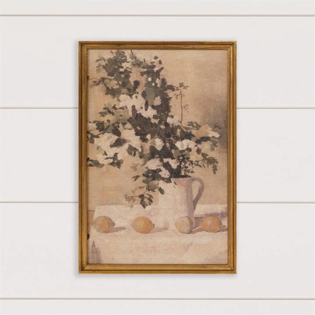 Indulge in the beauty of nature with our Lemon Floral Art. Made from premium wood and canvas, this 18" H x 12" W piece adds a touch of sophistication to any space. Experience the vibrant colors and delicate details of this exclusive piece, perfect for the discerning art collector.